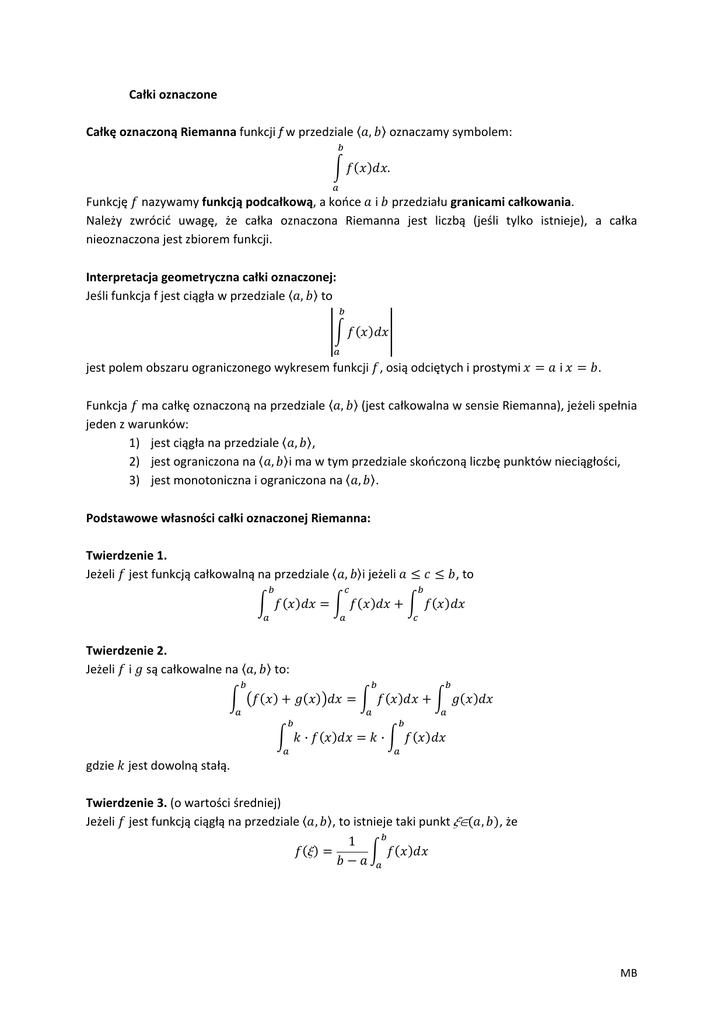 Całki oznaczone Całkę oznaczoną Riemanna funkcji f w przedziale , oznaczamy symbolem: . Funkcję nazywamy funkcją podcałkową, a końce i przedziału granicami całkowania. Należy zwrócić uwagę, że całka oznaczona Riemanna jest liczbą (jeśli tylko istnieje), a całka nieoznaczona jest zbiorem funkcji. Interpretacja geometryczna całki oznaczonej: Jeśli funkcja f jest ciągła w przedziale , to jest polem obszaru ograniczonego wykresem funkcji , osią odciętych i prostymi i . Funkcja ma całkę oznaczoną na przedziale , (jest całkowalna w sensie Riemanna), jeżeli spełnia jeden z warunków: 1) jest ciągła na przedziale , , 2) jest ograniczona na , i ma w tym przedziale skończoną liczbę punktów nieciągłości, 3) jest monotoniczna i ograniczona na , . Podstawowe własności całki oznaczonej Riemanna: Twierdzenie 1. Jeżeli jest funkcją całkowalną na przedziale , i jeżeli , to Twierdzenie 2. Jeżeli i są całkowalne na , to: · gdzie jest dowolną stałą. Twierdzenie 3. (o wartości średniej) Jeżeli jest funkcją ciągłą na przedziale , x · , to istnieje taki punkt xœ , 1 , że MB Całki oznaczone Wyrażenie 1 nazywane jest wartością średnią funkcji f na przedziale , . Twierdzenie 4. Jeżeli jest funkcją całkowalną na przedziale , oraz dla każdego œ , nierówność § § , to: spełniona jest Twierdzenie 5. (wzór na całkowanie przez części) Jeżeli funkcje u i v mają na przedziale , ciągłe pochodne ’ i ’, to: Twierdzenie 6. (wzór na całkowanie przez podstawienie) Jeżeli funkcja jest ciągła na zbiorze wartości funkcji mającej ciągła pochodną ’ na przedziale , b , to: , i jeżeli a Twierdzenie 7. (Newtona‐Lebnitza) Jeżeli jest dowolną funkcją pierwotną funkcji ciągłej na przedziale , , to: Całki niewłaściwe Jeżeli całkujemy funkcję na przedziale nieograniczonym to mówimy o całce niewłaściwej pierwszego rodzaju. Jeżeli funkcja jest całkowalna w sensie Riemanna na przedziale , dla każdego , to jej całkę niewłaściwą na przedziale , ∞ określamy następująco: lim Gdy powyższa granica istnieje i jest właściwa, to całkę nazywamy zbieżną, w przeciwnym wypadku – rozbieżną. Analogicznie definiuje się całkę niewłaściwą funkcji f na przedziale ∞, : lim 2 MB Całki oznaczone Definiując całkę niewłaściwą 1 na przedziale ¶, ¶ , dzielimy ten przedział na dwa dowolne podprzedziały rozpatrujemy osobno całki: i ∞, oraz , ∞ i . Jeżeli obie całki są zbieżne, to mówimy, że całka 1 jest zbieżna, przy czym: Jeżeli przynajmniej jedna z tych całek jest rozbieżna, to mówimy, że całka niewłaściwa jest rozbieżna. Jeżeli funkcja podcałkowa nie jest funkcją ograniczoną w skończonym przedziale całkowania to mówimy o całce niewłaściwej drugiego rodzaju. Jeżeli funkcja jest nieograniczona na lewostronnym sąsiedztwie punktu i całkowalna na przedziale , dla każdego 0 , to jej całkę niewłaściwą na przedziale , określamy jako: lim . Gdy powyższa granica istnieje i jest właściwa, wtedy całkę nazywamy zbieżną, a w przeciwnym wypadku rozbieżną. Analogicznie definiujemy całkę niewłaściwą na przedziale , funkcji nieograniczonej na prawostronnym sąsiedztwie punktu : lim . Jeżeli przedział , zawiera dokładnie jeden punkt œ , , na którego sąsiedztwie funkcja jest nieograniczona, to całkę niewłaściwą funkcji na przedziale , definiujemy następująco: lim lim . Całka ta jest zbieżna, gdy zbieżne są obie całki niewłaściwe. 3 MB