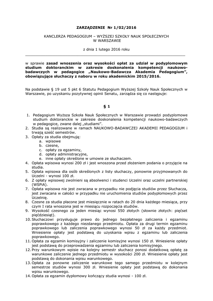 ZARZĄDZENIE Nr 1/02/2016 KANCLERZA PEDAGOGIUM – WYŻSZEJ SZKOŁY NAUK SPOŁECZNYCH W WARSZAWIE z dnia 1 lutego 2016 roku ________________________________________________________________ w sprawie zasad wnoszenia oraz wysokości opłat za udział w podyplomowym studium doktoranckim w zakresie doskonalenia kompetencji naukowobadawczych w pedagogice „Naukowo-Badawcza Akademia Pedagogium”, obowiązujące słuchaczy z naboru w roku akademickim 2015/2016. Na podstawie § 19 ust 5 pkt 6 Statutu Pedagogium Wyższej Szkoły Nauk Społecznych w Warszawie, po uzyskaniu pozytywnej opinii Senatu, zarządza się co następuje: § 1 1. Pedagogium Wyższa Szkoła Nauk Społecznych w Warszawie prowadzi podyplomowe studium doktoranckie w zakresie doskonalenia kompetencji naukowo-badawczych w pedagogice, zwane dalej „studiami”. 2. Studia są realizowane w ramach NAUKOWO-BADAWCZEJ AKADEMII PEDAGOGIUM i trwają sześć semestrów. 3. Opłaty za studia obejmują: a. wpisowe b. czesne, c. opłaty za egzaminy, d. opłaty administracyjne, e. inne opłaty określone w umowie ze słuchaczem. 4. Opłata wpisowa wynosi 200 zł i jest wnoszona przed złożeniem podania o przyjęcie na studia. 5. Opłata wpisowa dla osób skreślonych z listy słuchaczy, ponownie przyjmowanych do Uczelni - wynosi 100 zł. 6. Z opłaty wpisowej zwolnieni są absolwenci i studenci Uczelni oraz uczelni partnerskiej (WSPiA). 7. Opłata wpisowa nie jest zwracana w przypadku nie podjęcia studiów przez Słuchacza, jest zwracana w całości w przypadku nie uruchomienia studiów podyplomowych przez Uczelnię. 8. Czesne za studia płacone jest miesięcznie w ratach do 20 dnia każdego miesiąca, przy czym I rata wnoszona jest w miesiącu rozpoczęcia studiów. 9. Wysokość czesnego za jeden miesiąc wynosi 550 złotych (słownie złotych: pięćset pięćdziesiąt). 10. Słuchaczowi przysługuje prawo do jednego bezpłatnego zaliczenia i egzaminu poprawkowego z każdego niezdanego przedmiotu. Opłata za drugi termin egzaminu poprawkowego lub zaliczenia poprawkowego wynosi 50 zł za każdy przedmiot. Wniesienie opłaty jest podstawą do uzyskania wpisu z egzaminu lub zaliczenia poprawkowego. 11. Opłata za egzamin komisyjny i zaliczenie komisyjne wynosi 150 zł. Wniesienie opłaty jest podstawą do przeprowadzenia egzaminu lub zaliczenia komisyjnego. 12. Przy warunkowym wpisie na kolejny semestr słuchacz ponosi dodatkową opłatę za warunkowe zaliczenie jednego przedmiotu w wysokości 200 zł. Wniesienie opłaty jest podstawą do dokonania wpisu warunkowego. 13. Opłata za ponowne zaliczenie warunkowe tego samego przedmiotu w kolejnym semestrze studiów wynosi 300 zł. Wniesienie opłaty jest podstawą do dokonania wpisu warunkowego. 14. Opłata za egzamin dyplomowy kończący studia wynosi - 100 zł. 15. Opłata za przesunięcie terminu egzaminu dyplomowego na wniosek studenta wynosi 100 zł. 16. Opłata za egzamin dyplomowy w drugim terminie wynosi 200 zł (w przypadku niestawienia się na pierwszy termin). 17. Opłata za poprawkowy egzamin dyplomowy wynosi 200 zł. 18. Wszystkie opłaty za egzaminy wnoszone są nie później niż na 7 dni przed przystąpieniem do egzaminu. 19. Uczelnia pobiera opłaty: a. za wydanie karty słuchacza – 10 zł (opłata wliczona w wpisowe), b. za wydanie duplikatu karty słuchacza – 15 zł, c. za wydanie świadectwa ukończenia studiów podyplomowych – 30 zł, d. za wydanie duplikatu świadectwa ukończenia studiów podyplomowych – 45 zł, 20. Osoba przyjęta na studia w trakcie trwania semestru uiszcza opłatę za cały semestr. Raty, których termin płatności upłynął przed przyjęciem na studia należy uiścić w terminie 7 dni od podpisania umowy. 21. Obowiązek uiszczania opłat związanych z pobieraniem nauki wygasa od pierwszego dnia następnego miesiąca po złożeniu przez Słuchacza rezygnacji z pobierania nauki lub po skreśleniu z listy Słuchaczy. 22. Słuchacz jest zobowiązany do przedkładania, na każde żądanie Uczelni, dowodów wpłaty uiszczenia wszystkich należności objętych niniejszym regulaminem. §2 1. Z każdym słuchaczem studium podyplomowego zawierana jest umowa regulująca zasady wnoszenia odpłatności za studia. 2. Słuchacz zobowiązuje się do wnoszenia opłat na indywidualny numer rachunku, w którym 11 ostatnich cyfr odpowiada numerowi PESEL Słuchacza, założony na koncie bankowym Uczelni lub na wyodrębnionym subkoncie Partnera (WSPiA). 3. Za datę dokonania wpłaty przyjmuje się datę wpływu należności na rachunek bankowy Uczelni lub Partnera (WSPiA). 4. Zwłoka w opłacie czesnego przekraczająca 30 dni kalendarzowych jest podstawą do skreślenia z listy słuchaczy, po uprzednim pisemnym wezwaniu Słuchacza do uregulowania zaległości. 5. W przypadku zwłoki w zapłacie należności, od niezapłaconej w terminie kwoty naliczane będą odsetki w wysokości 15 % w stosunku rocznym. §3 Słuchacz zobowiązuje się powiadomić na piśmie Uczelnię o zmianie jego danych osobowych zawartych w umowie, o której mowa w § 2 ust.1. Skutki zaniechania spełnienia tego obowiązku obciążają Słuchacza. §4 1. W przypadku nieuregulowania przez Słuchacza opłat Uczelnia zastrzega sobie prawo sprzedaży wierzytelności z tego tytułu podmiotowi zajmującemu się profesjonalną windykacją należności. 2. Słuchacz wyraża zgodę na przetwarzanie jego danych osobowych zgodnie z ustawą z dnia 29 sierpnia 1997 r. o ochronie danych osobowych (Dz. U. z 2002 r. Nr 101, poz. 926, z późn. zm.) przez Uczelnię lub podmiot wymieniony w ust. 1 w celu dochodzenia roszczeń z tytułu nieuregulowanych opłat za studia podyplomowe. §2 Zarządzenie wchodzi w życie z dniem podpisania.