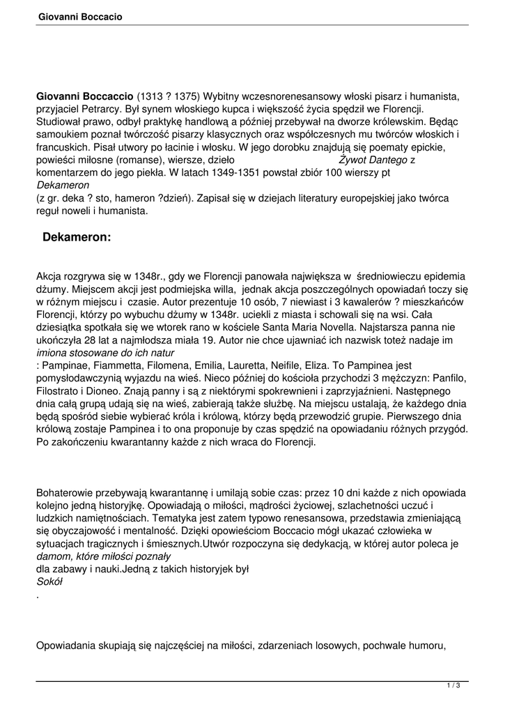 Giovanni Boccacio Giovanni Boccaccio (1313 ? 1375) Wybitny wczesnorenesansowy włoski pisarz i humanista, przyjaciel Petrarcy. Był synem włoskiego kupca i większość życia spędził we Florencji. Studiował prawo, odbył praktykę handlową a później przebywał na dworze królewskim. Będąc samoukiem poznał twórczość pisarzy klasycznych oraz współczesnych mu twórców włoskich i francuskich. Pisał utwory po łacinie i włosku. W jego dorobku znajdują się poematy epickie, powieści miłosne (romanse), wiersze, dzieło Żywot Dantego z komentarzem do jego piekła. W latach 1349-1351 powstał zbiór 100 wierszy pt Dekameron (z gr. deka ? sto, hameron ?dzień). Zapisał się w dziejach literatury europejskiej jako twórca reguł noweli i humanista. Dekameron: Akcja rozgrywa się w 1348r., gdy we Florencji panowała największa w średniowieczu epidemia dżumy. Miejscem akcji jest podmiejska willa, jednak akcja poszczególnych opowiadań toczy się w różnym miejscu i czasie. Autor prezentuje 10 osób, 7 niewiast i 3 kawalerów ? mieszkańców Florencji, którzy po wybuchu dżumy w 1348r. uciekli z miasta i schowali się na wsi. Cała dziesiątka spotkała się we wtorek rano w kościele Santa Maria Novella. Najstarsza panna nie ukończyła 28 lat a najmłodsza miała 19. Autor nie chce ujawniać ich nazwisk toteż nadaje im imiona stosowane do ich natur : Pampinae, Fiammetta, Filomena, Emilia, Lauretta, Neifile, Eliza. To Pampinea jest pomysłodawczynią wyjazdu na wieś. Nieco później do kościoła przychodzi 3 mężczyzn: Panfilo, Filostrato i Dioneo. Znają panny i są z niektórymi spokrewnieni i zaprzyjaźnieni. Następnego dnia całą grupą udają się na wieś, zabierają także służbę. Na miejscu ustalają, że każdego dnia będą spośród siebie wybierać króla i królową, którzy będą przewodzić grupie. Pierwszego dnia królową zostaje Pampinea i to ona proponuje by czas spędzić na opowiadaniu różnych przygód. Po zakończeniu kwarantanny każde z nich wraca do Florencji. Bohaterowie przebywają kwarantannę i umilają sobie czas: przez 10 dni każde z nich opowiada kolejno jedną historyjkę. Opowiadają o miłości, mądrości życiowej, szlachetności uczuć i ludzkich namiętnościach. Tematyka jest zatem typowo renesansowa, przedstawia zmieniającą się obyczajowość i mentalność. Dzięki opowieściom Boccacio mógł ukazać człowieka w sytuacjach tragicznych i śmiesznych.Utwór rozpoczyna się dedykacją, w której autor poleca je damom, które miłości poznały dla zabawy i nauki.Jedną z takich historyjek był Sokół . Opowiadania skupiają się najczęściej na miłości, zdarzeniach losowych, pochwale humoru, 1/3 Giovanni Boccacio mądrości i sprytu, potępienie słabostek ludzi bogatych, zwycięstwo cnoty. Bohaterami są ludzie różnych stanów i zawodów: rzemieślnicy, arystokraci, złodzieje, królowie, zakonnicy, duchy. Najważniejszą wartością pozostaje jednak miłość, która bywa frywolna i zmysłowa a także wzniosła i poważna. Kobiety są najczęściej młode i piękne, damy są szlachetne i wzniosłe, skłonne do flirtu i figlów. Mimo, że charakterystyki postaci są krótkie to bardzo trafne, przedstawiają ich najważniejsze cechy. Inspirację dla Boccaciego stanowiły anegdoty krążące po Florencji, pieśni trubadurów , opowieści arabskie czy relacje podróżników. Przez co nowele opisują ludzi współczesnych, przeżycia miłosne, co zapewniło im popularność ale także fakt, że znalazły się w indeksie ksiąg zakazanych. Sokół: Gatunek: nowela ? utwór epicki o zwartej akcji, w której centralny motyw często umieszczonym jest w tytule, pojawia się potem w każdej fazie fabuły. To utwór o małej ilości postaci, pozbawiony opisów, komentarzy i bezpośredniej charakterystyki. Budowa typowa dla dramatu: wstęp, zawiązanie (rozwinięcie) akcji, punkt kulminacyjny, zakończenie. Wydarzenie poukładane chronologicznie, powikłania tragiczne, Dominuje narracja, mało dialogów, Wyraźne zakończenie, puenta. Występuje tzw. sokół noweli Sokół noweli ? motyw wokół którego skupiają się wszystkie wątki akcji. Nowela Sokół jest klasycznym wzorem tego gatunku. Od jej tytułu teorię dotyczącą charakteru noweli nazywa się teorią sokoła. To teoria klasycznie skomponowanej noweli, w której istotny dla danego utworu motyw występuje w każdej fazie fabuły. O Sokole: Historię o sokole opowiada Fiammetta, która była królową piątego dnia pobytu i opowiadała tego dnia dziewiątą historię. We Florencji mieszkał stary człowiek imieniem Coppo di Borhese Domenichi, który słynął z opowiadania znajomym różnych historyjek. Jedną z nich była opowieść o najodważniejszym florenckim rycerzu Federigo delgli Alberighi, który zakochał się w najpiękniejszej damie w mieście Monnie Giovannie. Plan wydarzeń Sokoła: 2/3 Giovanni Boccacio 1. Młody włoski szlachcic Federigo zakochuje się bez wzajemności w zamężnej damie florenckiej Monnie Giavannie, która słynęła z dobrego serca i wierności mężowi. 2. Roztrwonienie majątku przez Federiga na wystawne uczty urządzane ku czci ukochanej, obdarowuje Monnę drogimi prezentami. 3. Zrezygnowany i zubożały młodzieniec zamieszkuje na prowincji i utrzymuje się z polowań z sokołem 4. Spisanie testamentu, śmierć męża Monny 5. Wyjazd Monny i jej syna do posiadłości, położonej blisko siedziby Federiga 6. Przyjaźń Federiga i syna Monny. Chłopiec marzy o pięknym sokole, którego właścicielem jest sąsiad 7. Choroba syna Monny 8. Matka udaje się w gościnę do sąsiada aby zdobyć ptaka 9. Federigo nie mając co podać gościowi zabija sokoła i gotuje z niego potrawę na obiad 10. Wyznanie prawdy przez Federgia o sokole 11. Śmierć syna Monny 12. Związek Federiga i Monny, którą wzruszyło postępowanie sąsiada Wnioski: - Monna pocztowo nie kochała Federiga. Poświęcił przyjaciela (sokoła) dla kobiety.