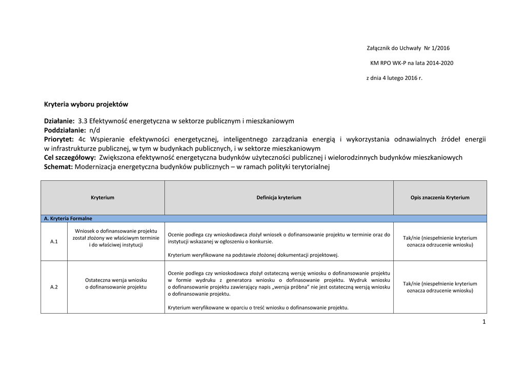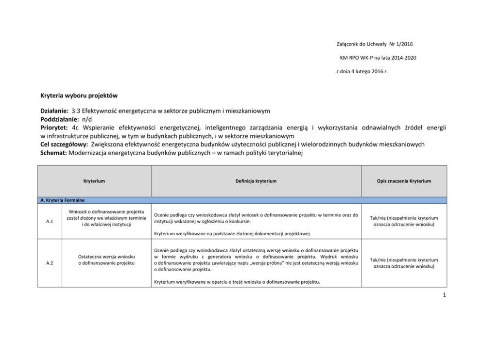 Załącznik do Uchwały Nr 1/2016 KM RPO WK-P na lata 2014-2020 z dnia 4 lutego 2016 r. Kryteria wyboru projektów Działanie: 3.3 Efektywność energetyczna w sektorze publicznym i mieszkaniowym Poddziałanie: n/d Priorytet: 4c Wspieranie efektywności energetycznej, inteligentnego zarządzania energią i wykorzystania odnawialnych źródeł energii w infrastrukturze publicznej, w tym w budynkach publicznych, i w sektorze mieszkaniowym Cel szczegółowy: Zwiększona efektywność energetyczna budynków użyteczności publicznej i wielorodzinnych budynków mieszkaniowych Schemat: Modernizacja energetyczna budynków publicznych – w ramach polityki terytorialnej Kryterium Definicja kryterium Opis znaczenia Kryterium A. Kryteria Formalne A.1 Wniosek o dofinansowanie projektu został złożony we właściwym terminie i do właściwej instytucji Ocenie podlega czy wnioskodawca złożył wniosek o dofinansowanie projektu w terminie oraz do instytucji wskazanej w ogłoszeniu o konkursie. Tak/nie (niespełnienie kryterium oznacza odrzucenie wniosku) Kryterium weryfikowane na podstawie złożonej dokumentacji projektowej. A.2 Ostateczna wersja wniosku o dofinansowanie projektu Ocenie podlega czy wnioskodawca złożył ostateczną wersję wniosku o dofinansowanie projektu w formie wydruku z generatora wniosku o dofinasowanie projektu. Wydruk wniosku o dofinansowanie projektu zawierający napis „wersja próbna” nie jest ostateczną wersją wniosku o dofinansowanie projektu. Tak/nie (niespełnienie kryterium oznacza odrzucenie wniosku) Kryterium weryfikowane w oparciu o treść wniosku o dofinansowanie projektu. 1 B. Kryteria merytoryczne – ogólne B.1 Kwalifikowalność wnioskodawcy/ partnerów Ocenie podlega czy wniosek został złożony przez uprawnionego wnioskodawcę tj.: - jednostkę samorządu terytorialnego, samorządową jednostkę organizacyjną, związek lub stowarzyszenie jednostek samorządu terytorialnego; - inną jednostkę sektora finansów publicznych; - przedsiębiorstwo komunalne; - organizację pozarządową; - kościół lub związek wyznaniowy lub osobę prawną kościoła lub związku wyznaniowego; - podmiot leczniczy udzielający świadczeń opieki zdrowotnej finansowanych ze środków 1 publicznych , - partnera prywatnego we współpracy z podmiotem publicznym w przypadku projektu realizowanego w formule partnerstwa publiczno-prywatnego Tak/nie (niespełnienie kryterium oznacza odrzucenie wniosku) Kryterium weryfikowane w oparciu o treść wniosku o dofinansowanie projektu oraz treść załączników. B.2 Prawidłowość wyboru partnerów uczestniczących/ realizujących projekt Ocenie podlega czy wnioskodawca dokonał wyboru partnera/ów zgodnie z przepisami ustawy z dnia 11 lipca 2014 r. o zasadach realizacji programów w zakresie polityki spójności finansowanych w perspektywie 2014-2020 (Dz. U. poz. 1146 ze zm.). Tak/nie/nie dotyczy (niespełnienie kryterium oznacza odrzucenie wniosku)/ Kryterium weryfikowane w oparciu o treść oświadczenia wnioskodawcy stanowiącego integralną część wniosku o dofinansowanie projektu. 1 z wyłączeniem szpitali, których dotyczy wymóg objęcia mapą potrzeb zdrowotnych. 2 B.3 Niepodleganie wykluczeniu z możliwości otrzymania dofinansowania ze środków Unii Europejskiej Ocenie podlega czy wnioskodawca oraz partnerzy (jeśli dotyczy) nie podlegają wykluczeniu z możliwości ubiegania się o dofinansowanie oraz że nie są objęci zakazem dostępu do środków funduszy europejskich na podstawie: - art. 207 ust. 4 ustawy z dnia 27 sierpnia 2009 r. o finansach publicznych (Dz. U. z 2013 r. poz. 885 ze zm.), - art. 12 ust. 1 pkt 1 ustawy z dnia 15 czerwca 2012 r. o skutkach powierzania wykonywania pracy cudzoziemcom przebywającym wbrew przepisom na terytorium Rzeczypospolitej Polskiej (Dz. U. poz. 769), - art. 9 ust. 1 pkt 2a ustawy z dnia 28 października 2002 r. o odpowiedzialności podmiotów zbiorowych za czyny zabronione pod groźbą kary (tekst jednolity: Dz. U. z 2015 r. poz. 1212). Tak/nie (niespełnienie kryterium oznacza odrzucenie wniosku) Kryterium będzie weryfikowane w oparciu o treść oświadczenia wnioskodawcy stanowiącego integralną część wniosku o dofinansowanie projektu. B.4 Miejsce realizacji projektu Ocenie podlega czy projekt realizowany jest na terytorium województwa kujawsko-pomorskiego 2 (art. 70 Rozporządzenia 1303/2013 z dnia 17 grudnia 2013 r. Tak/nie (niespełnienie kryterium oznacza odrzucenie wniosku) Kryterium weryfikowane w oparciu o treść wniosku o dofinansowanie projektu. B.5 Gotowość techniczna projektu do realizacji Ocenie podlega czy na moment złożenia wniosku o dofinansowanie projektu złożony został wniosek o wydanie decyzji zezwalającej na realizację projektu (jeśli dotyczy) lub wnioskodawca dokonał zgłoszenia budowy (jeśli dotyczy). Tak/nie/nie dotyczy (niespełnienie kryterium oznacza odrzucenie wniosku) Kryterium weryfikowane w oparciu o treść załącznika nr 4 do wniosku o dofinansowanie projektu. B.6 Załączniki do wniosku o dofinansowanie są kompletne, poprawne i zgodne z przepisami prawa polskiego i unijnego oraz wymogami Instytucji Zarządzającej RPO WK-P Ocenie podlega czy wnioskodawca projektu dołączył do wniosku o dofinansowanie projektu wszystkie załączniki zgodnie z listą załączników zamieszczoną w regulaminie konkursu oraz czy załączniki do wniosku o dofinansowanie projektu są zgodne z przepisami prawa polskiego i unijnego oraz z Instrukcją wypełniania załączników do wniosku o dofinansowanie projektu Tak/nie (niespełnienie kryterium oznacza odrzucenie wniosku) 2 Rozporządzenie 1303/2013 z dnia 17 grudnia 2013 r ustanawiające wspólne przepisy dotyczące Europejskiego Funduszu Rozwoju Regionalnego, Europejskiego Funduszu Społecznego, Funduszu Spójności, Europejskiego Funduszu Rolnego na rzecz Rozwoju Obszarów Wiejskich oraz Europejskiego Funduszu Morskiego i Rybackiego oraz ustanawiającego przepisy ogólne dotyczące 