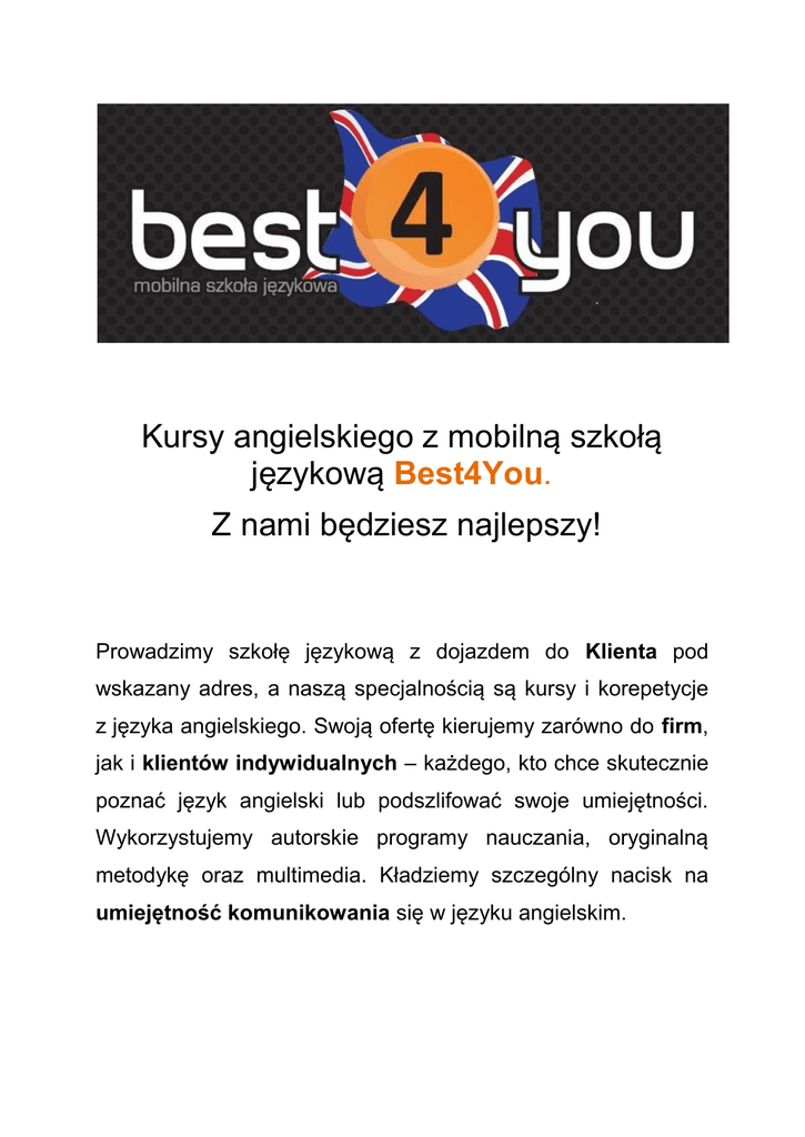 Kursy angielskiego z mobilną szkołą językową Best4You. Z nami będziesz najlepszy! Prowadzimy szkołę językową z dojazdem do Klienta pod wskazany adres, a naszą specjalnością są kursy i korepetycje z języka angielskiego. Swoją ofertę kierujemy zarówno do firm, jak i klientów indywidualnych – każdego, kto chce skutecznie poznać język angielski lub podszlifować swoje umiejętności. Wykorzystujemy autorskie programy nauczania, oryginalną metodykę oraz multimedia. Kładziemy szczególny nacisk na umiejętność komunikowania się w języku angielskim. Angielski dla firm Szanowni Państwo, zdajemy sobie sprawę, iż są Państwo zbyt zajęci, aby przychodzić na zajęcia do stacjonarnej szkoły językowej. Rozumiemy również, iż specjaliści na wysokich stanowiskach muszą znać język, jednakże nie mają możliwości w tradycyjnych dopasowania szkołach się do językowych. W sztywnego związku planu z zajęć niniejszym proponowany przez nas elastyczny tryb nauczania z dojazdem do Klienta jest idealnym rozwiązaniem dla Państwa. Dostosujemy się do Państwa potrzeb w zakresie harmonogramu zajęć i ich intensywności, a lektorzy BEST 4 YOU przeprowadzą zajęcia w Państwa firmie. Opracujemy optymalny profil szkoleń, a także zapewnimy właściwą opiekę metodyczną. Kładziemy szczególny komunikowania się w nacisk na języku podwyższenie obcym niezależnie umiejętności od poziomu i metodę zaawansowania. Jesteśmy elastyczni, więc program dostosujemy do Państwa potrzeb. nauczania Proponujemy Państwu różnorodne kursy, z których mogą Państwo wybrać optymalny dla siebie profil nauczania: kurs przygotowujący do egzaminu – LCCI English for Business, oferowanego przez Londyńską Izbę PrzemysłowoHandlową (LCCI - London Chamber of Commerce and Industry). Egzaminy LCCI są szeroko rozpoznawalne na całym świecie. Posiadamy doświadczenie oraz sukcesy w zakresie szkoleń z owej tematyki. Uczestnicy w/w kursu opanują m.in. słownictwo z szeroko rozumianej tematyki biznesowej, a także umiejętność tworzenia profesjonalnej korespondencji biznesowej w języku angielskim. kurs dla osób pragnących przełamać w sobie strach przed mówieniem w języku obcym - tematyka kursu skupia się przede wszystkim na ogólnym języku angielskim z maksymalnym naciskiem na umiejętności mówienia i słuchania. Gramatyka i ćwiczenia pisemne są ograniczone do koniecznego minimum wymagalnego dla płynnej i poprawnej komunikacji językowej. kurs języka najpopularniejsza angielskiego z metod metodą Callan’a bezpośrednich -jako pozwala na maksymalnie szybkie nabycie i udoskonalenie technik niezbędnych dla efektywnej komunikacji w języku obcym. Jej struktura - oparta na schemacie pytanie/odpowiedź – sprawia, że szczególnie osoby, które dopiero zaczynają swoją przygodę z językiem angielskim, szybko czynią postępy. kurs one-on-one – ponieważ zajęcia indywidualne cechują się najwyższą efektywnością i skutecznością istnieje również możliwość zorganizowania dla Państwa indywidualnych konsultacji językowych. Kurs dla osób dorosłych Szanowni Państwo, jeśli chcą Państwo z powodzeniem awansować, zajmować się biznesem, zdobyć nowe przydatne umiejętności oraz, co najważniejsze, swobodnie komunikować się w języku obcym nasza oferta jest dla Państwa optymalnym wyborem. Język obcy jest niezbędny m.in. w: - kontaktach z biznesowymi partnerami i przyjaciółmi; - korzystaniu z Internetu; - podróżowaniu; - czytaniu książek i prasy zagranicznej; - pomocy dziecku w nauce języka obcego w szkole. BEST 4 YOU proponuje Państwu szeroki wachlarz programów nauczania: od klasycznych wyspecjalizowanych biznesowych. komunikacyjnych do Kursy dla młodzieży Szanowna Młodzieży, Mamy świadomość, że chcesz przygotować się do kariery zawodowej w sposób profesjonalny i przemyślany. Na pewno doskonale wiesz jak wygląda obecny rynek pracy: pracodawcy oczekują wysokich kwalifikacji; umiejętności interpersonalnych; znajomości języków obcych; Mając na uwadze niniejsze oferujemy Ci szeroki wachlarz różnorodnych kursów. Dzięki naszym optymalnym programom nauczania zdobytą wiedzę wykorzystasz zarówno w życiu zawodowym i prywatnym. Nie obawiaj się, nasze kursy nie są nastawione tylko na sferę zawodową. Ponadto oferujemy Ci poszerzenie kursów o elementy praktycznego języka angielskiego, tj. np. przygotowanie do podróży i wyjazdów zagranicznych poprzez wprowadzenie słownictwa i wyrażeń charakterystycznych m.in. dla lotnisk, dworców kolejowych, hoteli, szpitali, itd. Gimnazjaliści Oferujemy Ci profesjonalny kurs przygotowujący do egzaminu kończącego naukę w gimnazjum! Posiadamy bogate doświadczenie w zakresie przygotowywania do egzaminu gimnazjalnego. Doskonały dobór materiałów dydaktycznych oraz wykwalifikowana kadra, a także odrobina motywacji i zaangażowania z Twojej strony gwarantują pełen sukces. Z nami niestraszne egzaminy! Maturzyści „Już za rok matura….” Czy te słowa Cię dotyczą i budzą w Tobie odruch ucieczki? ;) Spokojnie! Znalazłeś/łaś idealną szkołę językową! Oferujemy Ci profesjonalny kurs przygotowujący do egzaminu dojrzałości podstawowym jak i rozszerzonym. zarówno na poziomie Zajęcia dla dzieci Szanowni Rodzice! W BEST 4 YOU przygotowaliśmy ciekawą ofertę dla najmłodszych! Gwarantujemy, iż nasza oferta jest dla Państwa optymalnym rozwiązaniem! Oferujemy: - dojazd do Klienta, - wykwalifikowaną i doświadczoną kadrę specjalistów, - najnowsze i profesjonalne materiały dydaktyczne. Proponujemy zajęcia w formie zabawy – nauka języka angielskiego odbywa się w bezstresowej i przyjaznej dla dzieci atmosferze. Chcemy aby najmłodsi nabrali chęci do nauki języka w przyszłości i aby wiedza pozyskana we wczesnych latach życia zaowocowała w dalszej edukacji i karierze. W BEST 4 YOU nauka odbywa się według specjalnego, odpowiednio dobranego pro