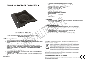 • • • • • • • • • • • PODKŁ. CHŁODZĄCA DO LAPTOPA 1 port USB do podłączenia dodatkowych urządzeń Wbudowany przycisk włączania/wyłączania podkładki Kompatybilna z portami USB VER. 1.1 / 2.0 5V. Wymiary : 345mm x 320mm x 36mm Zasilana z portu USB (DC 5V) Natężenie prądu: 0,25A Wymiary wentylatora: 150mm Podświetlenie wentylatora: niebieskie Obroty: 500RPM Przepływ powietrza: 60,95 CFM Kolor: czarny L P . IN X 2. Użytkowanie • Położyć laptopa na podkładce i połączyć podkładkę z laptopem za pomocą dołączonego kabla USB. Proszę przeczytać tę instrukcję przed rozpoczęciem użytkowania produktu i zachować ją na przyszłość. 1. Informacje podstawowe O R LL T A . W W INSTRUKCJA OBSŁUGI W • Podświetlana podkładka chłodząca do laptopa z przelotką USB. • Wyposażona w duży i bardzo cichy wentylator 150mm chłodzący dolną część laptopa. • Bardzo wytrzymała i solidnie wykonana obudowa. • Dzięki temu urządzeniu zyskujemy dobre chłodzenie laptopa. Podkładka zasilana jest poprzez podłączenie jej do komputera za pomocą dołączonego kabelka USB. Drugi port USB może służyć do podłączenie dodatkowego urządzenia. • Gumowe podkładki tłumiące drgania. • Chłodzenie laptopa zapewnia dłuższą żywotność baterii oraz stabilną pracę komputerów przenośnych. • Podkładka może być używana ze wszystkimi laptopami o przekątnej powyżej 12". Specyfikacja: 3. Uwagi i środki ostrożności • Urządzenie to jest przeznaczone wyłącznie do użytku domowego. • Do czyszczenia używać wilgotnej ściereczki, ewentualnie łagodnego detergentu. • Nie wkładać żadnych rzeczy między łopatki wentylatorów. • Nigdy nie zanurzać urządzenia w wodzie. • Nie narażać na ekstremalnie wysokie i niskie temperatury.