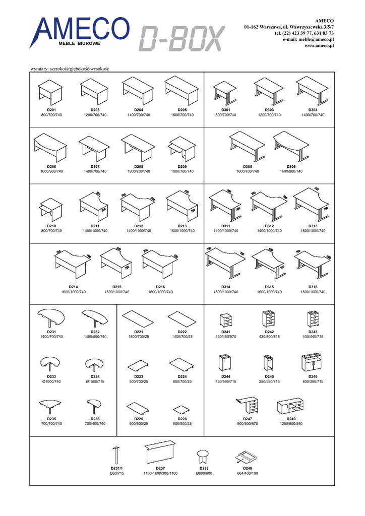 AMECO 01-162 Warszawa, ul. Wawrzyszewska 3/5/7 tel. (22) 423 39 77, 631 03 73 e-mail: [email protected] www.ameco.pl wymiary: szerokość/głębokość/wysokość D201 800/700/740 D203 1200/700/740 D204 1400/700/740 D205 1600/700/740 D206 1600/900/740 D207 1400/700/740 D208 1800/700/740 D209 1000/700/740 D210 800/700/740 D211 1400/1000/740 D212 1400/1000/740 D213 1600/1000/740 D214 1600/1000/740 D215 1600/1000/740 D301 800/700/740 D303 1200/700/740 D305 1600/700/740 D216 1600/1000/740 D304 1400/700/740 D306 1600/900/740 D311 1400/1000/740 D312 1400/1000/740 D313 1600/1000/740 D314 1600/1000/740 D315 1600/1000/740 D316 1600/1000/740 D231 1400/700/740 D232 1400/500/740 D221 1600/700/25 D222 1400/700/25 D241 430/450/570 D242 430/600/715 D243 430/440/715 D233 Ø1000/740 D234 Ø1000/715 D223 500/700/25 D224 900/700/25 D244 430/595/715 D245 280/580/715 D246 800/390/715 D235 700/700/740 D236 700/400/740 D225 900/500/25 D226 500/500/25 D231/1 Ø60/715 D237 1400-1600/300/1100 D247 900/500/670 D238 Ø600/600 D248 664/400/100 D249 1250/600/590 AMECO 01-162 Warszawa, ul. Wawrzyszewska 3/5/7 tel. (22) 423 39 77, 631 03 73 e-mail: [email protected] www.ameco.pl wymiary: szerokość/głębokość/wysokość D101 800/390/1830 D102 400/390/1830 D103 800/390/1830 D104 800/390/1830 D105 800/390/1830 D106 800/600/1830 D107 400/600/1830 D108 800/390/1830 D109 400/390/1830 D110 390/390/1830 D111 700/700/1830 D112 700/700/1830 D113 700/700/1830 D121 800/390/1480 D122 400/390/1480 D124 800/390/1480 D125 800/390/1480 D128 800/390/1480 D129 400/390/1480 D130 390/390/1480 D131 700/700/1480 D132 700/700/1480 D133 700/700/1480 D141 800/390/1100 D142 400/390/1100 D144 800/390/1100 D148 800/390/1100 D149 400/390/1100 D150 390/390/1100 D161 800/390/740 D162 400/390/740 D166 800/600/740 D151 800/390/1100 D158 800/390/1100 D171 800/390/740 D172 400/390/740 D178 800/390/740 D168 800/390/740 D169 400/390/740 D170 390/390/740 D250 400/18/1040 D251 400/18/680 Termin realizacji do 14 dni roboczych. Meble wykonane są z płyt melaminowanych. Grubość blatów biurek i górnych wieńców szaf 25 mm. (przy dopłacie 10% 32 mm. w kolorze: wiśnia portofino, kasztan wenge). Grubość korpusów, frontów szaf i regałów 18 mm. Wąskie płaszczyzny oklejone PCV co zwiększa wytrzymałość mebli. Kolory podstawowe: grusza calvados, wiśnia oxford, wiśnia pensylwania, buk jasny bawaria, popiel, orzech noce garda, klon