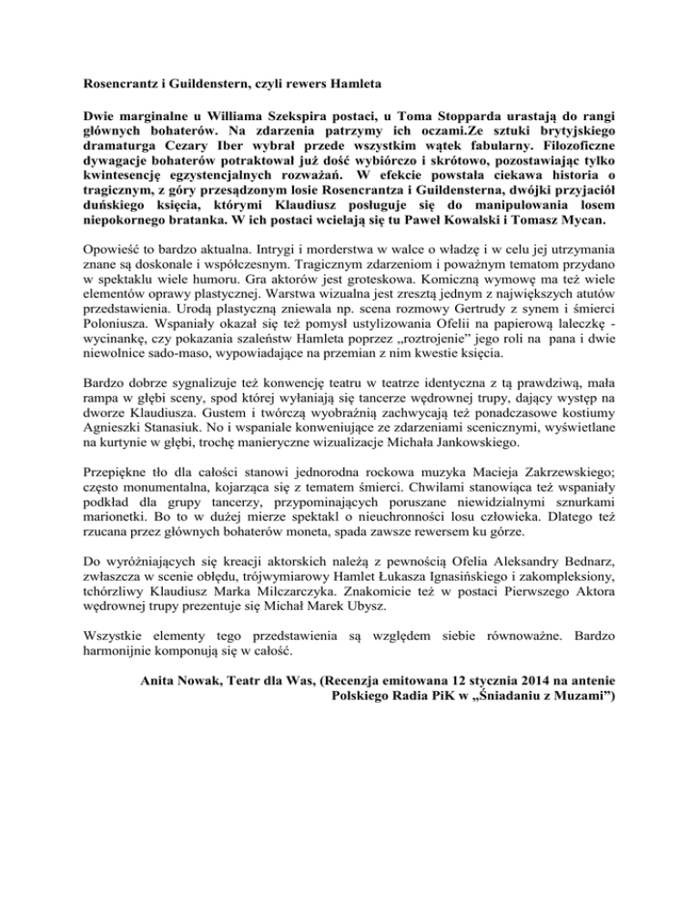 Rosencrantz i Guildenstern, czyli rewers Hamleta Dwie marginalne u Williama Szekspira postaci, u Toma Stopparda urastają do rangi głównych bohaterów. Na zdarzenia patrzymy ich oczami.Ze sztuki brytyjskiego dramaturga Cezary Iber wybrał przede wszystkim wątek fabularny. Filozoficzne dywagacje bohaterów potraktował już dość wybiórczo i skrótowo, pozostawiając tylko kwintesencję egzystencjalnych rozważań. W efekcie powstała ciekawa historia o tragicznym, z góry przesądzonym losie Rosencrantza i Guildensterna, dwójki przyjaciół duńskiego księcia, którymi Klaudiusz posługuje się do manipulowania losem niepokornego bratanka. W ich postaci wcielają się tu Paweł Kowalski i Tomasz Mycan. Opowieść to bardzo aktualna. Intrygi i morderstwa w walce o władzę i w celu jej utrzymania znane są doskonale i współczesnym. Tragicznym zdarzeniom i poważnym tematom przydano w spektaklu wiele humoru. Gra aktorów jest groteskowa. Komiczną wymowę ma też wiele elementów oprawy plastycznej. Warstwa wizualna jest zresztą jednym z największych atutów przedstawienia. Urodą plastyczną zniewala np. scena rozmowy Gertrudy z synem i śmierci Poloniusza. Wspaniały okazał się też pomysł ustylizowania Ofelii na papierową laleczkę wycinankę, czy pokazania szaleństw Hamleta poprzez „roztrojenie” jego roli na pana i dwie niewolnice sado-maso, wypowiadające na przemian z nim kwestie księcia. Bardzo dobrze sygnalizuje też konwencję teatru w teatrze identyczna z tą prawdziwą, mała rampa w głębi sceny, spod której wyłaniają się tancerze wędrownej trupy, dający występ na dworze Klaudiusza. Gustem i twórczą wyobraźnią zachwycają też ponadczasowe kostiumy Agnieszki Stanasiuk. No i wspaniale konweniujące ze zdarzeniami scenicznymi, wyświetlane na kurtynie w głębi, trochę manieryczne wizualizacje Michała Jankowskiego. Przepiękne tło dla całości stanowi jednorodna rockowa muzyka Macieja Zakrzewskiego; często monumentalna, kojarząca się z tematem śmierci. Chwilami stanowiąca też wspaniały podkład dla grupy tancerzy, przypominających poruszane niewidzialnymi sznurkami marionetki. Bo to w dużej mierze spektakl o nieuchronności losu człowieka. Dlatego też rzucana przez głównych bohaterów moneta, spada zawsze rewersem ku górze. Do wyróżniających się kreacji aktorskich należą z pewnością Ofelia Aleksandry Bednarz, zwłaszcza w scenie obłędu, trójwymiarowy Hamlet Łukasza Ignasińskiego i zakompleksiony, tchórzliwy Klaudiusz Marka Milczarczyka. Znakomicie też w postaci Pierwszego Aktora wędrownej trupy prezentuje się Michał Marek Ubysz. Wszystkie elementy tego przedstawienia są względem siebie równoważne. Bardzo harmonijnie komponują się w całość. Anita Nowak, Teatr dla Was, (Recenzja emitowana 12 stycznia 2014 na antenie Polskiego Radia PiK w „Śniadaniu z Muzami”)
