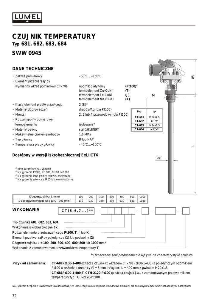 CZUJNIK TEMPERATURY Typ 681, 682, 683, 684 SWW 0945 DANE TECHNICZNE –50°C...+150°C 85 • Zakres pomiarowy • Element przetwarzaj¹cy wymienny wk³ad pomiarowy CT-701 • Klasa element przetwarzaj¹cego (Pt100)*) (T) (J) (K) opornik platynowy termoelement Cu-CuNi termoelement Fe-CuNi termoelement NiCr-NiAl 2 (B)*) • Materia³ doprowadzeñ drut Cu/Ag (dla Pt100) • Monta¿ 2, 3 lub 4 przewodowy (dla Pt100) • Rodzaj spoiny pomiarowej • Materia³ os³ony Typ M*) CT-681 M20x1,5 CT-682 G1/2” izolowana*) CT-683 M24x1,5 stal 1H18N9T CT-684 M27x2 • Maksymalne ciœnienie robocze 1,6 MPa • Typ g³owicy B lub NA*) • Temperatura pracy g³owicy –40°C...+100°C L termoelementu M Dostêpny w wersji iskrobezpiecznej ExiaIICT6 Æ8 *) Inne parametry na ¿yczenie *) Na ¿yczenie Pt500, Pt1000, Ni100, Ni1000 *) Na ¿yczenie inne gwinty calowe i metryczne *) Na ¿yczenie g³owica z IP65 lub kwasoodporna D³ugoœæ czujnika L (mm) 100 200 300 400 600 800 1000 D³ugoœæ wymiennego wk³adu CT-701 (mm) 130 230 330 430 630 830 1030 WYKONANIA CT(5,6,7...)** Typ czujnika 681, 682, 683, 684 Wykonanie iskrobezpieczne Ex Rodzaj elementu przetwarzaj¹cego Pt100, T, J lub K Element przetwarzaj¹cy pojedynczy (1) lub podwójny (2) D³ugoœæ czujnika L = 100, 200, 300, 400, 600, 800 lub 1000 mm*) Wykonanie z zamontowanym przetwornikiem temperatury T **Oznaczenie serii producenta nie wp³ywa na charakterystykê czujnika Przyk³ad zamawiania: CT-681Pt100-1-400 oznacza czujnik (z wk³adem CT-701Pt100-1-430) z pojedynczym opornikiem Pt100 w os³onie o œrednicy Æ = 8 mm i d³ugoœci L = 400 mm z gwintem M20x1,5. CT-681Pt100-1-400-T; CTH-2120-Pt100 oznacza czujnik j.w., z zamontowanym przetwornikiem temperatury typ TCH-2120-Pt100. Na ¿yczenie bezp³atne Œwiadectwo jakoœci okreœlaj¹ce klasê czujnika lub odp³atne Œwiadectwo kalibracji dla dowolnych temperatur z oznaczonymi odchy³kami 72
