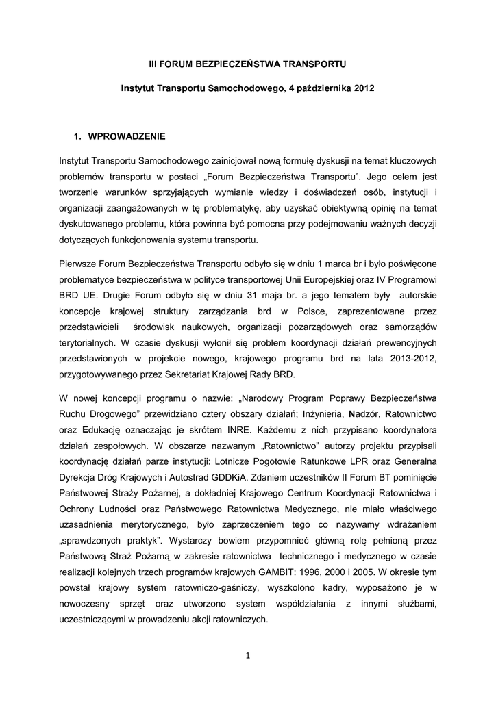 ) * + ! " # $ % % & ' ( ) ' Instytut Transportu Samochodowego zainicjował nową formułę dyskusji na temat kluczowych problemów transportu w postaci „Forum Bezpieczeństwa Transportu”. Jego celem jest tworzenie warunków sprzyjających wymianie wiedzy i doświadczeń osób, instytucji i organizacji zaangażowanych w tę problematykę, aby uzyskać obiektywną opinię na temat dyskutowanego problemu, która powinna być pomocna przy podejmowaniu ważnych decyzji dotyczących funkcjonowania systemu transportu. Pierwsze Forum Bezpieczeństwa Transportu odbyło się w dniu 1 marca br i było poświęcone problematyce bezpieczeństwa w polityce transportowej Unii Europejskiej oraz IV Programowi BRD UE. Drugie Forum odbyło się w dniu 31 maja br. a jego tematem były koncepcje krajowej przedstawicieli struktury zarządzania brd w Polsce, autorskie zaprezentowane przez środowisk naukowych, organizacji pozarządowych oraz samorządów terytorialnych. W czasie dyskusji wyłonił się problem koordynacji działań prewencyjnych przedstawionych w projekcie nowego, krajowego programu brd na lata 2013-2012, przygotowywanego przez Sekretariat Krajowej Rady BRD. W nowej koncepcji programu o nazwie: „Narodowy Program Poprawy Bezpieczeństwa Ruchu Drogowego” przewidziano cztery obszary działań; nżynieria, oraz adzór, atownictwo dukację oznaczając je skrótem INRE. Każdemu z nich przypisano koordynatora działań zespołowych. W obszarze nazwanym „Ratownictwo” autorzy projektu przypisali koordynację działań parze instytucji: Lotnicze Pogotowie Ratunkowe LPR oraz Generalna Dyrekcja Dróg Krajowych i Autostrad GDDKiA. Zdaniem uczestników II Forum BT pominięcie Państwowej Straży Pożarnej, a dokładniej Krajowego Centrum Koordynacji Ratownictwa i Ochrony Ludności oraz Państwowego Ratownictwa Medycznego, nie miało właściwego uzasadnienia merytorycznego, było zaprzeczeniem tego co nazywamy wdrażaniem „sprawdzonych praktyk”. Wystarczy bowiem przypomnieć główną rolę pełnioną przez Państwową Straż Pożarną w zakresie ratownictwa technicznego i medycznego w czasie realizacji kolejnych trzech programów krajowych GAMBIT: 1996, 2000 i 2005. W okresie tym powstał krajowy system ratowniczo-gaśniczy, wyszkolono kadry, wyposażono je w nowoczesny sprzęt oraz utworzono system uczestniczącymi w prowadzeniu akcji ratowniczych. 1 współdziałania z innymi służbami, Obecnie, po dyskusjach w Krajowym Centrum Koordynacji Ratownictwa i Ochrony Ludności oraz po przestudiowaniu materiałów z dyskusji na kolejnych posiedzeniach Krajowej Rady BRD na temat „Założeń i wytycznych do Narodowego Programu BRD”, proponujemy dyskusję na III Forum BT o zasadach integracji w zakresie organizacyjnym dwóch odrębnych systemów: „Krajowego System Ratowniczo-Gaśniczego Ratownictwa Medycznego”, a także ich powiązanie PSP” oraz „Państwowego z obecnie budowanym systemem powiadamiania ratunkowego. W efekcie tych rozważań powinniśmy znaleźć rozwiązania najważniejszych obecnie problemów, to jest: • skrócenie czasu dotarcia pomocy do poszkodowanych, głównie poprzez lepsze rozmieszczenie i zwiększenie liczby dodatkowych podmiotów ratowniczych oraz usprawnienie systemu powiadamiania, • analiza epidemiologii stanów pourazowych jako podstawa wniosków do programu działań Państwowego Ratownictwa Medycznego, • zasady współpracy służb i podmiotów ratowniczych na drogach, • metodyka badań przyczyn i skutków wypadków drogowych jako warunek powodzenia dalszych działań prewencyjnych i ratowniczych. Tak powstała idea zorganizowania III Forum BT na temat obecnego stanu systemu ratownictwa w Polsce oraz kierunków dalszych prac nad jego doskonaleniem. Biorąc zatem pod uwagę konieczność metodycznego podejścia do założeń systemu zarządzania brd w Polsce, a zwłaszcza do analizy przyczyn wielu trudności w dotychczasowych działaniach prewencyjnych i ratowniczych mamy nadzieję, że dzięki formule dyskusji zaproponowanej na Forum BT uzyskamliśmy wartościowy materiał, który będzie bardzo pomocny władzom w określeniu głównych założeń dla działań prewencyjnych w dekadzie do 2020 roku. Poniżej przedstawiono rekapitulację wystąpień wprowadzających do dyskusji, syntezę dyskusji i wypływające z niej wnioski. ' * Do przygotowania prezentacji wprowadzających do dyskusji na temat kierunków dalszych działań, które należy podjąć w celu osiągnięcia skuteczniejszego niż dotychczas sposobu działania krajowego systemu ratownictwa technicznego i medycznego, zaproszenie otrzymali i przedstawili koncepcje opatrzone tytułami jak poniżej: • % $ % $ * & & % $ ” – Dariusz Marczyński, dyrektor Krajowego Centrum Koordynacji Ratownictwa i Ochrony Ludności KG Państwowej Straży Pożarnej. 2 • $ % & % $ & & % % $ * & % & % $ ” – Adam M. Pietrzak, Wojewódzki Koordynator Ratownictwa Medycznego, Warszawa. • % % % % & $ & % ” – Grzegorz Matczyński, dyrektor Zarządu Wykonawczego Warmińsko - Mazurskiego Oddziału Związku Ochotniczych Straży Pożarnych. $ ) „ * + % $ % $ * & & % ” Na system ratownictwa w Polsce składają się dwie duże struktury: • Państwowa Straż Pożarna (PSP) wraz z Ochotniczą Strażą Pożarną OSP, • Państwowe Ratownictwo Medyczne (PRM). Ponadto, w razie konieczności, współdziałają z nimi inne jednostki, organizacje jak: Polski Czerwony Krzyż, Związek Harcerstwa Polskiego, Górskie Ochotnicze Pogotowie Ratunkowe, Aeroklub Polski oraz Wodne Ochotnicze Pogotowie Ratunkowe. % $ % $ działa jako integralna część wewnętrznego systemu bezpieczeństwa państwa, finansowanego przez rząd. Jest kierowany przez Komendanta Głównego Państwowej Straży Pożarnej i nadzorowany przez Ministra Spraw Wewnętrznych. KSRG działa na trzech poziomach administracyjnych odpowiadających strukturze administracyjnej kraju: powiatowy – podstawowy poziom wykonawczy, działania prowadzone s