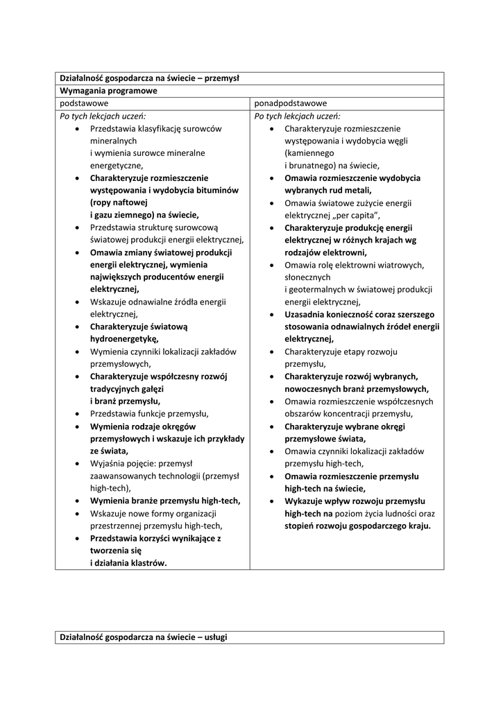 Działalnośd gospodarcza na świecie – przemysł Wymagania programowe podstawowe Po tych lekcjach uczeń: Przedstawia klasyfikację surowców mineralnych i wymienia surowce mineralne energetyczne, Charakteryzuje rozmieszczenie występowania i wydobycia bituminów (ropy naftowej i gazu ziemnego) na świecie, Przedstawia strukturę surowcową światowej produkcji energii elektrycznej, Omawia zmiany światowej produkcji energii elektrycznej, wymienia największych producentów energii elektrycznej, Wskazuje odnawialne źródła energii elektrycznej, Charakteryzuje światową hydroenergetykę, Wymienia czynniki lokalizacji zakładów przemysłowych, Charakteryzuje współczesny rozwój tradycyjnych gałęzi i branż przemysłu, Przedstawia funkcje przemysłu, Wymienia rodzaje okręgów przemysłowych i wskazuje ich przykłady ze świata, Wyjaśnia pojęcie: przemysł zaawansowanych technologii (przemysł high-tech), Wymienia branże przemysłu high-tech, Wskazuje nowe formy organizacji przestrzennej przemysłu high-tech, Przedstawia korzyści wynikające z tworzenia się i działania klastrów. Działalnośd gospodarcza na świecie – usługi ponadpodstawowe Po tych lekcjach uczeń: Charakteryzuje rozmieszczenie występowania i wydobycia węgli (kamiennego i brunatnego) na świecie, Omawia rozmieszczenie wydobycia wybranych rud metali, Omawia światowe zużycie energii elektrycznej „per capita”, Charakteryzuje produkcję energii elektrycznej w różnych krajach wg rodzajów elektrowni, Omawia rolę elektrowni wiatrowych, słonecznych i geotermalnych w światowej produkcji energii elektrycznej, Uzasadnia koniecznośd coraz szerszego stosowania odnawialnych źródeł energii elektrycznej, Charakteryzuje etapy rozwoju przemysłu, Charakteryzuje rozwój wybranych, nowoczesnych branż przemysłowych, Omawia rozmieszczenie współczesnych obszarów koncentracji przemysłu, Charakteryzuje wybrane okręgi przemysłowe świata, Omawia czynniki lokalizacji zakładów przemysłu high-tech, Omawia rozmieszczenie przemysłu high-tech na świecie, Wykazuje wpływ rozwoju przemysłu high-tech na poziom życia ludności oraz stopieo rozwoju gospodarczego kraju. Wymagania programowe podstawowe Po tych lekcjach uczeń: Przedstawia klasyfikację usług, Wykazuje rolę usług w krajach o różnym stopniu rozwoju gospodarczego, Przedstawia klasyfikację transportu lądowego, Charakteryzuje transport drogowy w krajach o różnym stopniu rozwoju gospodarczego, Wyjaśnia podstawowe nazewnictwo związane z transportem wodnym, Charakteryzuje transport wodny śródlądowy w krajach o różnym stopniu rozwoju gospodarczego, Wymienia ładunki przewożone transportem lotniczym oraz przesyłowym, Charakteryzuje transport lotniczy w krajach o różnym stopniu rozwoju gospodarczego, Przedstawia klasyfikację łączności, Wyjaśnia rolę telefonii w światowym transferze informacji, Wyjaśnia pojęcia: bilans handlowy, bilans płatniczy, saldo bilansu, Przedstawia strukturę towarową światowego handlu, Wymienia kraje najchętniej odwiedzane przez turystów, Charakteryzuje światowy ruch turystyczny, Wskaże walory turystyczne własnej okolicy, Przedstawi stan zagospodarowania turystycznego w otoczeniu. ponadpodstawowe Po tych lekcjach uczeń: Omawia stan usług edukacyjnych oraz zdrowotnych w krajach o różnym stopniu rozwoju gospodarczego, Uzasadni podział usług na III i IV sektor, Charakteryzuje transport kolejowy w krajach o różnym stopniu rozwoju gospodarczego, Wyjaśnia rolę transportu lądowego w gospodarce narodowej wybranych krajów, Charakteryzuje transport morski w krajach o różnym stopniu rozwoju gospodarczego, Wyjaśnia rolę transportu wodnego w gospodarce narodowej wybranych krajów, Charakteryzuje transport przesyłowy w krajach o różnym stopniu rozwoju gospodarczego, Wyjaśnia rolę transportu lotniczego i przesyłowego w gospodarce narodowej wybranych krajów, Przedstawia rolę telekomunikacji komputerowej w światowym transferze informacji, Omawia współczesne tendencje zmian w światowej telekomunikacji, Omawia strukturę geograficzną światowego handlu, Wyjaśnia rolę usług w handlu międzynarodowym, Przedstawia wybrane regiony turystyczne świata, Wyjaśnia rolę turystyki w gospodarce narodowej, Wskaże źródła „it” dotyczące okolicy (obiekty oraz publikacje), Ocenia rozwój turystyki we własnej okolicy.