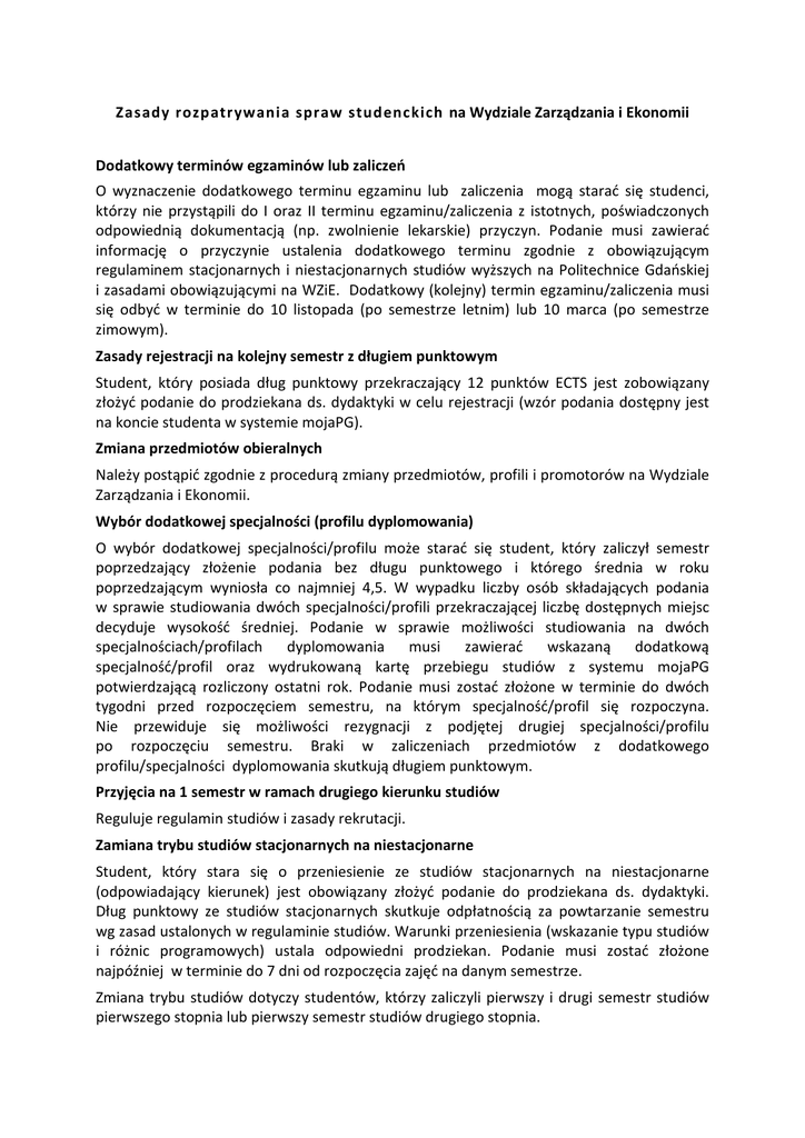 Zasady rozpatrywania spraw studenckich na Wydziale Zarządzania i Ekonomii Dodatkowy terminów egzaminów lub zaliczeń O wyznaczenie dodatkowego terminu egzaminu lub zaliczenia mogą starać się studenci, którzy nie przystąpili do I oraz II terminu egzaminu/zaliczenia z istotnych, poświadczonych odpowiednią dokumentacją (np. zwolnienie lekarskie) przyczyn. Podanie musi zawierać informację o przyczynie ustalenia dodatkowego terminu zgodnie z obowiązującym regulaminem stacjonarnych i niestacjonarnych studiów wyższych na Politechnice Gdańskiej i zasadami obowiązującymi na WZiE. Dodatkowy (kolejny) termin egzaminu/zaliczenia musi się odbyć w terminie do 10 listopada (po semestrze letnim) lub 10 marca (po semestrze zimowym). Zasady rejestracji na kolejny semestr z długiem punktowym Student, który posiada dług punktowy przekraczający 12 punktów ECTS jest zobowiązany złożyć podanie do prodziekana ds. dydaktyki w celu rejestracji (wzór podania dostępny jest na koncie studenta w systemie mojaPG). Zmiana przedmiotów obieralnych Należy postąpić zgodnie z procedurą zmiany przedmiotów, profili i promotorów na Wydziale Zarządzania i Ekonomii. Wybór dodatkowej specjalności (profilu dyplomowania) O wybór dodatkowej specjalności/profilu może starać się student, który zaliczył semestr poprzedzający złożenie podania bez długu punktowego i którego średnia w roku poprzedzającym wyniosła co najmniej 4,5. W wypadku liczby osób składających podania w sprawie studiowania dwóch specjalności/profili przekraczającej liczbę dostępnych miejsc decyduje wysokość średniej. Podanie w sprawie możliwości studiowania na dwóch specjalnościach/profilach dyplomowania musi zawierać wskazaną dodatkową specjalność/profil oraz wydrukowaną kartę przebiegu studiów z systemu mojaPG potwierdzającą rozliczony ostatni rok. Podanie musi zostać złożone w terminie do dwóch tygodni przed rozpoczęciem semestru, na którym specjalność/profil się rozpoczyna. Nie przewiduje się możliwości rezygnacji z podjętej drugiej specjalności/profilu po rozpoczęciu semestru. Braki w zaliczeniach przedmiotów z dodatkowego profilu/specjalności dyplomowania skutkują długiem punktowym. Przyjęcia na 1 semestr w ramach drugiego kierunku studiów Reguluje regulamin studiów i zasady rekrutacji. Zamiana trybu studiów stacjonarnych na niestacjonarne Student, który stara się o przeniesienie ze studiów stacjonarnych na niestacjonarne (odpowiadający kierunek) jest obowiązany złożyć podanie do prodziekana ds. dydaktyki. Dług punktowy ze studiów stacjonarnych skutkuje odpłatnością za powtarzanie semestru wg zasad ustalonych w regulaminie studiów. Warunki przeniesienia (wskazanie typu studiów i różnic programowych) ustala odpowiedni prodziekan. Podanie musi zostać złożone najpóźniej w terminie do 7 dni od rozpoczęcia zajęć na danym semestrze. Zmiana trybu studiów dotyczy studentów, którzy zaliczyli pierwszy i drugi semestr studiów pierwszego stopnia lub pierwszy semestr studiów drugiego stopnia.
