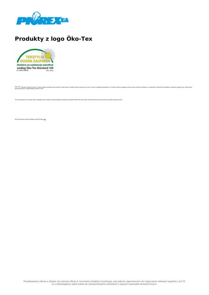 Produkty z logo Öko-Tex Oeko-Tex® Standard 100 jest wiod?cym w ?wiecie znakiem bezpiecze?stwa wyrobów w?ókienniczych. Produkty, którym przyznano ten znak, s? wolne od substancji szkodliwych w st??eniach maj?cych negatywny wp?yw na stan zdrowia cz?owieka m.in. pestycydów, chlorofenoli, formaldehydu, barwników alergizuj?cych, zabronionych barwników azowych i ekstrahowalnych metali ci??kich. Ten znak potwierdza, ?e produkt zosta? przebadany przez niezale?ny instytut badawczy Stowarzyszenia OEKO-TEX® pod k?tem ponad 100 parametrów istotnych dla zdrowia i uzyska? pozytywne wyniki. Wi?cej informacji na temat certyfikatu znajd? Pa?stwo tutaj. Przedstawiona oferta w sklepie nie stanowi oferty w rozumieniu Kodeksu Cywilnego, jest jedynie zaproszeniem do rozpoczęcia rokowań (zgodnie z art.71 k.c.).Zastrzegamy sobie prawo do niezrealizowania zamówień z ważnych powodów ekonomicznych. Powered by TCPDF (www.tcpdf.org)