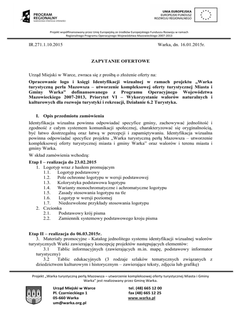 Projekt współfinansowany przez Unię Europejską ze środków Europejskiego Funduszu Rozwoju w ramach Regionalnego Programu Operacyjnego Województwa Mazowieckiego 2007-2013 IR.271.1.10.2015 Warka, dn. 16.01.2015r. ZAPYTANIE OFERTOWE Urząd Miejski w Warce, zwraca się z prośbą o złożenie oferty na: Opracowanie logo i księgi Identyfikacji wizualnej w ramach projektu „Warka turystyczną perła Mazowsza – utworzenie kompleksowej oferty turystycznej Miasta i Gminy Warka” dofinansowanego z Programu Operacyjnego Województwa Mazowieckiego 2007-2013, Priorytet VI – Wykorzystanie walorów naturalnych i kulturowych dla rozwoju turystyki i rekreacji, Działanie 6.2 Turystyka. I. Opis przedmiotu zamówienia Identyfikacja wizualna powinna odpowiadać specyfice gminy, zachowywać jednolitość i zgodność z całym systemem komunikacji społecznej, charakteryzować się oryginalnością, być łatwo dostrzegalną oraz łatwą w percepcji i zapamiętywaniu. Identyfikacja wizualna powinna odpowiadać specyfice projektu „Warka turystyczną perłą Mazowsza – utworzenie kompleksowej oferty turystycznej miasta i gminy Warka” oraz walorów i terenu miasta i gminy Warka. W skład zamówienia wchodzą: Etap I – realizacja do 23.02.2015 1. Logotyp wraz z hasłem promującym 1.1. Logotyp podstawowy 1.2. Pole ochronne logotypu w wersji podstawowej 1.3. Kolorystyka podstawowa logotypu 1.4. Warianty monochromatyczne i achromatyczne logotypu 1.5. Zasady stosowania logotypu na tle 1.6. Logotyp w wersji poziomej 1.7. Niedozwolone przykłady stosowania logotypu 2. Czcionka 2.1. Podstawowy krój pisma 2.2. Zamiennik systemowy podstawowego kroju pisma Etap II – realizacja do 06.03.2015r. 3. Materiały promocyjne - Katalog jednolitego systemu identyfikacji wizualnej walorów turystycznych Warki zawierający koncepcję projektów następujących elementów: 3.1 Tablic informacyjnych (zawierających m.in. mapę, podstawowy informator turystyczny) 3.2 Tablic edukacyjnych (3 rodzaje szlaków tematycznych związanych z dziedzictwem kulturowym i historycznym – zawierające teksty, zdjęcia lub grafikę) Projekt „Warka turystyczną perłą Mazowsza – utworzenie kompleksowej oferty turystycznej Miasta i Gminy Warka” jest realizowany przez Gminę Warka. Urząd Miejski w Warce Pl. Czarnieckiego 1 05-660 Warka [email protected] tel. (48) 665 12 00 fax (48) 665 12 25 www.warka.pl Projekt współfinansowany przez Unię Europejską ze środków Europejskiego Funduszu Rozwoju w ramach Regionalnego Programu Operacyjnego Województwa Mazowieckiego 2007-2013 3.3 3.4 3.5 3.6 3.7 3.8 3.9 3.10 Tablic atrakcji turystycznych (zawierających teksty i elementy graficzne) Tabliczek wskazujących trasy Foldery do tablic szlaków edukacyjnych Witaczy Przewodnika turystycznego Albumu fotograficznego Pocztówek Kubków promocyjnych II. Wymagany termin realizacji zamówienia – do dnia 06.03.2015r. III. Informacje o projekcie Istotą projektu jest stworzenie kompleksowej oferty turystycznej w Mieście i Gminie Warka, jej zintegrowanie z istniejącą ofertą oraz bogatymi walorami przyrodniczymi i kulturowymi obszaru. Opis projektu oraz jego lokalizacji zawiera załącznik 1 do Opisu przedmiotu zamówienia. IV. Informacje dodatkowe • Zamawiający nie dopuszcza stosowania w jakiejkolwiek formie zapożyczeń z innych prac, projektów obcych, w tym zagranicznych, które są chronione prawami autorskimi oraz kupowania licencji obcych. Nie należy wykorzystywać w projekcie herbu aktualnego Miasta Warki. Logo będzie wykorzystywane m.in. na materiałach informacyjnych i promocyjnych m.in. na stronie internetowej, witaczach wjazdowych do miasta, ogłoszeniach prasowych, przewodnikach turystycznych, oznaczeniach szlaków i ścieżek, tablicach informacyjnych, gadżetach pamiątkowych – technika graficzna prac nad logiem powinna uwzględniać te wymagania. • Po wykonaniu opracowania będącego przedmiotem zapytania staje się ono własnością Zamawiającego, który może według swojego uznania dowolnie opracowaniem rozporządzać. Z dniem podpisania protokołu przekazania, Gmina Warka nabywa autorskie prawa majątkowe do opracowanej logo bez obowiązku zapłaty dodatkowego wynagrodzenia, w szczególności do: - utrwalania dowolną techniką, - rozpowszechniania – upubliczniania w taki sposób, aby każdy mógł mieć do niego dostęp w miejscu i czasie dowolnie wybranym, - zwielokrotnienia każdą możliwą techniką, w szczególności poprzez drukowanie, wykonywanie odbitek przy użyciu nośników magnetycznych, cyfrowych technik komputerowych, - wprowadzanie do obrotu, - wprowadzenie do pamięci komputera – przy czym przeniesienie praw, o których mowa powyżej nie jest ograniczone czasowo ani terytorialnie. Projekt „Warka turystyczną perłą Mazowsza – utworzenie kompleksowej oferty turystycznej Miasta i Gminy Warka” jest realizowany przez Gminę Warka. Urząd Miejski w Warce Pl. Czarnieckiego 1 05-660 Warka [email protected] tel. (48) 665 12 00 fax (48) 665 12 25 www.warka.pl Projekt współfinansowany przez Unię Europejską ze środków Europejskiego Funduszu Rozwoju w ramach Regionalnego Programu Operacyjnego Województwa Mazowieckiego 2007-2013 Wykonawca przenosi na Zamawiającego autorskie prawa majątkowe do wykonanego opracowania w części prawem chronionej, przysługujące twórcy oraz wyraża zgodę na dokonanie w opracowaniach będących przedmiotem zapytania wszelkich zmian, zgodnie z wymaganiami Zamawiającego przez inne osoby lub firmy, zrzekając się wynagrodzenia za akceptacją ewentualnych zmian projektu lub jego części oraz wszelkich roszczeń mogących wynikać ze zmiany opracowania. • Księga identyfikacji wizualnej powinna być zgodna z aktualnym dokumentem „Wytyczne dla beneficjentów w zakresie działań informacyjno-promocyjnych w ramach Regionalnego Programu Operacyjnego Województwa Mazowieckiego 2007 2013” na stronie www.mazowia.eu oraz zawierać na wewnętrznej stro
