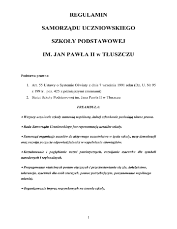 REGULAMIN SAMORZĄDU UCZNIOWSKIEGO SZKOŁY PODSTAWOWEJ IM. JAN PAWŁA II w TŁUSZCZU Podstawa prawna: 1. Art. 55 Ustawy o Systemie Oświaty z dnia 7 września 1991 roku (Dz. U. Nr 95 z 1991r., poz. 425 z późniejszymi zmianami) 2. Statut Szkoły Podstawowej im. Jana Pawła II w Tłuszczu PREAMBUŁA: Wszyscy uczniowie szkoły stanowią wspólnotę, której członkowie posiadają równe prawa. Rada Samorządu Uczniowskiego jest reprezentacją uczniów szkoły. Samorząd organizuje uczniów do aktywnego uczestnictwa w życiu szkoły, uczy demokracji oraz rozwija poczucie odpowiedzialności w wypełnianiu obowiązków. Kształtowanie i pogłębianie uczuć patriotycznych, rozwijanie szacunku dla symboli narodowych i regionalnych. Propagowanie właściwych postaw etycznych ( przeciwstawianie się złu, koleżeństwo, tolerancja, szacunek dla osób starszych, pomoc potrzebującym, poszanowanie wspólnego mienia). Organizowanie imprez rozrywkowych na terenie szkoły. 1 Rozdział I Postanowienia ogólne art. 1 W Szkole Podstawowej im. Jana Pawła II działa Samorząd Uczniowski zwany dalej Samorządem. art. 2 Samorząd tworzą wszyscy uczniowie szkoły. art. 3 Organy Samorządu są jedynymi reprezentantami ogółu uczniów szkoły. art. 4 Samorząd wybierany jest przez uczniów w demokratycznych wyborach. art. 5 Do zadań Samorządu należy: 1) rozwijanie demokratycznych form współżycia, współdziałania uczniów i nauczycieli, wzajemnego wspierania się; 2) kształtowanie umiejętności zespołowego działania, tworzenie warunków do aktywności społecznej, samokontroli, samooceny i samodyscypliny; 3) organizowanie społeczności uczniowskiej do jak najlepszego spełniania obowiązków szkolnych; 4) przedstawianie zespołowi kierowniczemu Szkoły opinii i potrzeb uczniów, spełnianie rzecznictwa interesów ogółu społeczności uczniowskiej; 5) współdziałanie z zespołem kierowniczym Szkoły w zapewnianiu uczniom należytych warunków do nauki oraz w rozwijaniu różnych form zajęć pozalekcyjnych; 6) dbanie o mienie szkolne; 7) organizowanie pomocy koleżeńskiej uczniom napotykającym na trudności w nauce; 8) rozstrzyganie sporów między uczniami; 2 9) zapobieganie konfliktom między uczniami, a nauczycielami; w przypadku pojawienia się takiego konfliktu zgłaszanie go, poprzez opiekuna Samorządu, Dyrektorowi Szkoły lub Radzie Pedagogicznej; 10) dbanie, w całokształcie swojej działalności, o dobre imię i honor Szkoły. art. 6 Samorząd Uczniowski może przedstawiać Radzie Pedagogicznej oraz Dyrektorowi wnioski i opinie we wszystkich sprawach Szkoły, w szczególności dotyczących realizacji podstawowych praw ucznia, takich jak: 1) prawo do zapoznawania się z programem nauczania, z jego treścią, celami i stawianymi wymaganiami; 2) prawo do dostosowania treści, metod i organizacji nauczania do jego możliwości; 3) prawo do udziału w zajęciach dydaktyczno-wyrównawczych w przypadku trudności w nauce; 4) prawo do jawnej i umotywowanej oceny postępów w nauce i zachowaniu; 5) prawo do życia szkolnego umożliwiającego zachowanie właściwych proporcji między wysiłkiem szkolnym, a możliwością rozwijania i zaspokajania własnych zainteresowań; 6) prawo redagowania i wydawania gazety szkolnej, prowadzenia kroniki oraz gazetki ściennej; 7) prawo do ochrony przed bezprawnymi zamachami na jego honor i reputację; 8) prawo do ochrony przed arbitralną ingerencją w życie prywatne, rodzinne czy też korespondencję; 9) prawo do swobodnego wyrażania własnych poglądów we wszystkich sprawach jego dotyczących; 10) prawo do aktywnego udziału w pracach Samorządu Uczniowskiego (m.in. czynne i bierne prawo wyborcze). Art.7 Samorząd Uczniowski jest także uprawniony do: 1) przedstawiania propozycji do Programu Wychowawczego Szkoły, wynikających z potrzeb i zainteresowań uczniów; 2) wyrażania opinii dotyczących problemów dzieci; 3) udziału w opracowywaniu dokumentów regulujących życie społeczności uczniowskiej; 4) zgłaszania kandydatur uczniów do wyróżnień i nagród stosowanych w Szkole; 3 5) wnoszenia uwag do opinii Dyrektora Szkoły o uczniach, poręczeń za uczniów. Art.8 1) Samorząd może prowadzić sklepik uczniowski, pod nadzorem nauczycieli -opiekunów, powołanych przez Dyrektora Szkoły; 2) szczegółową organizację pracy sklepiku szkolnego określa Regulamin Sklepiku, ustalony przez Dyrektora Szkoły. Rozdział II Organy Samorządu Uczniowskiego art. 9 Organami Samorządu Uczniowskiego są: 1. Samorząd Klasowy w składzie: Przewodniczący Klasy, Zastępca Przewodniczącego, Skarbnik, 2. Zarząd Samorządu Uczniowskiego w składzie: Przewodniczący Samorządu Uczniowskiego, Zastępca Przewodniczącego Samorządu Uczniowskiego, Sekretarz. 3. Dla realizacji swoich zadań Zarząd SU może powoływać sekcje stałe lub doraźne. Podczas powoływania sekcji Zarząd określa jej nazwę, zakres działalności i kompetencje, okres jej istnienia, przewodniczącego odpowiedzialnego za jej prace oraz skład osobowy. Członkiem sekcji może zostać każdy uczeń szkoły. 4. Przewodniczący SU reprezentuje swoich kolegów wobec nauczycieli i dyrekcji, przewodniczy zebraniom. 5. Zadaniem zarządu jest tak zorganizować pracę, żeby dawała ona jak najlepsze efekty i żeby wszyscy wyborcy mieli poczucie, że wybrali swych działaczy trafnie. 4 6. W pracy Samorządu Uczniowskiego pomaga nauczyciel opiekun. Jest to doradca, a zarazem rzecznik interesów Samorządu Uczniowskiego na forum Rady Pedagogicznej. Art. 10 Kompetencje organów Samorządu Uczniowskiego: 1. Samorząd Klasowy: 1. reprezentuje klasę na zewnątrz, współpracując z Zarządem SU, 2. organizuje życie klasy (imprezy pozalekcyjne, dyżury w klasie itp.), 3. wraz z wychowawcą rozwiązuje wewnętrzne problemy klasy, 4. organizuje pomoc koleżeńską przy udziale wychowawcy. 2. Rada Samorządu Uczniowskiego: 1. uchwala Regulamin SU, 2. podejmuje uchwały w sprawie dokonywania zmian w