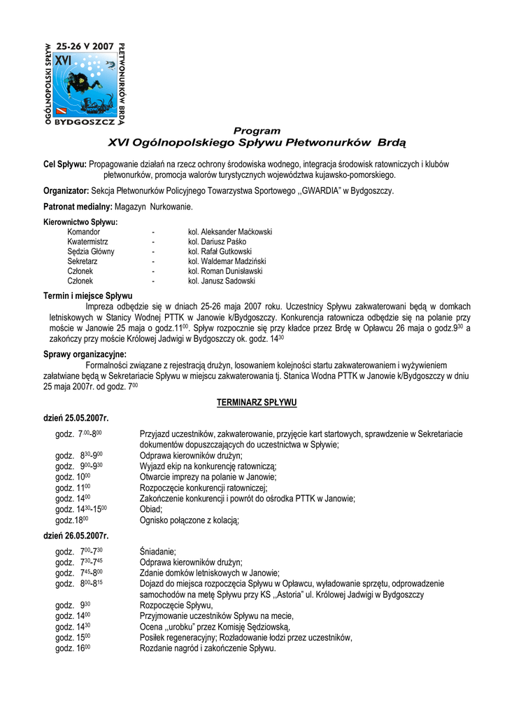Program XVI Ogólnopolskiego Spływu Płetwonurków Brdą Cel Spływu: Propagowanie działań na rzecz ochrony środowiska wodnego, integracja środowisk ratowniczych i klubów płetwonurków, promocja walorów turystycznych województwa kujawsko-pomorskiego. Organizator: Sekcja Płetwonurków Policyjnego Towarzystwa Sportowego ,,GWARDIA” w Bydgoszczy. Patronat medialny: Magazyn Nurkowanie. Kierownictwo Spływu: Komandor Kwatermistrz Sędzia Główny Sekretarz Członek Członek - kol. Aleksander Maćkowski kol. Dariusz Paśko kol. Rafał Gutkowski kol. Waldemar Madziński kol. Roman Dunisławski kol. Janusz Sadowski Termin i miejsce Spływu Impreza odbędzie się w dniach 25-26 maja 2007 roku. Uczestnicy Spływu zakwaterowani będą w domkach letniskowych w Stanicy Wodnej PTTK w Janowie k/Bydgoszczy. Konkurencja ratownicza odbędzie się na polanie przy moście w Janowie 25 maja o godz.1100. Spływ rozpocznie się przy kładce przez Brdę w Opławcu 26 maja o godz.930 a zakończy przy moście Królowej Jadwigi w Bydgoszczy ok. godz. 1430 Sprawy organizacyjne: Formalności związane z rejestracją drużyn, losowaniem kolejności startu zakwaterowaniem i wyżywieniem załatwiane będą w Sekretariacie Spływu w miejscu zakwaterowania tj. Stanica Wodna PTTK w Janowie k/Bydgoszczy w dniu 25 maja 2007r. od godz. 700 TERMINARZ SPŁYWU dzień 25.05.2007r. godz. 7.00-800 godz. 830-900 godz. 900-930 godz. 1000 godz. 1100 godz. 1400 godz. 1430-1500 godz.1800 Przyjazd uczestników, zakwaterowanie, przyjęcie kart startowych, sprawdzenie w Sekretariacie dokumentów dopuszczających do uczestnictwa w Spływie; Odprawa kierowników drużyn; Wyjazd ekip na konkurencję ratowniczą; Otwarcie imprezy na polanie w Janowie; Rozpoczęcie konkurencji ratowniczej; Zakończenie konkurencji i powrót do ośrodka PTTK w Janowie; Obiad; Ognisko połączone z kolacją; dzień 26.05.2007r. godz. godz. godz. godz. 700-730 730-745 745-800 800-815 godz. 930 godz. 1400 godz. 1430 godz. 1500 godz. 1600 Śniadanie; Odprawa kierowników drużyn; Zdanie domków letniskowych w Janowie; Dojazd do miejsca rozpoczęcia Spływu w Opławcu, wyładowanie sprzętu, odprowadzenie samochodów na metę Spływu przy KS ,,Astoria” ul. Królowej Jadwigi w Bydgoszczy Rozpoczęcie Spływu, Przyjmowanie uczestników Spływu na mecie, Ocena ,,urobku” przez Komisję Sędziowską, Posiłek regeneracyjny; Rozładowanie łodzi przez uczestników, Rozdanie nagród i zakończenie Spływu. REGULAMIN SPŁYWU I KONKURENCJI RATOWNICZEJ I. Warunki uczestnictwa W Spływie uczestniczą czteroosobowe zespoły płetwonurków z Policji, Państwowej i Ochotniczej Straży Pożarnej, z klubów płetwonurków i organizacji zajmujących się ratownictwem wodnym w składzie Kierownik drużyny i 3 /trzech/ zawodników. Kierownicy zespołów zobowiązani są do przesłania wypełnionej karty zgłoszenia /w załączeniu/ na 30 dni przed imprezą na adres: Policyjne Towarzystwo Sportowe „ GWARDIA ” Sekcja Płetwonurków 85-667 Bydgoszcz ul. Chodkiewicza 32 Wpisowe w wysokości 100 zł od osoby uczestniczącej należy wpłacić na 10 dni przed imprezą na konto Sekcji: Fortis Bank Polska S.A. Oddział Bydgoszcz 45 1600 1185 0004 0807 2573 2150 z dopiskiem „ SPŁYW ” lub wpłacić przed imprezą w sekretariacie Spływu. Dowód wpłaty lub przelewu /kopie/ należy okazać w sekretariacie Spływu przed otwarciem imprezy. Możliwy jest przyjazd osób towarzyszących pod warunkiem wcześniejszego uzgodnienia, formalnego zgłoszenia i uiszczenia opłaty jak wyżej. Dodatkowych informacji udziela kol. Waldemar Madziński tel. /052/ 328-12-03 , 501 552 250 lub /052/ 327-16-88 (w godzinach wieczornych) e-mail: [email protected] W ramach wpisowego organizatorzy zapewniają: -zakwaterowanie /bez pościeli ,należy zabrać swój śpiwór/ -wyżywienie /obiad, kolacja, kiełbasa do ogniska, śniadanie, posiłek regeneracyjny/ -ubezpieczenie -pamiątkę okolicznościową -opieką medyczną Koszty podróży pokrywają uczestnicy . W przypadku nie przybycia na Spływ wpisowe nie zostanie zwrócone. Osoby korzystające z noclegu powinny być zaopatrzone w śpiwór. Ze względu na ograniczone możliwości zakwaterowania, udział w imprezie zależy od kolejności nadesłanych kart zgłoszeń. Zespoły zgłoszone później z powodu braku miejsc mogą zostać zakwaterowane w namiotach. II . Warunki uczestnictwa Kierownik drużyny powinien przedłożyć w Sekretariacie Spływu: -dowód wpłaty lub przelewu wpisowego -dokumenty zawodników a/ dowód osobisty lub legitymację służbową; b/ książeczkę płetwonurka z wpisem stopnia i zdolności do nurkowania potwierdzone przez uprawnionego lekarza. III . Sprzęt Łódź wiosłowa, skafander neoprenowy mokry, pas balastowy, nóż nurkowy i sprzęt ABC. UWAGA – ze względu na duże zainteresowanie uczestnictwem w Spływie organizator wprowadził zmianę w regulaminie polegającą na udziale własnych łodzi wiosłowych. W wyjątkowych sytuacjach po uzgodnieniu z organizatorem z miesięcznym wyprzedzeniem łódź zabezpieczy organizator. IV. Opis Konkurencji KONKURENCJA RATOWNICZA Rozgrywana indywidualnie Miejsce startu: rzeka Brda na wysokości m. Janowo Przebieg konkurencji: -uczestnicy startują wg wylosowanej kolejności startu drużyn, parzyste numery startowe zajmują stanowisko nr 2, a nieparzyste stanowisko nr 1, -sędzia prowadzący imiennie wywołuje zawodników na start, -uczestnicy drużyn ustawiają się na swoich stanowiskach ubrani w skafandry neoprenowe wraz z nożem nurkowym, -sprzęt ABC i pas balastowy /ilość obciążenia dowolna / znajdują się na brzegu rzeki / linia zetknięcia się wody z lądem /, -zawodnicy na sygnał startowy dobiegają do sprzętu ABC, a po jego założeniu wraz z pasem balastowym wchodzą do wody i dopływają do oznakowanego boją punktu /każdy do swojego /, -w oznaczonym bojką punkcie na głębokości 2-3 m znajduje się przywiązany linką do ucha ciężaru /boi/ manekin, 