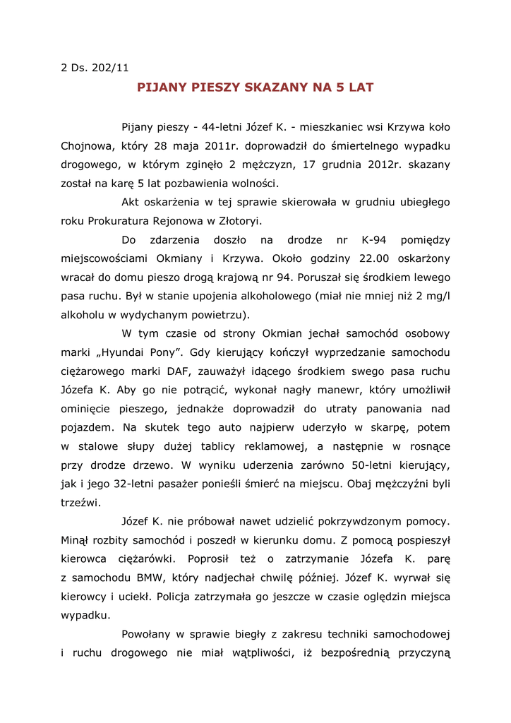2 Ds. 202/11 PIJANY PIESZY SKAZANY NA 5 LAT Pijany pieszy - 44-letni Józef K. - mieszkaniec wsi Krzywa koło Chojnowa, który 28 maja 2011r. doprowadził do śmiertelnego wypadku drogowego, w którym zginęło 2 mężczyzn, 17 grudnia 2012r. skazany został na karę 5 lat pozbawienia wolności. Akt oskarżenia w tej sprawie skierowała w grudniu ubiegłego roku Prokuratura Rejonowa w Złotoryi. Do zdarzenia doszło na drodze nr K-94 pomiędzy miejscowościami Okmiany i Krzywa. Około godziny 22.00 oskarżony wracał do domu pieszo drogą krajową nr 94. Poruszał się środkiem lewego pasa ruchu. Był w stanie upojenia alkoholowego (miał nie mniej niż 2 mg/l alkoholu w wydychanym powietrzu). W tym czasie od strony Okmian jechał samochód osobowy marki „Hyundai Pony”. Gdy kierujący kończył wyprzedzanie samochodu ciężarowego marki DAF, zauważył idącego środkiem swego pasa ruchu Józefa K. Aby go nie potrącić, wykonał nagły manewr, który umożliwił ominięcie pieszego, jednakże doprowadził do utraty panowania nad pojazdem. Na skutek tego auto najpierw uderzyło w skarpę, potem w stalowe słupy dużej tablicy reklamowej, a następnie w rosnące przy drodze drzewo. W wyniku uderzenia zarówno 50-letni kierujący, jak i jego 32-letni pasażer ponieśli śmierć na miejscu. Obaj mężczyźni byli trzeźwi. Józef K. nie próbował nawet udzielić pokrzywdzonym pomocy. Minął rozbity samochód i poszedł w kierunku domu. Z pomocą pospieszył kierowca ciężarówki. Poprosił też o zatrzymanie Józefa K. parę z samochodu BMW, który nadjechał chwilę później. Józef K. wyrwał się kierowcy i uciekł. Policja zatrzymała go jeszcze w czasie oględzin miejsca wypadku. Powołany w sprawie biegły z zakresu techniki samochodowej i ruchu drogowego nie miał wątpliwości, iż bezpośrednią przyczyną wypadku było zachowanie Józefa K., który pomimo pobocza umożliwiającego mu swobodne poruszanie się, szedł lewym pasem ruchu z dala od krawędzi jezdni. Takie samo stanowisko podzielił Sąd Rejonowy w Złotoryi skazując Józefa K. na karę 5 lat pozbawienia wolności. Józef K. jako podejrzany nie przyznał się do popełnienia przestępstwa. Skorzystał z prawa do odmowy składania wyjaśnień. Zasłonił się niepamięcią okoliczności wypadku. Józefowi K. groziła kara od 9 miesięcy do 12 lat pozbawienia wolności. Prokurator wyrok 5 lat więzienia ocenił jako słuszny.