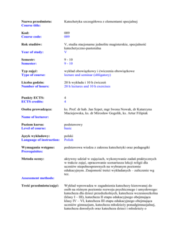 Nazwa przedmiotu: Course title: Katechetyka szczegółowa z elementami specjalnej Kod: Course code: 089 089 Rok studiów: Year of study: V, studia stacjonarne jednolite magisterskie, specjalność katechetyczno-pastoralna V Semestr: Semester: 9 - 10 9 - 10 Typ zajęć: Type of course: wykład obowiązkowy i ćwiczenia obowiązkowe lecture and seminar (obligatory) Liczba godzin: Number of hours: 20 h wykładu i 10 h ćwiczeń 20 h lectures and 10 h exercises Punkty ECTS: ECTS credits: 4 4 Osoba prowadząca: ks. Prof. dr hab. Jan Szpet, mgr Iwona Nowak, dr Katarzyna Maciejewska, ks. dr Mirosław Gogolik, ks. Artur Filipiak Name of lecturer: Poziom kursu: Level of course: podstawowy basic Język wykładowy: Language of instruction: polski Polish Wymagania wstępne: Prerequisites: podstawowa wiedza z zakresu katechetyki oraz pedagogiki Metoda oceny: aktywny udział w zajęciach, wykonywanie zadań praktycznych w trakcie zajęć, opracowanie scenariusza lekcji religii dla uczniów niepełnosprawnych na wybranym poziomie edukacyjnym. Znajomość treści wykładanych – zaliczenie wg tez. Assessment methods: Treść przedmiotu/zajęć: Wykład wprowadza w zagadnienia katechezy kierowanej do osób na róŜnym poziomie rozwoju psychicznego i umysłowego: katecheza dla dzieci przedszkolnych, katecheza wczesnoszkolna (klasy I – III), katecheza II etapu edukacyjnego obejmująca klasy IV – VI, katecheza III etapu edukacyjnego obejmująca uczniów gimnazjum, katecheza młodzieŜy ponadgimnazjalnej, katecheza dorosłych oraz katecheza dzieci i młodzieŜy o specjalnych potrzebach edukacyjnych (surdo-, tyflo- i oligokatecheza) Course contents: Cele i efekty kształcenia: student: 1) zna podstawowe pojęcia pedagogiki specjanej, rozwoju psycho-fizycznego, 2) potrafi wymienić najwaŜniejsze rodzaje niepełnosprawności i opisać ich symptomatologię, 3) zna metodykę nauczania na danym etapie edukacyjnym i nauczania specjalnego, 4) samodzielnie przygotowuje scenariusz lekcji, potrafi właściwie zastosować metody i środki dydaktyczne. Objectives and learning outcomes: Zalecana literatura: Dykcik W., (red.), Pedagogika specjalna, UAM Poznań 2000. Hulek A., (red.), Pedagogika rewalidacyjna, PWN, Warszawa 1988. Katechizm dla dorosłych, Polska adaptacja katechizmu Kościoła Katolickiego, Kraków 1999. Lausch K., Teoretyczne podstawy katechizacji osób głębiej upośledzonych umysłowo, ATK, Warszawa 1987. Misiaszek K., (red.), Katecheza dorosłych we wspólnocie Kościoła, Warszawa 2002. Muskus D. A., Szkoła środowiskiem katechetycznym, Kraków 1999. Obuchowska J., Dziecko niepełnosprawne w rodzinie, WSiP, Warszawa 1999. Rozen B., Katecheza specjalna, Olsztyn 2003. Stala J., (red.), Dzisiejszy bierzmowany, Kielce 2005. Stala J., (red.), Dzisiejszy katechizowany, stan aktualny i wyzwania, Kraków 2002. Stala J., (red.), Katechetyka szczegółowa, Tarnów 2003. Szpet J., Dydaktyka katechezy, Poznań 1999. ŚnieŜyński M., (red.) Pedagogika w katechezie, Kraków 1998. Recommended reading: KALKULACJA NAKŁADU PRACY STUDENTA: 1. Godziny kontaktowe (łącznie ilość godzin wykładów i ćwiczeń): 30 h = 1 pkt. ECTS 2. Czytanie zadanych lektur: 30 h 3. Samodzielne przygotowanie do ćwiczeń: 20 h 4. Praca w grupie nad róŜnymi zagadnieniami badawczymi: 10 h 5. Przygotowanie do zaliczenia: 30 h Razem: 120 h = 4 pkt. ECTS
