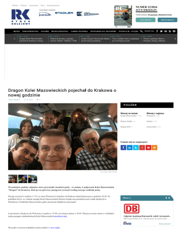 Reklama Redakcja Prenumerata Praca Katalog kolejowy NUMER 12/2016 JUŻ W SPRZEDAŻY PARTNERZY SERWISU: Temat numeru: Ekspansja chińskich kolei SPIS TREŚCI BIZNES INFRASTRUKTURA PASAŻER Dziś - 10:39 PRAWO I POLITYKA TABOR I TECHNIKA Dziś - 10:21 Dragon Kolei Mazowieckich pojechał do Krakowa o nowej... Podróż do Krynicy o godzinę krótsza. Debiut "Nikifora" KMŁ ZINTEGROWANY TRANSPORT Dziś - 10:00 ŚLEDŹ NAS: INNOWACJE # WĄTKI Dziś - 08:55 Lesław Kuzaj: Chorzowski Alstom przed szansą produkcji... PRENUMERATA Dziś - 08:00 Nowy rozkład: Start ze spokojem po wczorajszej awarii Więcej wspólnego biletu w Poznaniu. Koleją z biletem... Dragon Kolei Mazowieckich pojechał do Krakowa o nowej godzinie Jakub Madrjas 11.12.2016 0 PASAŻER Wiecej na temat: Wiecej z regionu: Koleje Mazowieckie (1105) Warszawa (1994) Dariusz Grajda (13) Kraków (372) Dragon KM (2) mazowieckie (319) Podziel się ze znajomymi: Fot. Koleje Mazowieckie Wcześniejsze godziny odjazdu i nowe przystanki i komfort jazdy – to zmiany w połączeniu Kolei Mazowieckich "Dragon” do Krakowa. Dziś po raz pierwszy pociąg ten wyruszył według nowego rozkładu jazdy. Pociąg wyruszył w podróż o 7.25, ze stacji Warszawa Centralna, do Krakowa dotarł planowano o godzinie 10.20. Na pokładzie był m. in. członek zarządu Kolei Mazowieckich Dariusz Grajda oraz przedstawiciele władz lokalnych w Miechowie i Grodzisku Mazowieckim, gdzie utworzono dodatkowe przystanki. Z powrotem z Krakowa do Warszawy wyjedzie o 15.48 a na miejsce dotrze o 18.46. Więcej na temat zmian w rozkładzie jazdy pociągów dalekobieżnych Kolei Mazowieckich pisaliśmy tutaj. PRACA I nżynier budowy/kierownik robót torowych… DB Cargo Polska S.A. oferuje pracę na stanowisku: … Więcej ogłoszeń Wszystko o nowym rozkładzie można znaleźć w tym wątku. Wiesz na ten temat więcej? Napisz do nas. PODZIEL SIĘ TYM Z INNYMI: Więcej na temat: Więcej z regionu: Koleje Mazowieckie (1105) Warszawa (1994) Dariusz Grajda (13) Kraków (372) Dragon KM (2) mazowieckie (319) Lesław Kuzaj: Chorzowski Alstom przed szansą produkcji szybkich Wystartował nowy pociągów (film) rozkład Pierwszy pociąg na Fabrycznym. Zdanowska: To przyszłość miasta Usunęła żylaki domowym sposobem! Czytaj dalej... KATALOG KOLEJOWY Sponsorowane + Dodaj firmę Zobacz katalog KOMENTARZE WSZYSTKIE Dominik Lebda - redaktor portalu Rynek Kolejowy Czy pociągiem można podróżować tylko dla krajobrazów? Tomasz Poręba - europoseł... Poręba: Narzucenie limitów hałasu ograniczy konkurencyjność kolei Michał Litwin - sekretarz Związk... Rozwój transportu rzecznego to dublowanie możliwości kolei Wojciech Suchorzewski - Prof. zwycz., kierowni... Suchorzewski: Miasta wiedzą, jak walczyć z zanieczyszczeniem powietrza ZOBACZ TEŻ: WYDARZENIA Wkrótce przetarg na nowe ezt dla Kolei Mazowieckich. Łącznie na 71 pojazdów Znaczenie P+R w liczbie pasażerów KM 29 Koleje Mazowieckie przewożą wracających pielgrzymów z ŚD M 11 Pierwszy pociąg specjalny KM odjechał do Krakowa POLECANE WIADOMOŚCI Warszawa, 11.01.2017 - Komisje kolejowe: zadania obowiązki - doświadczenia - dobre praktyki > 6 Więcej wydarzeń BĄDŹ NA BIEŻĄCO: Śledź nasze wiadomośc i : Dragon Kolei Mazowieckich pojechał do Krakowa o nowej godzinie 0 Zapisz się do newslettera: Pasażer Wcześniejsze godziny odjazdu i nowe przystanki i komfort jazdy – to zmiany w połączeniu Kolei Mazowieckich "Dragon” do Krakowa. Dziś po raz pierwszy pociąg ten wyruszył... P o d a n i e a d r e s u e - m a i l o r a z w c iśn ięc i e ‘ O K ’ j e s t r ó w n o z n a c z n e z w y r aże n i e m z g o d y n a : Zewnętrzni maszyniści za drodzy dla Intercity p r z e s yła n i e p r z e z Z e s p ół D o r a d c ó w G o s p o d a r c z y c h T O R sp. z o. o. z siedzibą w W a r s z a w i e , a d r e s : P l . B a n k o w y 2, 00-095 Warszawa na podany adres e-mail n e w s l e t t e r ó w z a w i e r a jąc y c h i n f o r m a c j e b r a nżo w e , marketingowe oraz handlowe. p r z e s yła n i e p r z e z Z e s p ół D o r a d c ó w G o s p o d a r c z y c h T O R sp. z o. o. z siedzibą w W a r s z a w i e , a d r e s : P l . B a n k o w y 2, 00-095 Warszawa (dalej: TOR), na podany adres em a i l i n f o r m a c j i h a n d l o w y c h p o c h o d ząc y c h o d i n n y c h n iż TOR podmiotów. 116 Biznes Przewoźnik połączeń dalekobieżnych poszukiwał osób do pociągowej i pozapociągowej obsługi trakcyjnej na rzecz PKP Intercity. Spółka szukała ich w firmach zewnętrznych, które na... Prezesem Solarisa znów… Solange Olszewska P o d a n i e a d r e s u e m a i l o r a z w y r aże n i e z g o d y j e s t c ałk o w i c i e d o b r o w o l n e . P o d a jąc e m u p r z y słu g u j e p r a w o d o w g ląd u w s w o j e d a n e o s o b o w e p r z e t w a r z a n e p r z e z Z e s p ół D o r a d c ó w G o s p o d a r c z y c h T O R s p . z o . o . z s i e d z i bą w W a r s z a w i e , a d r e s : Pl. Bankowy 2, 00-095 Warszawa oraz ich poprawiania. 112 Prawo i polityka Po blisko dwóch latach nastąpiła zmiana na stanowisku prezesa firmy Solaris Bus & Coach. Andreasa Streckera zastąpiła… Solange Olszewska, która już wcześniej kierowała... Paczkowska: Mniej środków na infrastrukturę po 2020 r. 7 Kongres Kolejowy Fundusze unijne niewykorzystane w obecnej perspektywie budżetowej przepadną – ostrzegła na Kongresie Kolejowym dr Aleksandra... Lublin: Skomunikowania w ruchu regionalnym 16 Pasażer Już od niedzieli zacznie obowiązywać nowy rozkład jazdy pociągów. W województwie lubelskim postępuje „cięcie relacji” w ruchu regionalnym, postanowiliśmy zatem przyjrzeć... KD szukają imienia dla swojego modernizowanego EN57 66 Tabor i technika Trwa naprawa jednego składu EN57-1703, który Koleje Dolnośląskie posłały do modernizacji. Wraz z odświeżeniem pojazdu przewoźnik zdecydował się na... POLREGIO. OTO NOWE LOGO I MALATURA MAR