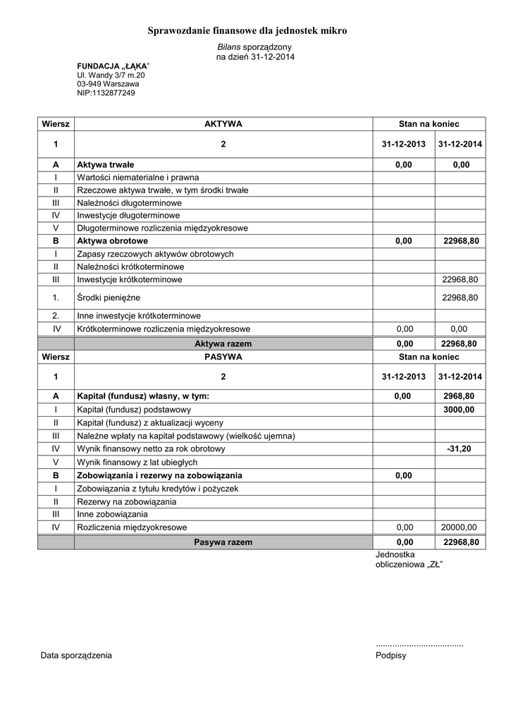 Sprawozdanie finansowe dla jednostek mikro Bilans sporządzony na dzień 31-12-2014 FUNDACJA „ŁĄKA” Ul. Wandy 3/7 m.20 03-949 Warszawa NIP:1132877249 Wiersz AKTYWA 1 2 Stan na koniec 31-12-2013 31-12-2014 0,00 0,00 0,00 22968,80 A Aktywa trwałe I II III IV V Wartości niematerialne i prawna Rzeczowe aktywa trwałe, w tym środki trwałe Należności długoterminowe Inwestycje długoterminowe Długoterminowe rozliczenia międzyokresowe B Aktywa obrotowe I II III Zapasy rzeczowych aktywów obrotowych Należności krótkoterminowe Inwestycje krótkoterminowe 22968,80 1. Środki pieniężne 22968,80 2. Inne inwestycje krótkoterminowe IV Krótkoterminowe rozliczenia międzyokresowe 0,00 0,00 Aktywa razem 0,00 22968,80 Wiersz PASYWA 1 2 A Kapitał (fundusz) własny, w tym: I Kapitał (fundusz) podstawowy 31-12-2013 31-12-2014 0,00 2968,80 3000,00 II Kapitał (fundusz) z aktualizacji wyceny III Należne wpłaty na kapitał podstawowy (wielkość ujemna) IV Wynik finansowy netto za rok obrotowy V Wynik finansowy z lat ubiegłych B Zobowiązania i rezerwy na zobowiązania I Zobowiązania z tytułu kredytów i pożyczek II III Rezerwy na zobowiązania Inne zobowiązania IV Rozliczenia międzyokresowe -31,20 0,00 0,00 Pasywa razem Data sporządzenia Stan na koniec 20000,00 0,00 22968,80 Jednostka obliczeniowa „ZŁ” ..................................... Podpisy FUNDACJA „ŁĄKA” Ul. Wandy 3/7 m.20 03-949 Warszawa NIP:1132877249 Rachunek zysków i strat za okres od 30.05.2014 do 31-12-2014 pierwszy rok podatkowy) Rachunek zysków i strat na podstawie załącznika nr 4 ustawy o rachunkowości dla mikrojednostek prowadzących działalność gospodarczą Wyszczególnienie 2 Pozycja 1 Kwota za rok poprzedni Kwota za rok bieżący 3 4 0,00 5000,00 I. Przychody podstawowej działalności operacyjnej i zrównane z nimi, w tym zmiana stanu produktów (zwiększenie – wartość dodatnia, zmniejszenie – wartość ujemna) Przychody z działalności pożytku publicznego i zrównane z nimi: 1. Przychody z nieodpłatnej działalności pożytku publicznego 2. Przychody z odpłatnej działalności pożytku publicznego, w tym zmiana stanu produktów (zwiększenie – wartość dodatnia, zmniejszenie – wartość ujemna) II. Przychody z działalności gospodarczej i zrównane z nimi, w tym zmiana stanu produktów (zwiększenie – wartość dodatnia, zmniejszenie – wartość ujemna B. Koszty podstawowej działalności operacyjnej I. Koszty działalności pożytku publicznego 5031,20 1. Koszty nieodpłatnej działalności pożytku publicznego 5031,20 a) Amortyzacja b) Zużycie materiałów i energii 950,00 c) Wynagrodzenia oraz ubezpieczenia społeczne i inne świadczenia 3590,00 d) Pozostałe koszty 491,20 2. Koszty odpłatnej działalności pożytku publicznego a) Amortyzacja b) Zużycie materiałów i energii c) Wynagrodzenia oraz ubezpieczenia społeczne i inne świadczenia d) Pozostałe koszty II. Koszty działalności gospodarczej 1. Amortyzacja 2. Zużycie materiałów i energii 3. Wynagrodzenia oraz ubezpieczenia społeczne i inne świadczenia 4. Pozostałe koszty C. Pozostałe przychody i zyski, w tym aktualizacja wartości aktywów 0,00 0,00 D. E. Pozostałe koszty i straty, w tym aktualizacja wartości aktywów Podatek dochodowy 0,00 0,00 0,00 0,00 F. Zysk/strata netto (jednostka prowadząca działalność gospodarczą) 0,00 -31,20 A. Data sporządzenia: 5000,00 5000,00 0,00 5031,20 0,00 0,00 Podpisy : FUNDACJA „ŁĄKA” Ul. Wandy 3/7 m.20 03-949 Warszawa NIP:1132877249 Informacje ogólne: 1) Fundacja „Łąka”, ul. Wandy 3/7 m.20, 03-949 Warszawa ; KRS:0000511332 NIP 1132877249, REGON 147268510, 2) Fundacja została ustanowiona na czas nieokreślony, 3) Sprawozdanie finansowe fundacji obejmuje okres od 30.05.2014 do 31.12.2014 (pierwszy rok podatkowy fundacji) 4) Zastosowanych zasad rachunkowości wynikających z Ustawa z dnia 29 września 1994 r. o rachunkowości ( Dz. U. z 2013 r. poz. 330, 613, z 2014 r. poz. 768, 1100, z 2015 r ), przewidzianych dla jednostek mikro. 5) Sprawozdanie finansowe fundacji sporządzono przy założeniu kontynuowania działalności przez co najmniej 12 kolejnych miesięcy i dłużej. Nie są nam znane okoliczności, które wskazywałyby na poważne zagrożenia dla kontynuowania przez fundacje działalności. 6) Fundacja przy przedstawianiu sytuacji majątkowej i finansowej, stosuje zasady rachunkowości określone Ustawa z dnia 29 września 1994 r. o rachunkowości ( Dz. U. z 2013 r. poz. 330, 613, z 2014 r. poz. 768, 1100, z 2015 r ) Zdarzenia, w tym operacje gospodarcze ujmuje w księgach rachunkowych i wykazuje w sprawozdaniu finansowym zgodnie z ich treścią ekonomiczną. W księgach rachunkowych jednostki zostały ujęte przypadające na jej rzecz przychody i koszty zgodnie z zasadami memoriału i współmierności. -Aktywa i pasywa wyceniane wg. zasad określonych w Ustawa z dnia 29 września 1994 r. o rachunkowości ( Dz. U. z 2013 r. poz. 330, 613, z 2014 r. poz. 768, 1100, z 2015 r ). -Fundacja nie posiada środków trwałych oraz wartości niematerialnych i prawnych. -Fundacja nie posiada zapasów. -Należności krótkoterminowe nie występują. -Zobowiązania nie występują. -Rozliczenia międzyokresowe wykazane w kwocie : 20 000 zł Dotację FDP przyznana dnia 2014-12-22 na projekt 'Wieś w mieście to nie obciach' Europejski Fundusz Rozwoju Wsi Polskiej- realizacja projektu przewidziana w 2015 r. FUNDACJA „ŁĄKA” Ul. Wandy 3/7 m.20 03-949 Warszawa NIP:1132877249 Informacje uzupełniające do bilansu: 1) Fundacja nie posiada żadnych zobowiązań finansowych, w tym z tytułu dłużnych instrumentów finansowych, gwarancji i poręczeń lub zobowiązań warunkowych nieuwzględnionych w bilansie, ze wskazaniem charakteru i formy wierzytelności zabezpieczonych rzeczowo. 2) Fundacja nie udzieliła pożyczki ani innego świadczenia o podobnym charakterze członkom organów zarządzających i nadzorujących. 3) Fundacja nie posiada udzi