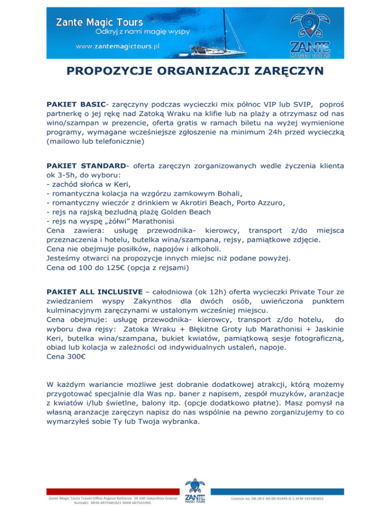 PROPOZYCJE ORGANIZACJI ZARĘCZYN PAKIET BASIC- zaręczyny podczas wycieczki mix północ VIP lub SVIP, poproś partnerkę o jej rękę nad Zatoką Wraku na klifie lub na plaży a otrzymasz od nas wino/szampan w prezencie, oferta gratis w ramach biletu na wyżej wymienione programy, wymagane wcześniejsze zgłoszenie na minimum 24h przed wycieczką (mailowo lub telefonicznie) PAKIET STANDARD- oferta zaręczyn zorganizowanych wedle życzenia klienta ok 3-5h, do wyboru: - zachód słońca w Keri, - romantyczna kolacja na wzgórzu zamkowym Bohali, - romantyczny wieczór z drinkiem w Akrotiri Beach, Porto Azzuro, - rejs na rajską bezludną plażę Golden Beach - rejs na wyspę „żółwi” Marathonisi Cena zawiera: usługę przewodnika- kierowcy, transport z/do miejsca przeznaczenia i hotelu, butelka wina/szampana, rejsy, pamiątkowe zdjęcie. Cena nie obejmuje posiłków, napojów i alkoholi. Jesteśmy otwarci na propozycje innych miejsc niż podane powyżej. Cena od 100 do 125€ (opcja z rejsami) PAKIET ALL INCLUSIVE – całodniowa (ok 12h) oferta wycieczki Private Tour ze zwiedzaniem wyspy Zakynthos dla dwóch osób, uwieńczona punktem kulminacyjnym zaręczynami w ustalonym wcześniej miejscu. Cena obejmuje: usługę przewodnika- kierowcy, transport z/do hotelu, do wyboru dwa rejsy: Zatoka Wraku + Błękitne Groty lub Marathonisi + Jaskinie Keri, butelka wina/szampana, bukiet kwiatów, pamiątkową sesje fotograficzną, obiad lub kolacja w zależności od indywidualnych ustaleń, napoje. Cena 300€ W każdym wariancie możliwe jest dobranie dodatkowej atrakcji, którą możemy przygotować specjalnie dla Was np. baner z napisem, zespół muzyków, aranżacje z kwiatów i/lub świetlne, balony itp. (opcje dodatkowo płatne). Masz pomysł na własną aranżacje zaręczyn napisz do nas wspólnie na pewno zorganizujemy to co wymarzyłeś sobie Ty lub Twoja wybranka.