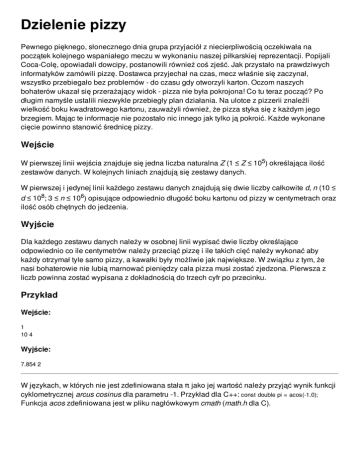 Dzielenie pizzy Pewnego pięknego, słonecznego dnia grupa przyjaciół z niecierpliwością oczekiwała na początek kolejnego wspaniałego meczu w wykonaniu naszej piłkarskiej reprezentacji. Popijali Coca-Colę, opowiadali dowcipy, postanowili również coś zjeść. Jak przystało na prawdziwych informatyków zamówili pizzę. Dostawca przyjechał na czas, mecz właśnie się zaczynał, wszystko przebiegało bez problemów - do czasu gdy otworzyli karton. Oczom naszych bohaterów ukazał się przerażający widok - pizza nie była pokrojona! Co tu teraz począć? Po długim namyśle ustalili niezwykle przebiegły plan działania. Na ulotce z pizzerii znaleźli wielkość boku kwadratowego kartonu, zauważyli również, że pizza styka się z każdym jego brzegiem. Mając te informacje nie pozostało nic innego jak tylko ją pokroić. Każde wykonane cięcie powinno stanowić średnicę pizzy. Wejście W pierwszej linii wejścia znajduje się jedna liczba naturalna Z (1 ≤ Z ≤ 105) określająca ilość zestawów danych. W kolejnych liniach znajdują się zestawy danych. W pierwszej i jedynej linii każdego zestawu danych znajdują się dwie liczby całkowite d, n (10 ≤ d ≤ 108; 3 ≤ n ≤ 106) opisujące odpowiednio długość boku kartonu od pizzy w centymetrach oraz ilość osób chętnych do jedzenia. Wyjście Dla każdego zestawu danych należy w osobnej linii wypisać dwie liczby określające odpowiednio co ile centymetrów należy przeciąć pizzę i ile takich cięć należy wykonać aby każdy otrzymał tyle samo pizzy, a kawałki były możliwie jak największe. W związku z tym, że nasi bohaterowie nie lubią marnować pieniędzy cała pizza musi zostać zjedzona. Pierwsza z liczb powinna zostać wypisana z dokładnością do trzech cyfr po przecinku. Przykład Wejście: 1 10 4 Wyjście: 7.854 2 W językach, w których nie jest zdefiniowana stała π jako jej wartość należy przyjąć wynik funkcji cyklometrycznej arcus cosinus dla parametru -1. Przykład dla C++: const double pi = acos(-1.0); Funkcja acos zdefiniowana jest w pliku nagłówkowym cmath (math.h dla C).