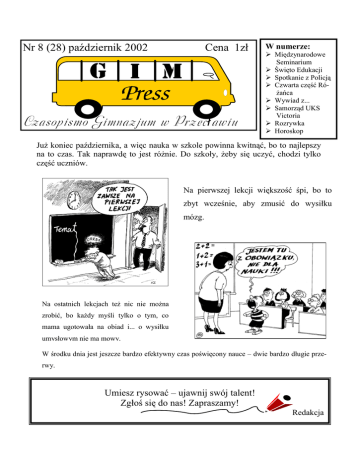 Nr 8 (28) październik 2002 Cena 1zł Czasopismo Gimnazjum w Prz ec ł awiu W numerze: Międzynarodowe Seminarium Święto Edukacji Spotkanie z Policją Czwarta część Różańca Wywiad z... Samorząd UKS Victoria Rozrywka Horoskop Już koniec października, a więc nauka w szkole powinna kwitnąć, bo to najlepszy na to czas. Tak naprawdę to jest różnie. Do szkoły, żeby się uczyć, chodzi tylko część uczniów. Na pierwszej lekcji większość śpi, bo to zbyt wcześnie, aby zmusić do wysiłku mózg. Na ostatnich lekcjach też nic nie można zrobić, bo każdy myśli tylko o tym, co mama ugotowała na obiad i... o wysiłku umysłowym nie ma mowy. W środku dnia jest jeszcze bardzo efektywny czas poświęcony nauce – dwie bardzo długie przerwy. Umiesz rysować – ujawnij swój talent! Zgłoś się do nas! Zapraszamy! Redakcja Czasopismo Gimnazjum w Przecławiu Str. 2 Międzynarodowe Seminarium w Czudcu W dniach 09 – 13.10.2002 w Czudcu odbyło się seminarium kontaktowe, celem którego była pomoc gimnazjom z województwa podkarpackiego w znalezieniu partnerskich szkół europejskich chętnych do realizacji wspólnego projektu w ramach programu Socrates-Comenius. W seminarium wzięli udział przedstawiciele 15 polskich gimnazjów i kilkunastu szkół z Niemiec, Włoch, Francji, Danii i Cypru. Naszą szkołę reprezentowały: pani dyrektor mgr Barbara Dybska oraz uczące języka angielskiego – pani mgr Barbara Kapusta i pani Krystyna Haracz. Uczestnicy seminarium brali udział w spotkaniach integracyjnych oraz warsztatach w ośrodku i w plenerze. Nasze gimnazjum zaprezentowało ekspozycję składającą się ze zdjęć ukazujących migawki z życia szkoły i regionu, płyt CD i folderów reklamujących szkołę, kroniki szkolnej i przykładowych egzemplarzy gazetek szkolnych (część ekspozycji można oglądać przed wejściem na salę gimnastyczną). Foldery przygotowane przez naszych uczniów w języku angielskim rozchodziły się jak świeże bułeczki. Każdy obcokrajowiec otrzymał pamiątki – płytę CD, foldery, serca i ciastka odpustowe. Kołacz, który również stanowił element ekspozycji stał się naszym wkładem w uroczystą kolację podczas Wieczoru Europejskiego. Duże zaangażowanie i zapał uczestników seminarium sprzyjały nawiązywaniu kontaktów i wymianie doświadczeń. Propozycje projektów były różnorodne i ciekawe. Goście z zagranicy korzystali z własnej przewagi, wiedząc, że polskim szkołom bardzo zależy na znalezieniu partnerów z Unii Europejskiej – jest to warunek rozpoczęcia projektu Comeniusa, dlatego też propozycje polskie musiały ustąpić zagranicznym. Nielicznym przedstawicielom podkarpackich gimnazjów udało się utworzyć zdecydowane grupy gotowe do rozpoczęcia prac nad projektami. Mamy nadzieję, że promocja naszej szkoły na tak szerokim forum i nawiązane kontakty międzynarodowe zaowocują podpisaniem umów i rozpoczęciem prac nad projektem, który wstępnie zatytułowaliśmy „Ocalić od zapomnienia”. Na podstawie informacji pani mgr Barbary Kapusty Ś więto Edukacji 15 października dla uczczenia Święta Edukacji Narodowej uczniowie naszej szkoły przygotowali audycję radiową, za pośrednictwem, której wyrazili wdzięczność swoim pedagogom i pracownikom szkoły. Wzięli w niej udział na- stępujący uczniowie: Anna Arciszewska, Aleksandra Betlej, Krzysztof Jemioło, Łucja Kopera, Magdalena Kozioł, Paulina Król, Katarzyna Ozimek, Krzysztof Piłat, Wioletta Pytel, Katarzyna Sajdak, Monika Tworek, Jerzy Wolak, Dorota Wójcik. Nasza praca wykonana pod kierunkiem pani mgr Doroty Wolak była miłym prezentem dla naszych nauczycieli, bo tak naprawdę, co byśmy bez Was – Nauczyciele robili. Chyba nie wszyscy wiedzą, że 17.10.2002r. w naszej szkole właśnie z okazji Święta Edukacji Narodowej odbyło się spotkanie nauczycieli i pracowników szkół z całej gminy. Gościliśmy około 200 osób, a wśród nich był podkar- GIMPRESS 8 (28) październik 2002 Czasopismo Gimnazjum w Przecławiu packi Kurator Oświaty pan Jan Kurp. Podczas tej uroczystości medale KOMISJI EDUKACJI NARODOWEJ otrzymały nasze panie dyrektorki mgr Barbara Dybska i Str. 3 mgr Joanna Remiszewska. Poza tym pani mgr Dorota Wolak za działalność związkową zastała nagrodzona Złotą Oznaką ZNP. Gratulujemy! Jest to z całą pewnością powód do dumy. Łucja Kopera Spotkanie z POLICJĄ Dnia 1 października 2002r. w porannych godzinach na małej sali gimnastycznej odbyła się prelekcja na temat zagrożeń we współczesnej szkole. Została ona wygłoszona dla uczniów naszego gimnazjum przez funkcjonariusza policji sierż. sztab. Stanisława Moździocha. Kolejno uczniowie klas drugich, trzecich i pierwszych zostali zapoznani z procedurą karną w razie typowych wykroczeń, takich jak: niszczenie mienia, gwałt, czyli wywieranie siły na drugim człowieku, wymuszanie pieniędzy, palenie papierosów, picie alkoholu i zażywanie lub posiadanie narkotyków. Uczniowie dowiedzieli się, że za zniszczone mienie będą musieli zapłacić ich rodzice, zaś w skrajnych przypadkach mogą za swój czyn odpowiadać przed sądem dla nieletnich. Temat prelekcji zaciekawił wszystkich, chwilami powiewało grozą, skutkiem tego na sali panował cisza i pełne skupienie. Na podst. informacji pani mgr Lucyny Augustyn Czwarta czę ś ć Róż ań ca 16 października 2002 roku Ojciec Święty Jan Paweł II w 24 rocznicę swego pontyfikatu listem apostolskim ustanowił czwartą część Różańca. Jest to część światła. Tak samo jak znane każdemu części wcześniejsze (radosna, bolesna, chwalebna) ma ona 5 tajemnic: 1. Chrzest Pana Jezusa w Jordanie. 2. Objawienie swojej osoby na weselu w Kanie. 3. Głoszenie Królestwa Bożego i wezwanie do nawrócenia. 4. Przemienienie na Górze Tabor. 5. Ustanowienie Eucharystii. Ojciec Święty zaleca, by czwarta część różańca była odmawiana w czwartek. W tym samym liście Jan Paweł II 