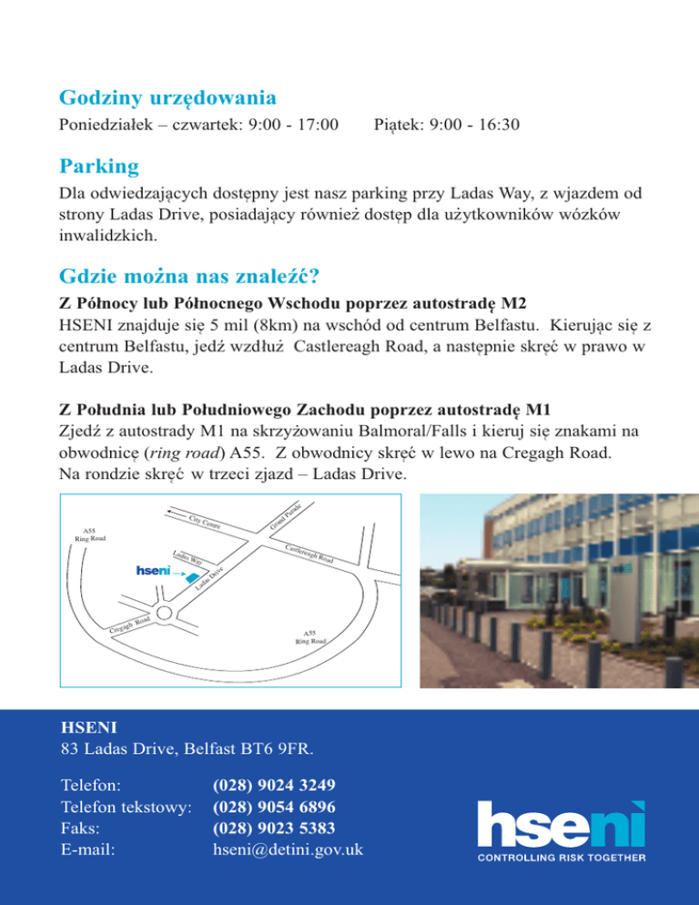 ¶ owania Godziny urze¶d Poniedzial/ek – czwartek: 9:00 - 17:00 Parking Piatek: ¶ 9:00 - 16:30 Dla odwiedzaja¶cych ¶ dostepny ¶ jest nasz parking przy Ladas Way, z wjazdem od . . strony Ladas Drive, posiadaja¶cy ¶ równiez doste¶p dla uzytkowników wózków inwalidzkich. . Gdzie mozna nas znaleźć? Z Pól/nocy lub Pól/nocnego Wschodu poprzez autostrade¶¶ M2 HSENI znajduje sie¶ 5 mil (8km) na wschód od centrum Belfastu. Kieruja¶c¶ sie¶ z . centrum Belfastu, jedź wzdl/uz Castlereagh Road, a naste¶pnie skre¶c´ w prawo w Ladas Drive. Z Pol/udnia lub Pol/udniowego Zachodu poprzez autostrade¶¶ M1 . Zjedź z autostrady M1 na skrzyzowaniu Balmoral/Falls i kieruj sie¶ znakami na obwodnice¶ (ring road) A55. Z obwodnicy skre´c¶ w lewo na Cregagh Road. Na rondzie skre´c¶ w trzeci zjazd – Ladas Drive. City A55 Ring Road Lad a Cen sW ay s da La nd Pa de ra Castl e reag h iv Dr e Roa d d oa h R gag Cre a Gr tre A55 Ring Road HSENI 83 Ladas Drive, Belfast BT6 9FR. Telefon: Telefon tekstowy: Faks: E-mail: (028) 9024 3249 (028) 9054 6896 (028) 9023 5383 [email protected] Bezpieczeństwo i Higiena Pracy dla Wszystkich Health and Safety for All Polish Potrzebujesz informacji i doradztwa? W celu uzyskania informacji oraz doradztwa na temat bezpieczeństwa i higieny pracy, zadzwoń na oferuja¶ca¶ indywidualne usl/ugi Infolinie¶ HSENI pod numerem 0800 0320 121. Dla osób, których je¶zykiem ojczystym nie jest jezyk ¶ angielski, pod numerem . / tym doste¶pne sa¶ równiez telefoniczne uslugi tlumaczeniowe . HSENI w 150 je¶zykach. Jez eli chcial/byś porozmawiać z kim´s w bardziej odpowiadaja¶¶cym Tobie jezyku, ¶ zadzwo´n na Infolinie¶ i podaj operatorowi je¶zyk, którym jesteś zainteresowany. . . Mozesz równiez odwiedzić strone¶ internetowa¶¶ HSENI, www.hseni.gov.uk lub Centrum Informacji i Doradztwa w Belfaście, które oferuje klientom szerokiego zakresu bezpl/atne ´ /a informacji na temat bezpieczeństwa i higieny pracy zródl (wie¶kszość informacji jest w jezyku ¶ angielskim, lecz cze´s´ ¶ c z nich . doste¶pna jest równiez w innych je¶zykach. Wie¶cej informacji na ten temat znajduje sie¶ na naszej stronie internetowej). Zaplecze Centrum obejmuje: • szeroki zakres material/ów podre¶cznych w formacie elektronicznym i tradycyjnym; . • wypozyczalnie¶ kaset wideo; • doste¶p do Internetu w celu wyszukiwania oraz, jeśli jest to konieczne, pobierania informacji na temat bezpieczeństwa i higieny pracy; • wybór bezpl/atnych publikacji HSENI oraz HSE do zabrania, l/acznie ¶ z Uniwersalna¶ Broszura¶ na temat Bezpieczeństwa, oparta¶ wyl/a¶cznie ¶ na obrazkach przedstawiajacych ¶ zagadnienia / bezpieczeństwa dla przemyslu budowlanego, kopalni odkrywkowych oraz rolnictwa. W przypadku pytań lub wa¶¶tpliwości, odwiedzaja¶cy ¶ be¶da¶ mieli . mozliwość odbycia rozmowy z Inspektorem, z wykorzystaniem . telefonicznych usl/ug tl/umaczeniowych, a takze zachowaniem . poufności wedle zyczenia. . ¶ Kto wprowadza w zycie prawo dotyczace bezpieczeństwa i higieny pracy w Irlandii Pól/nocnej? Inspekcja Bezpieczeństwa i Higieny Pracy w Irlandii Pól/nocnej (the Health and Safety Executive for Northern Ireland) jest organizacja¶¶ rza¶¶dowa¶ dzial/aja¶¶ca¶ na rzecz ochrony zdrowia pracowników, zachowania ich bezpieczeństwa oraz zapewnienia im dobrobytu poprzez dostarczanie . . informacji oraz doradztwa, a takze wprowadzanie w zycie prawa dotycza¶¶cego bezpieczeństwa i higieny pracy. Egzekwowanie prawa BHP . w obre¶bie określonych posesji wchodzi równiez w zakres obowia¶zków ¶ rad okre¶gowych. HSENI jest odpowiedzialna za bezpieczeństwo i higiene¶ pracy w naste¶pujacych ¶ obszarach zatrudnienia: • Fabryki • Tereny budowy • Kopalnie odkrywkowe • Zaklady chemiczne • Gospodarstwa rolne • Szkoly i uniwersytety / • Tereny wystawowe • Rady okre¶gowe • Ministerstwa rza¶¶dowe • Zaklady naprawy pojazdów mechanicznych / / • Obiekty rekreacyjne i rozrywkowe • Szpitale i domy spokojnej starości . . • Straz poz arna oraz policja W celu uzyskania szerszych informacji na temat odpowiedzialności za egzekwowanie prawa BHP, zadzwoń na oferuja¶¶ca¶ indywidualne usl/ugi Infolinie¶¶ HSENI pod numerem 0800 0320 121.