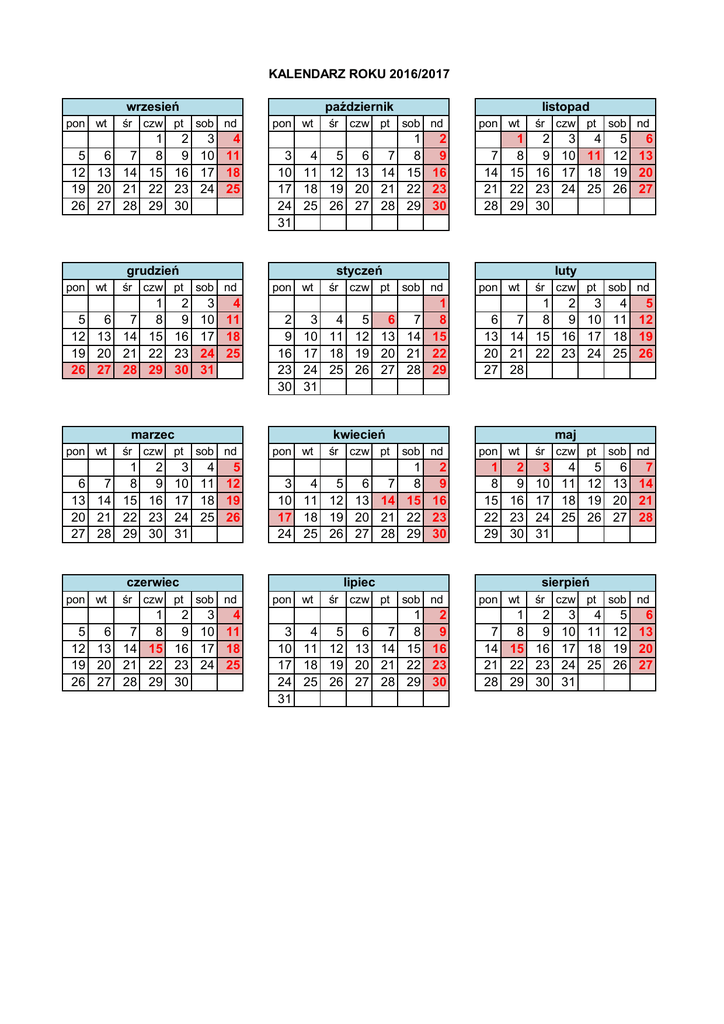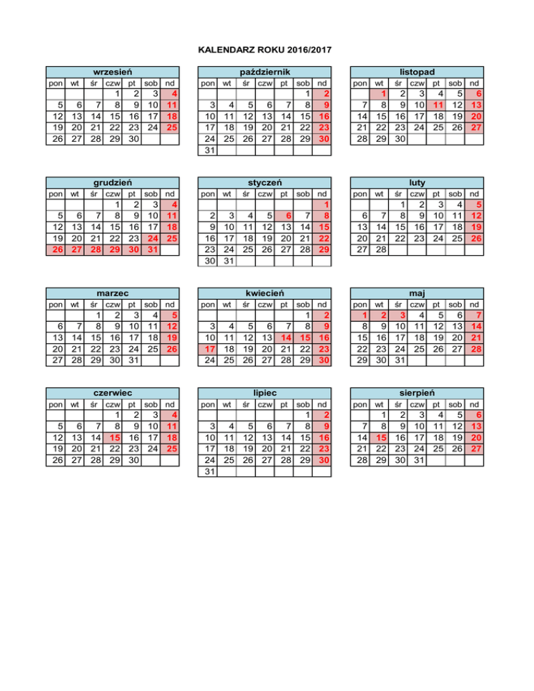 KALENDARZ ROKU 2016/2017 wrzesień pon wt śr czw pt 5 6 7 12 13 14 19 20 21 26 27 28 październik sob nd 1 2 3 4 8 9 10 11 15 16 17 18 22 23 24 25 29 30 pon wt 3 4 5 6 7 10 11 12 13 14 17 18 19 20 21 24 25 26 27 28 31 grudzień pon wt śr czw pt pon wt 2 9 16 23 30 6 7 13 14 20 21 27 28 1 2 3 4 5 8 9 10 11 12 15 16 17 18 19 22 23 24 25 26 29 30 31 śr czw pt 5 6 7 12 13 14 19 20 21 26 27 28 pon wt 7 14 21 28 śr czw pt pon wt śr czw pt 3 4 5 6 7 10 11 12 13 14 17 18 19 20 21 24 25 26 27 28 sob nd pon wt śr czw pt 3 4 5 6 7 10 11 12 13 14 17 18 19 20 21 24 25 26 27 28 31 sob nd luty sob nd pon wt śr czw pt sob nd 1 2 3 4 5 6 7 8 9 10 11 12 13 14 15 16 17 18 19 20 21 22 23 24 25 26 27 28 maj sob nd 1 2 8 9 15 16 22 23 29 30 pon wt śr czw pt sob nd 1 2 3 4 5 6 7 8 9 10 11 12 13 14 15 16 17 18 19 20 21 22 23 24 25 26 27 28 29 30 31 lipiec 1 2 3 4 8 9 10 11 15 16 17 18 22 23 24 25 29 30 śr czw pt 1 2 3 4 5 6 8 9 10 11 12 13 15 16 17 18 19 20 22 23 24 25 26 27 29 30 kwiecień sob nd czerwiec pon wt 1 2 8 9 15 16 22 23 29 30 1 3 4 5 6 7 8 10 11 12 13 14 15 17 18 19 20 21 22 24 25 26 27 28 29 31 marzec śr czw pt sob nd styczeń sob nd 1 2 3 4 5 6 7 8 9 10 11 12 13 14 15 16 17 18 19 20 21 22 23 24 25 26 27 28 29 30 31 pon wt śr czw pt listopad sierpień sob nd 1 2 8 9 15 16 22 23 29 30 pon wt 7 14 21 28 śr czw pt sob nd 1 2 3 4 5 6 8 9 10 11 12 13 15 16 17 18 19 20 22 23 24 25 26 27 29 30 31