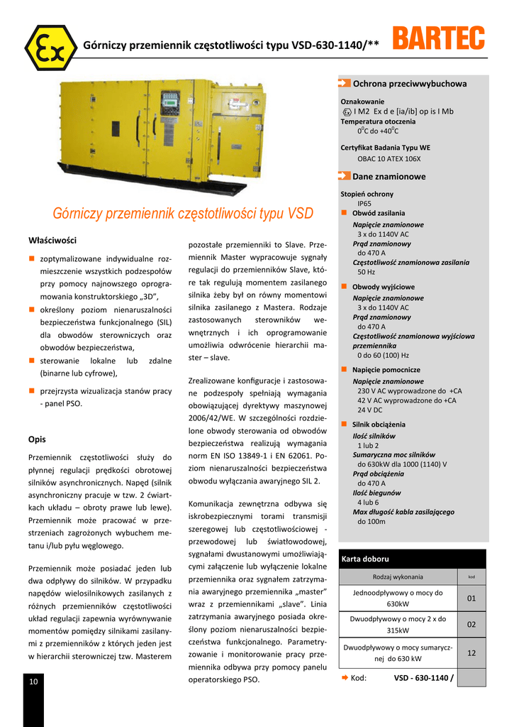 Górniczy przemiennik częstotliwości typu VSD-630-1140/** Ochrona przeciwwybuchowa Oznakowanie I M2 Ex d e [ia/ib] op is I Mb Temperatura otoczenia 00C do +400C Certyfikat Badania Typu WE OBAC 10 ATEX 106X Dane znamionowe Górniczy przemiennik częstotliwości typu VSD Właściwości zoptymalizowane indywidualne rozmieszczenie wszystkich podzespołów przy pomocy najnowszego oprogramowania konstruktorskiego „3D”, określony poziom nienaruszalności bezpieczeństwa funkcjonalnego (SIL) dla obwodów sterowniczych oraz obwodów bezpieczeństwa, sterowanie lokalne (binarne lub cyfrowe), lub zdalne przejrzysta wizualizacja stanów pracy - panel PSO. Opis Przemiennik częstotliwości służy do płynnej regulacji prędkości obrotowej silników asynchronicznych. Napęd (silnik asynchroniczny pracuje w tzw. 2 ćwiartkach układu – obroty prawe lub lewe). Przemiennik może pracować w przestrzeniach zagrożonych wybuchem metanu i/lub pyłu węglowego. Przemiennik może posiadać jeden lub dwa odpływy do silników. W przypadku napędów wielosilnikowych zasilanych z różnych przemienników częstotliwości układ regulacji zapewnia wyrównywanie momentów pomiędzy silnikami zasilanymi z przemienników z których jeden jest w hierarchii sterowniczej tzw. Masterem 10 pozostałe przemienniki to Slave. Przemiennik Master wypracowuje sygnały regulacji do przemienników Slave, które tak regulują momentem zasilanego silnika żeby był on równy momentowi silnika zasilanego z Mastera. Rodzaje zastosowanych sterowników wewnętrznych i ich oprogramowanie umożliwia odwrócenie hierarchii master – slave. Stopień ochrony IP65 Obwód zasilania Napięcie znamionowe 3 x do 1140V AC Prąd znamionowy do 470 A Częstotliwość znamionowa zasilania 50 Hz Obwody wyjściowe Napięcie znamionowe 3 x do 1140V AC Prąd znamionowy do 470 A Częstotliwość znamionowa wyjściowa przemiennika 0 do 60 (100) Hz Napięcie pomocnicze Zrealizowane konfiguracje i zastosowane podzespoły spełniają wymagania obowiązującej dyrektywy maszynowej 2006/42/WE. W szczególności rozdzielone obwody sterowania od obwodów bezpieczeństwa realizują wymagania norm EN ISO 13849-1 i EN 62061. Poziom nienaruszalności bezpieczeństwa obwodu wyłączania awaryjnego SIL 2. Komunikacja zewnętrzna odbywa się iskrobezpiecznymi torami transmisji szeregowej lub częstotliwościowej przewodowej lub światłowodowej, sygnałami dwustanowymi umożliwiającymi załączenie lub wyłączenie lokalne przemiennika oraz sygnałem zatrzymania awaryjnego przemiennika „master” wraz z przemiennikami „slave”. Linia zatrzymania awaryjnego posiada określony poziom nienaruszalności bezpieczeństwa funkcjonalnego. Parametryzowanie i monitorowanie pracy przemiennika odbywa przy pomocy panelu operatorskiego PSO. Napięcie znamionowe 230 V AC wyprowadzone do +CA 42 V AC wyprowadzone do +CA 24 V DC Silnik obciążenia Ilość silników 1 lub 2 Sumaryczna moc silników do 630kW dla 1000 (1140) V Prąd obciążenia do 470 A Ilość biegunów 4 lub 6 Max długość kabla zasilającego do 100m Karta doboru Rodzaj wykonania kod Jednoodpływowy o mocy do 630kW 01 Dwuodpływowy o mocy 2 x do 315kW 02 Dwuodpływowy o mocy sumarycznej do 630 kW 12 Kod: VSD - 630-1140 /