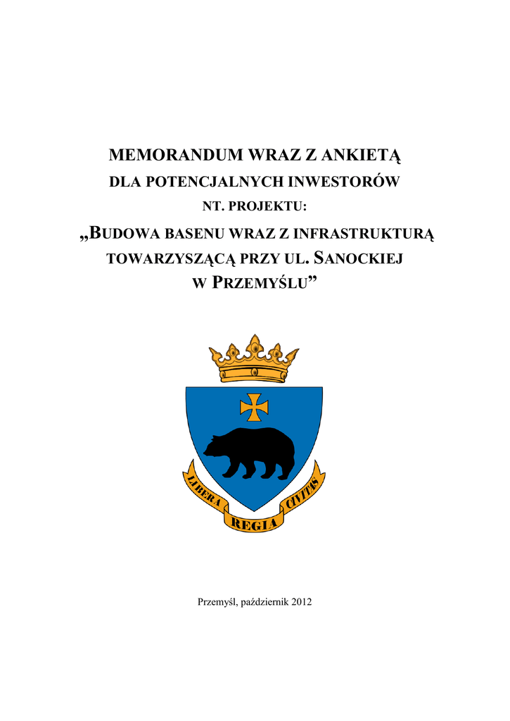 MEMORANDUM WRAZ Z ANKIETĄ DLA POTENCJALNYCH INWESTORÓW NT. PROJEKTU: „BUDOWA BASENU WRAZ Z INFRASTRUKTURĄ TOWARZYSZĄCĄ PRZY UL. SANOCKIEJ W PRZEMYŚLU” Przemyśl, październik 2012 Szanowni Państwo, Urząd Gminy Miejskiej Przemyśl planuje podjęcie działań, mających na celu poprawienie dostępności mieszkańców oraz turystów do nowoczesnej infrastruktury sportowo-rekreacyjnej poprzez realizację projektu pn. „Budowa basenu wraz z infrastrukturą towarzyszącą przy ul. Sanockiej w Przemyślu”. Przedsięwzięcie planowane jest do przeprowadzenia we współpracy z partnerem prywatnym. Niniejsza Ankieta stanowi element konsultacji rynkowych dla Przedsięwzięcia i przeprowadzana jest w celu rozpoznania zainteresowania inwestorów/partnerów prywatnych współpracą z Urzędem Gminy Miejskiej Przemyśl przy realizacji Przedsięwzięcia. W związku z powyższym, zapraszamy wszystkie podmioty zainteresowane udziałem w powyższym projekcie do wyrażenia opinii odnośnie założeń realizacji Przedsięwzięcia oraz wskazania propozycji współpracy w formie odpowiedzi na niniejszą ankietę. Odpowiedzi będą służyły doprecyzowaniu struktury Przedsięwzięcia realizowanego z udziałem inwestora prywatnego. Odpowiedzi nie są traktowane jako ostateczne stanowisko firmy. Wszystkie odpowiedzi będą traktowane jako informacje handlowe z zastrzeżeniem ich poufności i zostaną wykorzystane wyłącznie na cele realizacji niniejszego projektu. Urząd Gminy Miejskiej Przemyśl informuje, że istnieje możliwość zorganizowania spotkań z wybranymi potencjalnymi partnerami w celu przedstawienia założeń i warunków projektu oraz omówienia zaproponowanych odpowiedzi. Miasto Przemyśl jest otwarte na propozycje i gotowe do dyskusji na temat zarówno zakresu, jak i formuły realizacji Przedsięwzięcia. Odpowiedzi na niniejszą ankietę nie nadają inwestorowi prawa pierwszeństwa w trakcie postępowania przetargowego na wyłonienie inwestora ani jakichkolwiek innych przywilejów. Z tytułu przesłania Odpowiedzi nie przysługują inwestorowi jakiekolwiek roszczenia wobec Urzędu Miasta. Do odpowiedzi na niniejszą ankietę należy dołączyć oświadczenie, że podmiot zapoznał się z powyższymi warunkami i nie wnosi do nich żadnych zastrzeżeń. Odpowiedzi proszę przesyłać na adres: [email protected]. Licząc na owocną współpracę i wymianę uwag, pozostaję do Państwa dyspozycji, z poważaniem, Kacper Kozłowski Project Director Investment Support 2 LOKALIZACJA PROJEKTU Przemyśl jest trzecim pod względem liczby mieszkańców miastem w woj. podkarpackim (stolica województwa – Rzeszów – 180.031 mieszkańców, Stalowa Wola 64.756 mieszkańców, Przemyśl – 64.728 mieszkańców – stan na koniec 2011 r.). Jest miastem na prawach powiatu, oddalonym o 78 km na południowy wschód od Rzeszowa, koło którego zlokalizowany jest najbliższy międzynarodowy port lotniczy oraz o 12 km na zachód od granicy z Ukrainą. W obszarze oddziaływania planowanego projektu, w ramach 1 godziny dojazdu, mieszka około 400 tys. mieszkańców (powiat przemyski, powiat jarosławski, Miasto Przemyśl, powiat przeworski, część powiatu rzeszowskiego i sanockiego). W ramach pół godziny dojazdu obiekt będzie obejmował obszarem oddziaływania mieszkańców Przemyśla i powiatu przemyskiego (ok. 71 tys. mieszkańców) oraz część powiatu jarosławskiego (liczba mieszkańców powiatu wynosi około 122 tys.), jak i w mniejszym stopniu powiatów, położonych na południe od Przemyśla, co powinno przełożyć się na około 200 tys. mieszkańców w najbliższym obszarze oddziaływania. Po zakończeniu realizowanych inwestycji drogowych mieszkańcy Rzeszowa będą mogli dotrzeć do Przemyśla w czasie znacznie krótszym niż 1 godzina dojazdu, a liczba mieszkańców, znajdujących się w obszarze oddziaływania projektu zwiększy się o około 200 tys. Rysunek 1. Położenie Przemyśla na tle Polski oraz woj. podkarpackiego PRZEMYŚL Źródło: http://przemysl.bix.pl/ 3 W pobliżu znajduje się duże przejście graniczne w Medyce. Po stronie ukraińskiej najbliższym dużym ośrodkiem, położonym w odległości 96 km od Przemyśla, jest Lwów, którego liczba mieszkańców wynosi obecnie około 800 tys. przy aglomeracji wielkości około 1 mln mieszkańców. Samo miasto znajduje się na międzynarodowej trasie E4, łączącej Europę Zachodnią przez Niemcy i Polskę ze Wschodem. Zrealizowanie inwestycji drogowych znacznie skróci czas dotarcia mieszkańców Lwowa do Przemyśla. W 2011 r. z bazy noclegowej w Przemyślu skorzystało łącznie 42 926 turystów, w tym 7 974 turystów zagranicznych. Tylko na terenie samego Miasta funkcjonuje ogółem 19 obiektów noclegowych, w tym 10 skategoryzowanych. Do grupy obiektów skategoryzowanych należy: 9 hoteli: 5 hoteli ***, 3 hotele ** i 1 hotel * o łącznej liczbie miejsc noclegowych 679 1 Schronisko Młodzieżowe PTSM Matecznik kat. I. z 55 miejscami noclegowymi. Łącznie miasto Przemyśl dysponuje 933 miejscami noclegowymi. Z sąsiadującego z planowaną inwestycją stoku narciarskiego skorzystało w roku 2010 około 650 tys. osób. Otoczenie projektu obejmuje m.in. wspomniany wyżej stok narciarski, obsługiwany przez wyciągi, których dolna stacja znajduje się w bezpośrednim sąsiedztwie planowanego projektu, oczka wodne, stanowiące sezonową atrakcję, malownicza rzeka San oraz fortyfikacje Twierdzy Przemyśl. Jednocześnie rozważana lokalizacja znajduje się blisko historycznego centrum Przemyśla, zamku i innych atrakcji Miasta, które charakteryzuje się bogatą i unikalną na skalę Polski architekturą, przyciągającą coraz liczniejszą rzeszę turystów. Na obszarze Przemyśla funkcjonuje tylko jedna pływalnia, nie posiadająca żadnych atrakcji i jeden basen przyhotelowy. W ramach 30 min. jazdy autem znajduje się kolejna pływalnia. Nie ma obecnie planów realizacji obiektu o zbliżonej lub większej skali w n