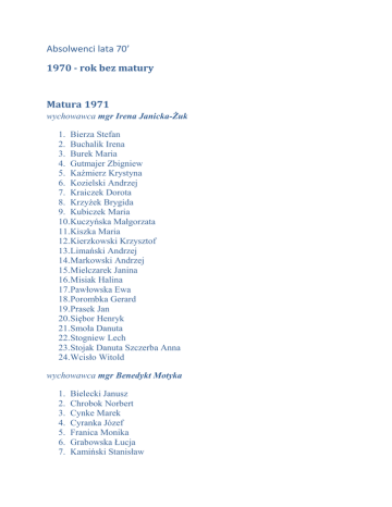 Absolwenci lata 70’ 1970 - rok bez matury Matura 1971 wychowawca mgr Irena Janicka-Żuk 1. Bierza Stefan 2. Buchalik Irena 3. Burek Maria 4. Gutmajer Zbigniew 5. Kaźmierz Krystyna 6. Kozielski Andrzej 7. Kraiczek Dorota 8. Krzyżek Brygida 9. Kubiczek Maria 10.Kuczyńska Małgorzata 11.Kiszka Maria 12.Kierzkowski Krzysztof 13.Limański Andrzej 14.Markowski Andrzej 15.Mielczarek Janina 16.Misiak Halina 17.Pawłowska Ewa 18.Porombka Gerard 19.Prasek Jan 20.Siębor Henryk 21.Smoła Danuta 22.Stogniew Lech 23.Stojak Danuta Szczerba Anna 24.Wcisło Witold wychowawca mgr Benedykt Motyka 1. 2. 3. 4. 5. 6. 7. Bielecki Janusz Chrobok Norbert Cynke Marek Cyranka Józef Franica Monika Grabowska Łucja Kamiński Stanisław 8. Kolar Aniela 9. Kopytko Ryszard 10.Krótki Marian 11.Kubiak Teresa 12.Mokry Stanisław 13.Niestrawska Aniela 14.Nowecka Jolanta 15.Podgórska Alina 16.Siwek Urszula 17.Szaparewicz Anna 18.Szuła Urszula 19.Wiktor Robert 20.Wilisz Brygida 21.Wójtowicz Krystyna 22.Ziębicki Krzysztof Matura 1972 wychowawca mgr Józef Koloska 1. Białdyga Norbert 2. Bury Czesław 3. Dik Jadwiga 4. Durajczyk Janusz 5. Gawlas Grażyna 6. Glenc Jolanta 7. Hnida Teresa 8. Himel Krystian 9. Kędzierska Czesława 10.Komnicz Paweł 11.Kraus Beata 12.Krzyżanek Andrzej 13.Kwaśnica Barbara 14.Malcharczyk Krystyna 15.Mizerska Anastazja 16.Mordeja Urszula 17.Myśliwiec Krystyna 18.Orszulka Piotr 19.Pientka Gabriela 20.Rajter Elżbieta 21.Rosina Maria 22.Sowa Teresa 23.Szramek Ryszard 24.ściborski Ryszard 25.Tatarczyk Sylwia 26.Urbańska Katarzyna 27.Wolnik Franciszek wychowawca mgr Anna Szczęsna 1. Bobko Danuta 2. Cichopek Tadeusz 3. Didik Lech 4. Duda Karol 5. Glatman Eugeniusz 6. Godula Teresa 7. Jaworski Jan 8. Kacprzak Jolanta 9. Kampka Barbara 10.Konzal Stanisław 11.Kozakiewicz Janusz 12.Kretek Maria 13.Kumek Elwira 14.Kwaśnica Janina 15.Modlińska Danuta 16.Neja Zbigniew 17.Skoczkowski Tadeusz 18.Wala Teresa 19.Wieczorek Aniela 20.Załuczkowska Krystyna 21.Zawodzińska Ewa 22.Żurek Gabriela wychowawca mgr Kornelia Górzyńska 1. Ćmiel Edward 2. Chmiela Anna 3. Czogała Irena 4. Dymińska Danuta 5. Friedrich Joachim 6. Godoj Henryk 7. Haręźlak Halina 8. Janeczek Jadwiga 9. Kasparek Daniela 10.Kusz Brygida 11.Leszczyński Dariusz 12.Nowak Rudolf 13.Pelc Jolanta 14.Piguła Tadeusz 15.Potrz Weronika 16.Przewoźnik Urszula 17.Restel Urszula 18.Staniek Edyta 19.Szendzielorz Urszula 20.śnieżek Jerzy 21.Tatarczyk Krystyna 22.Zadora Grażyna Matura 1973 wychowawca mgr Elżbieta Majewska 1. Baran Monika 2. Brzozoń Jan 3. Cuber Renata 4. Franica Irena 5. Gerlich Monika 6. Griner Teresa 7. Herman Jolanta 8. Klaja Grzegorz 9. Jegliczka Maksymilian 10.Kopeć Leszek 11.Koselek Maria 12.Łabudek Gabriela 13.Mrzygłód Bożena 14.Ochrombel Helena 15.Pawłowska Elżbieta 16.Petela Władysław 17.Piechaczek Irena 18.Piegza Renata 19.Raczek Elżbieta 20.Rudyszyn Elżbieta 21.Serafin Jerzy 22.Szymiczek Henryka 23.Tobiasz Sabina 24.Winiarska Grażyna 25.Zarembik Stefan wychowawca mgr Józef Oratur 1. Aleksander Anna 2. Białas Iwona 3. Cuber Roman 4. Gawliczek Alina 5. Jaszczołd Andrzej 6. Karpisz Weronika 7. Konkol Renata 8. Koszyk Róża 9. Kowol Franciszek 10.Kraft Czesława 11.Kużma Grażyna 12.Leśnik Mirosław 13.Nowak Janusz 14.Prętki Piotr 15.Różycki Tadeusz 16.Stopa Henryk 17.Szkuta Lidia 18.Szymczak Grażyna 19.Tebel Daria 20.Walach Helena 21.Wrzesińska Elżbieta 22.Wypłosz Zdzisław 23.Zgoll Jerzy 24.Ziębicka Marzena wychowawca mgr Maria Woźniak 1. Baron Kornelia 2. Biadacz Janusz 3. Braksator Grażyna 4. Glenc Ernestyna 5. Goldman Urszula 6. Klima Piotr 7. Konieczny Joachim 8. Kopel Irena 9. Kopytko Barbara 10.Krupiej Henryka 11.Łobos Janina 12.Płaczek Anna 13.Magdoń Maria 14.Makulik Franciszek 15.Markiewicz Zofia 16.Morawska Alicja 17.Muszal Alfred 18.Pacharzyna Helga 19.Pieracka Ewa 20.Rembak Liliana 21.Skerhut Małgorzata 22.Śliwa Halina 23.Wilk Urszula Matura 1974 wychowawca mgr Krystyna Wojdała 1. Antos Adam 2. Fiegiel Brygida 3. Fojcik Krystyna 4. Friedrich Bernardeta 5. Godula Dorota 6. Jaskólska Grażyna 7. Jaszczykowska Danuta 8. Jaworska Ewa 9. Kamińska Krystyna 10.Kapinos Gertruda 11.Kaczorowska Irena 12.Kaszuba Alicja 13.Kobylańska Regina 14.Koczenasz Piotr 15.Kuzior Jolanta 16.Magiera Jolanta 17.Markowska Józefa 18.Matloch Andrzej 19.Marcol Irena 20.Peschke Henryk 21.Sprencel Krystyna 22.Staniczek Józef 23.Szyksznian Grażyna 24.Steinberg Renata 25.śnieżek Julianna 26.świtała Piotr 27.Rzepka Krystyna 28.Tkocz Zofia 29.Tatuś Krystyna 30.Tapper Anna 31.Wypchoł Eryka 32.Żurek Janusz wychowawca mgr Jadwiga Mokra 1. Aleksander Lubomir 2. Basista Maciej 3. Böhm Gizela 4. Bugdol Jan 5. Fita Witold 6. Gawęda Grażyna 7. Gawlas Marek 8. Janus Krzysztof 9. Klima Eugeniusz 10.Konzal Roman 11.Krupka Andrzej 12.Kupiec Wiesław 13.Pieśniewski Andrzej 14.Popow Antoni 15.Proksza Karina 16.Puk Danuta 17.Rakowska Małgorzata 18.Stawinoga Agnieszka 19.Szołtys Maria 20.Szrama Ernest 21.Wyglenda Marek 22.Chabowski Grzegorz 23.Krupiej Bogdan 24.Wyrobek Maria 25.Zabrana Dana 26.Haińska Elżbieta 27.Solich Mieczysław wychowawca mgr Jerzy Kądzieła 1. 2. 3. 4. 5. 6. Borecka Rutlinda Borowicz Maria Czech Urszula Dąbro Danuta Drost Maria Harężlak Janina 7. Hawrot Marian 8. Goleczko Maria 9. Malcharczyk Ilona 10.Nowicka Krystyna 11.Kaczmarczyk Anna 12.Krasek Krystyna 13.Kalemba Maria 14.Kurzydem Krystyna 15.Stępień Gabriela 16.Sławik Lidia 17.Siedlok Krystyna 18.Raczyńska Danuta 19.Pytlik Kazimierz 20.Przybyła Weronika 21.Utecht Jolanta 22.Utrata Krystyna 23.Wilczyńska Zofia 24.Wolny Renata 25.Zulska Maria 26.Panek Felicja 27.Wieczorek Renata Matura 1975 wychowawca mgr Mikołaj Hütter 1. Anioł Henryk 2. Bieńkowska Ewa 3. Buchalik Norbert 4. Chłosta Barbara 5. Dziurdzia Robert 6. Durajczyk Danuta 7. Essler Jolanta 8. Głombik Bernard 9. Jasiak Andrzej 10.Kalbarczyk Henryk 11.Gembarczyk Urszula 12.Kałuża Henryk 13.Kobiela Marek 14.Kołodziej Barbara 15.Kowalczyk Gab