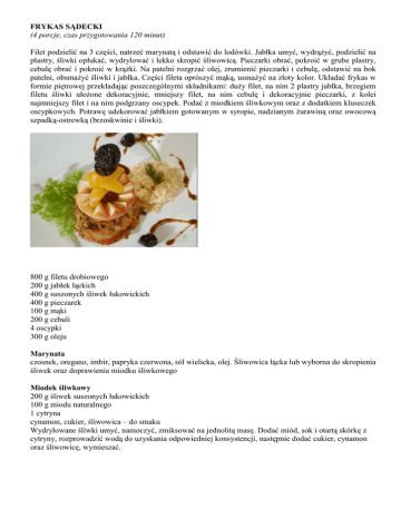 FRYKAS SĄDECKI (4 porcje, czas przygotowania 120 minut) Filet podzielić na 3 części, natrzeć marynatą i odstawić do lodówki. Jabłka umyć, wydrąŜyć, podzielić na plastry, śliwki opłukać, wydrylować i lekko skropić śliwowicą. Pieczarki obrać, pokroić w grube plastry, cebulę obrać i pokroić w krąŜki. Na patelni rozgrzać olej, zrumienić pieczarki i cebulę, odstawić na bok patelni, obsmaŜyć śliwki i jabłka. Części fileta oprószyć mąką, usmaŜyć na złoty kolor. Układać frykas w formie piętrowej przekładając poszczególnymi składnikami: duŜy filet, na nim 2 plastry jabłka, brzegiem filetu śliwki ułoŜone dekoracyjnie, mniejszy filet, na nim cebulę i dekoracyjnie pieczarki, z kolei najmniejszy filet i na nim podgrzany oscypek. Podać z miodkiem śliwkowym oraz z dodatkiem kluseczek oscypkowych. Potrawę udekorować jabłkiem gotowanym w syropie, nadzianym Ŝurawiną oraz owocową szpadką-ostrewką (brzoskwinie i śliwki). 800 g filetu drobiowego 200 g jabłek łąckich 400 g suszonych śliwek łukowickich 400 g pieczarek 100 g mąki 200 g cebuli 4 oscypki 300 g oleju Marynata czosnek, oregano, imbir, papryka czerwona, sól wielicka, olej. Śliwowica łącka lub wyborna do skropienia śliwek oraz doprawienia miodku śliwkowego Miodek śliwkowy 200 g śliwek suszonych łukowickich 100 g miodu naturalnego 1 cytryna cynamon, cukier, śliwowica – do smaku Wydrylowane śliwki umyć, namoczyć, zmiksować na jednolitą masę. Dodać miód, sok i otartą skórkę z cytryny, rozprowadzić wodą do uzyskania odpowiedniej konsystencji, następnie dodać cukier, cynamon oraz śliwowicę, wymieszać. Kluseczki oscypkowe 200 g mąki pszennej 120 g masła 4 jaja 1 oscypek sól koperek do dekoracji Mąkę przesiać, jaja umyć, sparzyć. Mąkę, masło, jaja rozprowadzić rózgą w misce, dodać starty oscypek, sól. Formować małe kluseczki przez maszynkę lub ręcznie i gotować w osolonej wodzie. Odcedzić, przelać zimną wodą, polać masłem. Podawać uformowane w stoŜek, ozdobić koperkiem.