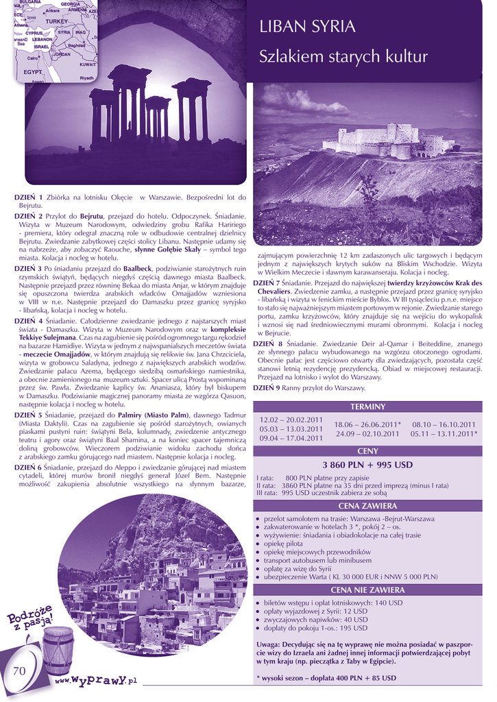 LIBAN SYRIA Szlakiem starych kultur Dzień 1 Zbiórka na lotnisku Okęcie Bejrutu. w Warszawie. Bezpośredni lot do Dzień 2 Przylot do Bejrutu, przejazd do hotelu. Odpoczynek. Śniadanie. Wizyta w Muzeum Narodowym, odwiedziny grobu Rafika Haririego - premiera, który odegrał znaczną role w odbudowie centralnej dzielnicy Bejrutu. Zwiedzanie zabytkowej części stolicy Libanu. Następnie udamy się na nabrzeże, aby zobaczyć Raouche, słynne Gołębie Skały – symbol tego miasta. Kolacja i nocleg w hotelu. zajmującym powierzchnię 12 km zadaszonych ulic targowych i będącym jednym z największych krytych suków na Bliskim Wschodzie. Wizyta w Wielkim Meczecie i sławnym karawanseraju. Kolacja i nocleg. Dzień 3 Po śniadaniu przejazd do Baalbeck, podziwianie starożytnych ruin rzymskich świątyń, będących niegdyś częścią dawnego miasta Baalbeck. Następnie przejazd przez równinę Bekaa do miasta Anjar, w którym znajduje Dzień 7 Śniadanie. Przejazd do największej twierdzy krzyżowców Krak des Chevaliers. Zwiedzenie zamku, a następnie przejazd przez granicę syryjsko się opuszczona twierdza arabskich władców Omajjadów wzniesiona - libańską i wizyta w fenickim mieście Byblos. W III tysiącleciu p.n.e. miejsce w VIII w n.e. Następnie przejazd do Damaszku przez granicę syryjsko to stało się najważniejszym miastem portowym w rejonie. Zwiedzanie starego - libańską, kolacja i nocleg w hotelu. portu, zamku krzyżowców, który znajduje się na wejściu do wykopalisk Dzień 4 Śniadanie. Całodzienne zwiedzanie jednego z najstarszych miast i wznosi się nad średniowiecznymi murami obronnymi. Kolacja i nocleg świata - Damaszku. Wizyta w Muzeum Narodowym oraz w kompleksie w Bejrucie. Tekkiye Sulejmana. Czas na zagubienie się pośród ogromnego targu rękodzieł Dzień 8 Śniadanie. Zwiedzanie Deir al-Qamar i Beiteddine, znanego na bazarze Hamidiye. Wizyta w jednym z najwspanialszych meczetów świata ze słynnego pałacu wybudowanego na wzgórzu otoczonego ogrodami. - meczecie Omajjadów, w którym znajdują się relikwie św. Jana Chrzciciela, Obecnie pałac jest częściowo otwarty dla zwiedzających, pozostała część wizyta w grobowcu Saladyna, jednego z największych arabskich wodzów. stanowi letnią rezydencję prezydencką. Obiad w miejscowej restauracji. Zwiedzanie pałacu Azema, będącego siedzibą osmańskiego namiestnika, Przejazd na lotnisko i wylot do Warszawy. a obecnie zamienionego na muzeum sztuki. Spacer ulicą Prostą wspominaną przez św. Pawła. Zwiedzanie kaplicy św. Ananiasza, który był biskupem Dzień 9 Ranny przylot do Warszawy. w Damaszku. Podziwianie magicznej panoramy miasta ze wzgórza Qasuon, następnie kolacja i nocleg w hotelu. TERMINY Dzień 5 Śniadanie, przejazd do Palmiry (Miasto Palm), dawnego Tadmur (Miasta Daktyli). Czas na zagubienie się pośród starożytnych, owianych piaskami pustyni ruin: świątyni Bela, kolumnady, zwiedzenie antycznego teatru i agory oraz świątyni Baal Shamina, a na koniec spacer tajemniczą doliną grobowców. Wieczorem podziwianie widoku zachodu słońca z arabskiego zamku górującego nad miastem. Następnie kolacja i nocleg. Dzień 6 Śniadanie, przejazd do Aleppo i zwiedzanie górującej nad miastem cytadeli, której murów bronił niegdyś generał Józef Bem. Następnie możliwość zakupienia absolutnie wszystkiego na słynnym bazarze, 12.02 – 20.02.2011 05.03 – 13.03.2011 09.04 – 17.04.2011 18.06 – 26.06.2011* 24.09 – 02.10.2011 08.10 – 16.10.2011 05.11 – 13.11.2011* CENY 3 860 PLN + 995 USD I rata: 800 PLN płatne przy zapisie II rata: 3860 PLN płatne na 35 dni przed imprezą (minus I rata) III rata: 995 USD uczestnik zabiera ze sobą CENA ZAWIERA · · · · · · · · przelot samolotem na trasie: Warszawa -Bejrut-Warszawa zakwaterowanie w hotelach 3 *, pokój 2 – os. wyżywienie: śniadania i obiadokolacje na całej trasie opiekę pilota opiekę miejscowych przewodników transport autobusem lub minibusem opłatę za wizę do Syrii ubezpieczenie Warta ( KL 30 000 EUR i NNW 5 000 PLN) CENA NIE ZAWIERA · · · · 70 biletów wstępu i opłat lotniskowych: 140 USD opłaty wyjazdowej z Syrii: 12 USD zwyczajowych napiwków: 40 USD dopłaty do pokoju 1-os.: 195 USD Uwaga: Decydując się na tę wyprawę nie można posiadać w paszporcie wizy do Izraela ani żadnej innej informacji potwierdzającej pobyt w tym kraju (np. pieczątka z Taby w Egipcie). * wysoki sezon – dopłata 400 PLN + 85 USD