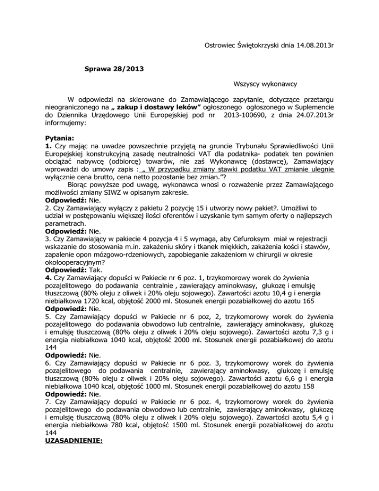 Ostrowiec Świętokrzyski dnia 14.08.2013r Sprawa 28/2013 Wszyscy wykonawcy W odpowiedzi na skierowane do Zamawiającego zapytanie, dotyczące przetargu nieograniczonego na „ zakup i dostawy leków” ogłoszonego ogłoszonego w Suplemencie do Dziennika Urzędowego Unii Europejskiej pod nr 2013-100690, z dnia 24.07.2013r informujemy: Pytania: 1. Czy mając na uwadze powszechnie przyjętą na gruncie Trybunału Sprawiedliwości Unii Europejskiej konstrukcyjną zasadę neutralności VAT dla podatnika- podatek ten powinien obciążać nabywcę (odbiorcę) towarów, nie zaś Wykonawcę (dostawcę), Zamawiający wprowadzi do umowy zapis : „ W przypadku zmiany stawki podatku VAT zmianie ulegnie wyłącznie cena brutto, cena netto pozostanie bez zmian.”? Biorąc powyższe pod uwagę, wykonawca wnosi o rozważenie przez Zamawiającego możliwości zmiany SIWZ w opisanym zakresie. Odpowiedź: Nie. 2. Czy Zamawiający wyłączy z pakietu 2 pozycję 15 i utworzy nowy pakiet?. Umożliwi to udział w postępowaniu większej ilości oferentów i uzyskanie tym samym oferty o najlepszych parametrach. Odpowiedź: Nie. 3. Czy Zamawiający w pakiecie 4 pozycja 4 i 5 wymaga, aby Cefuroksym miał w rejestracji wskazanie do stosowania m.in. zakażeniu skóry i tkanek miękkich, zakażenia kości i stawów, zapalenie opon mózgowo-rdzeniowych, zapobieganie zakażeniom w chirurgii w okresie okołooperacyjnym? Odpowiedź: Tak. 4. Czy Zamawiający dopuści w Pakiecie nr 6 poz. 1, trzykomorowy worek do żywienia pozajelitowego do podawania centralnie , zawierający aminokwasy, glukozę i emulsję tłuszczową (80% oleju z oliwek i 20% oleju sojowego). Zawartości azotu 10,4 g i energia niebiałkowa 1720 kcal, objętość 2000 ml. Stosunek energii pozabiałkowej do azotu 165 Odpowiedź: Nie. 5. Czy Zamawiający dopuści w Pakiecie nr 6 poz, 2, trzykomorowy worek do żywienia pozajelitowego do podawania obwodowo lub centralnie, zawierający aminokwasy, glukozę i emulsję tłuszczową (80% oleju z oliwek i 20% oleju sojowego). Zawartości azotu 7,3 g i energia niebiałkowa 1040 kcal, objętość 2000 ml. Stosunek energii pozabiałkowej do azotu 144 Odpowiedź: Nie. 6. Czy Zamawiający dopuści w Pakiecie nr 6 poz. 3, trzykomorowy worek do żywienia pozajelitowego do podawania centralnie, zawierający aminokwasy, glukozę i emulsję tłuszczową (80% oleju z oliwek i 20% oleju sojowego). Zawartości azotu 6,6 g i energia niebiałkowa 1040 kcal, objętość 1000 ml. Stosunek energii pozabiałkowej do azotu 158 Odpowiedź: Nie. 7. Czy Zamawiający dopuści w Pakiecie nr 6 poz. 4, trzykomorowy worek do żywienia pozajelitowego do podawania obwodowo lub centralnie, zawierający aminokwasy, glukozę i emulsję tłuszczową (80% oleju z oliwek i 20% oleju sojowego). Zawartości azotu 5,4 g i energia niebiałkowa 780 kcal, objętość 1500 ml. Stosunek energii pozabiałkowej do azotu 144 UZASADNIENIE: Obecne określenie przedmiotu zamówienia nie daje możliwości zastosowania leków równoważnych, posiadających identyczne wskazania zarówno w profilaktyce, jak i leczeniu, co narusza zapisy art. 7 oraz ust. 1 Ustawy Prawo Zamówień Publicznych z dnia 29 stycznia 2004 roku, który obliguje Zamawiającego do przeprowadzenie postępowania o udzieleniu zamówienia w sposób zapewniający zachowanie uczciwej konkurencji oraz równe traktowanie wykonawców. Odpowiedź: Nie. 8. Czy Zamawiający wyrazi zgodę na zaoferowanie w Pakiecie 6 pozycji 1 trzykomorowego zestawu do całkowitego żywienia pozajelitowego, zawierającego: aminokwasy, glukozę z cynkiem i wapniem i emulsję tłuszczową MCT/LCT, Zawierający 9,8 g azotu - objętość 1904 ml ? Odpowiedź: Nie. 9. Czy Zamawiający wyrazi zgodę na zaoferowanie w Pakiecie 6 pozycji 2 trzykomorowego zestawu do całkowitego żywienia pozajelitowego, zawierającego: aminokwasy, glukozę z cynkiem i wapniem i emulsję tłuszczową MCT/LCT , do podaży drogą żył obwodowych. Zawierający 9,8 g azotu - objętość 1904 ml ? Odpowiedź: Nie. 10. Czy Zamawiający wyrazi zgodę na zaoferowanie w Pakiecie 6 pozycji 3 trzykomorowego zestawu do całkowitego żywienia pozajelitowego, zawierającego: aminokwasy, glukozę z cynkiem i wapniem i emulsję tłuszczową MCT/LCT , Zawierający 7,4 g azotu - objętość 1488 ml? Odpowiedź: Nie. 11. Czy Zamawiający wyrazi zgodę na zaoferowanie w Pakiecie 6 pozycji 4 trzykomorowego zestawu do całkowitego żywienia pozajelitowego, zawierającego: aminokwasy, glukozę z cynkiem i wapniem i emulsję tłuszczową MCT/LCT , do podaży drogą żył obwodowych. Zawierający 6,2 g azotu - objętość 1206 ml Odpowiedź: Nie. 12. Czy Zamawiający wyrazi zgodę na zaoferowanie w Pakiecie 6 pozycji 5 trzykomorowego zestawu do całkowitego żywienia pozajelitowego, zawierającego: aminokwasy, glukozę z cynkiem i wapniem, emulsję tłuszczową MCT/LCT oraz olej rybi z kwasów omega 3, do podaży drogą żyły centralnej. Zawierający 4 g azotu - objętość 493ml? Odpowiedź: Nie. 13.Wnosimy o zmodyfikowanie i wyrażenie zgody na wydłużenie terminu dostawy „PILNE” tak, by termin ten liczony był zgodnie z art. 111 k.c. i wynosił 1 dzień roboczy. Utrzymanie w mocy terminu dostawy na poziomie 24 godzin wskazuje, że Zamawiający skierował publiczne ogłoszenie o zamówieniu tylko do podmiotów mających siedzibę najbliżej siedziby Zamawiającego. Takie działanie może być uznane za sprzeczne z ze społeczno-gospodarczym przeznaczeniem prawa i z zasadami współżycia społecznego. Odpowiedź: Nie wyrażamy zgody. 14. Czy Zamawiający wyrazi zgodę na wydzielenie z pakietu nr 3 preparatów leczniczych poz.: 6 z powodu wycofania produktów z naszej oferty Odpowiedź: Tak. 15. Czy Zamawiający w Pakiecie nr 5, Cefuroksym 0,75 g poj.do 30 ml x 10 fiol., w ilości 300op., wyraża zgodę na wycenę preparatu konfekcjonowanego x 1 fiol., w ilości 3000 fiol.? Odpowiedź: Tak. 16. Czy Zamawiający w Pakiecie nr 6, Ceftazydym 500 mg x 10 fiol, w il