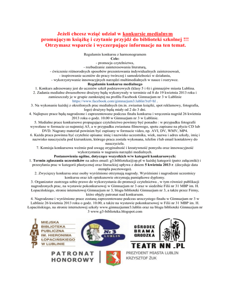 Jeżeli chcesz wziąć udział w konkursie medialnym promującym książkę i czytanie przyjdź do biblioteki szkolnej !!! Otrzymasz wsparcie i wyczerpujące informacje na ten temat. Regulamin konkursu z harmonogramem Cele: - promocja czytelnictwa, - rozbudzanie zainteresowania literaturą, - ćwiczenie różnorodnych sposobów prezentowania indywidualnych zainteresowań, - inspirowanie uczniów do pracy twórczej i samodzielności w działaniu, - wykorzystywanie innowacyjnych narzędzi multimedialnych w nauce i rozrywce. Regulamin konkursu medialnego 1. Konkurs adresowany jest do uczniów szkół podstawowych (klasy 5 i 6) i gimnazjów miasta Lublina. 2. Zadania medialne dwuosobowe drużyny będą wykonywały w terminie od 8 do 19 kwietnia 2013 roku i zamieszczały je w grupie zamkniętej na profilu Facebook Gimnazjum nr 3 w Lublinie https://www.facebook.com/gimnazjum3.lublin?ref=hl . 3. Na wykonanie każdej z określonych prac medialnych (m.in. zwiastun książki, spot reklamowy, fotografia, logo) drużyny będą miały od 2 do 3 dni. 4. Najlepsze prace będą nagrodzone i zaprezentowane podczas finału konkursu i wręczenia nagród 26 kwietnia 2013 roku o godz. 10.00 w Gimnazjum nr 3 w Lublinie. 5. Medialne prace konkursowe propagujące czytelnictwo powinny być ponadto : w przypadku fotografii wywołane w formacie co najmniej A5, a w przypadku zwiastuna filmowego, spotu zapisane na płycie CD lub DVD. Nagrany materiał powinien być zapisany w formacie video, np. AVI, DV, WMV, MP4. 6. Każda praca powinna być czytelnie opisana: imię i nazwisko uczestnika, wiek, nazwa i adres szkoły, imię i nazwisko nauczyciela pod kierunkiem, którego praca została wykonana, telefon i/lub email kontaktowy do nauczyciela. 7. Komisja konkursowa weźmie pod uwagę oryginalność i kreatywność pomysłu oraz innowacyjność wykorzystania w nagraniu narzędzi medialnych. Postanowienia ogólne, dotyczące wszystkich w/w kategorii konkursowych: 1. Termin zgłaszania uczestników na adres email: [email protected] w każdej kategorii (patrz załączniki) i przesyłania prac w kategorii plastycznej oraz literackiej upływa z dniem 5 kwietnia 2013 r. (decyduje data stempla pocztowego). 2. Zwycięzcy konkursu oraz osoby wyróżnione otrzymają nagrody. Wyróżnieni i nagrodzeni uczestnicy konkursu oraz ich opiekunowie otrzymają pamiątkowe dyplomy. 3. Organizator zastrzega sobie prawo do wykorzystania do promocji czytelnictwa , w tym również publikacji nagrodzonych prac, na wystawie pokonkursowej w Gimnazjum nr 3 oraz w siedzibie Filii nr 31 MBP im. H. Łopacińskiego, stronie internetowej Gimnazjum nr 3, blogu biblioteki Gimnazjum nr 3, a także przez Firmy, które objęły patronat nad konkursem. 4. Nagrodzone i wyróżnione prace zostaną zaprezentowane podczas uroczystego finału w Gimnazjum nr 3 w Lublinie 26 kwietnia 2013 roku o godz. 10.00, a także na wystawie pokonkursowej w Filii nr 31 MBP im. H. Łopacińskiego, na stronie internetowej szkoły www.gimnazjumnr3.lublin oraz na blogu biblioteki Gimnazjum nr 3 www.g3-biblioteka.blogspot.com