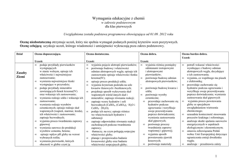 Wymagania edukacyjne z chemii w zakresie podstawowym dla klas pierwszych Uwzględniona została podstawa programowa obowiązująca od 01.09. 2012 roku Ocenę niedostateczną otrzymuje uczeń, który nie spełnia wymagań podanych poniŜej kryteriów ocen pozytywnych. Ocenę celującą uzyskuje uczeń, którego wiadomości i umiejętności wykraczają poza zakres podstawowy. Dział Zasoby Ziemi Ocena dopuszczająca. Ocena dostateczna. Ocena dobra. Uczeń: • podaje przykłady pierwiastków występujących w stanie wolnym, opisuje ich właściwości i najwaŜniejsze zastosowanie; • wymienia najwaŜniejsze tlenki występujące w przyrodzie; • podaje przykłady minerałów zawierających tlenek krzemu(IV) oraz wskazuje ich zastosowanie; • wymienia rodzaje szkła i wskazuje ich zastosowanie; • wymienia rodzaje wyrobów ceramicznych; opisuje rodzaje skał wapiennych (wapień, marmur, kreda), ich właściwości i zastosowanie; zapisuje bezwodnych; • wyjaśnia proces twardnienia zaprawy gipsowej • wymienia surowce do produkcji wyrobów cementu, betonu; • opisuje wpływ pH gleby na wzrost wybranych roślin; • wymienia pierwiastki, których obecność w glebie czyni ją Uczeń: • wyjaśnia pojęcie alotropii pierwiastków; • porównuje budowę i właściwości odmian alotropowych węgla; opisuje ich zastosowanie opisuje właściwości tlenku krzemu(IV); • opisuje proces produkcji szkła; • wyjaśnia kryterium podziału na sole kwasów tlenowych i beztlenowych; • projektuje sposób wykrywania skał wapiennych wśród innych skał i minerałów; zapisuje równania reakcji; • zapisuje wzory hydratów i soli bezwodnych (CaSO4, (CaSO4)2 · H2O i CaSO4 · 2H2O); • podaje ich nazwy; opisuje róŜnice we właściwościach hydratów i substancji • zapisuje odpowiednie równanie reakcji zachodzących podczas twardnienia zaprawy; • tłumaczy, na czym polegają sorpcyjne właściwości gleby; • planuje i przeprowadza badanie kwasowości gleby oraz badanie właściwości sorpcyjnych gleby; Uczeń: • wyjaśnia róŜnicę pomiędzy odmianami izotopowymi i alotropowymi pierwiastków; • porównuje budowę odmian alotropowych pierwiastków; • porównuje budowę kwarcu i szkła; • porównuje wyroby ceramiczne; • przewiduje zachowanie się hydratów podczas ogrzewania i weryfikuje swoje przewidywania poprzez doświadczenie; wymienia zastosowania skał gipsowych; • porównuje procesy twardnienia zaprawy wapiennej i gipsowej; • wyjaśnia sposób powstawania zjawisk krasowych; • porównuje materiały Ocena bardzo dobra. Uczeń: • • • • • • • • potrafi wskazać właściwości wynikające z budowy odmian alotropowych węgla, decydujące o ich zastosowaniu; wyjaśnia, co wspólnego ma piasek z elektroniką; przewiduje zachowanie się hydratów podczas ogrzewania i weryfikuje swoje przewidywania poprzez doświadczenie; wymienia zastosowania skał gipsowych wyjaśnia proces powstawania gleby ze specjalnym uwzględnianiem wietrzenia chemicznego; uzasadnia konieczność stosowania procesów krakingu i reformingu; analizuje skutki spalania surowców energetycznych w aspektach ekologicznym i ekonomicznym; omawia zobowiązania Polski wobec Unii Europejskiej dotyczące ograniczenia emisji dwutlenku węgla; analizuje − przedstawia zalety 1 • • pełnowartościową dla roślin; podaje przykłady nawozów naturalnych i sztucznych, uzasadnia potrzebę ich stosowania; proponuje alternatywne źródła energii – analizuje moŜliwości ich zastosowania (biopaliwa, wodór, energia słoneczna, energia wodna, energia jądrowa, energia geotermalna itd.); • • • • • • • Chemia a Ŝywność • • • • • opisuje występowanie oraz funkcje, jakie spełnią w codziennej diecie białka, węglowodany, tłuszcze, sole mineralne, woda i witaminy; podaje przykłady substancji, które nie mają walorów odŜywczych, a są spoŜywane przez człowieka; wskazuje substancje, których spoŜywanie jest zakazane prawem; wskazuje miejsce lub numer telefonu, pod którym mogą uzyskać pomoc osoby uzaleŜnione lub poszukujące informacji na temat uzaleŜnień; wyjaśnia przyczyny psucia się Ŝywności; proponuje sposoby zapobiegania temu procesowi; • • • • porównuje pojęcia: surowce odnawialne i nieodnawialne; podaje przykłady surowców naturalnych wykorzystywanych do uzyskiwania energii (bezpośrednio i po przetworzeniu); opisuje przebieg destylacji ropy naftowej i węgla kamiennego; wymienia nazwy produktów tych procesów i uzasadnia ich zastosowanie; wyjaśnia pojęcie liczby oktanowej (LO) i podaje sposoby zwiększania LO benzyny; tłumaczy, na czym polegają kraking oraz reforming; analizuje wpływ róŜnorodnych sposobów uzyskiwania energii na stan środowiska przyrodniczego; analizuje wpływ róŜnorodnych sposobów uzyskiwania energii na stan środowiska przyrodniczego. wyszukuje informacje na temat składników napojów spoŜywanych codziennie (mleka, wody mineralnej) w aspekcie ich działania na organizm ludzki; wyszukuje informacje na temat składników napojów spoŜywanych codziennie (kawa, herbata, napoje typu cola) w aspekcie ich działania na organizm ludzki; projektuje doświadczenie potwierdzające szkodliwy wpływ alkoholu i tytoniu na organizm ludzki; opisuje procesy fermentacyjne zachodzące podczas wyrabiania ciasta i pieczenia chleba, produkcji wina, otrzymywania kwaśnego mleka, jogurtów, serów; • • • • • • • • • • stosowane w budownictwie; porównuje sorpcję chemiczną gleby do innych rodzajów sorpcji; wyjaśnia znaczenie właściwości sorpcyjnych gleby; wyjaśnia powody erozji gleby; porównuje znaczenie nieodnawialnych surowców energetycznych; przewiduje i analizuje skutki stosowania paliw kopalnych; wyjaśnia, dlaczego bardziej opłacalne jest przetwarzanie ropy naftowej i węgla kamiennego niŜ ich spalanie; wyjaśnia, na czym polega eksploatacja gazu łupkowego; • interpretuje piramidę Ŝywności,