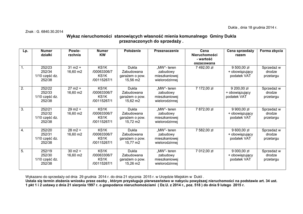 Dukla , dnia 18 grudnia 2014 r. Znak : G. 6840.30.2014 Wykaz nieruchomości stanowiących własność mienia komunalnego Gminy Dukla przeznaczonych do sprzedaży . Lp. Numer działki Powierzchnia Numer KW Położenie Przeznaczenie Cena Nieruchomości - wartość oszacowana 7 492,00 zł Cena sprzedaży razem Forma zbycia 1. 252/23 252/34 1/10 część dz. 252/38 31 m2 + 16,60 m2 KS1K /00063306/7 KS1K /00115267/1 Dukla Zabudowana garażem o pow. 15,56 m2 „MW”- teren zabudowy mieszkaniowej wielorodzinnej 9 500,00 zł + obowiązujący podatek VAT Sprzedaż w drodze przetargu 2. 252/22 252/33 1/10 część dz. 252/38 27 m2 + 16,60 m2 KS1K /00063306/7 KS1K /00115267/1 Dukla Zabudowana garażem o pow. 15,62 m2 „MW”- teren zabudowy mieszkaniowej wielorodzinnej 7 172,00 zł 3. 252/21 252/32 1/10 część dz. 252/38 29 m2 + 16,60 m2 KS1K /00063306/7 KS1K /00115267/1 Dukla Zabudowana garażem o pow. 15,72 m2 „MW”- teren zabudowy mieszkaniowej wielorodzinnej 7 872,00 zł 9 900,00 zł + obowiązujący podatek VAT Sprzedaż w drodze przetargu 4. 252/20 252/31 1/10 część dz. 252/38 28 m2 + 16,60 m2 KS1K /00063306/7 KS1K /00115267/1 Dukla Zabudowana garażem o pow. 15,77 m2 „MW”- teren zabudowy mieszkaniowej wielorodzinnej 7 582,00 zł 9 600,00 zł + obowiązujący podatek VAT Sprzedaż w drodze przetargu 5. 252/19 252/30 1/10 część dz. 252/38 30 m2 + 16,60 m2 KS1K /00063306/7 KS1K /00115267/1 Dukla Zabudowana garażem o pow. 15,26 m2 „MW”- teren zabudowy mieszkaniowej wielorodzinnej 7 012,00 zł 9 000,00 zł + obowiązujący podatek VAT Sprzedaż w drodze przetargu 9 200,00 zł + obowiązujący podatek VAT Sprzedaż w drodze przetargu Wykazano do sprzedaży od dnia 29 grudnia 2014 r. do dnia 21 stycznia 2015 r. w Urzędzie Miejskim w Dukli . Ustala się termin złożenia wniosku przez osoby , którym przysługuje pierwszeństwo w nabyciu powyższej nieruchomości na podstawie art. 34 ust. 1 pkt 1 i 2 ustawy z dnia 21 sierpnia 1997 r. o gospodarce nieruchomościami ( Dz.U. z 2014 r., poz. 518 ) do dnia 9 lutego 2015 r.