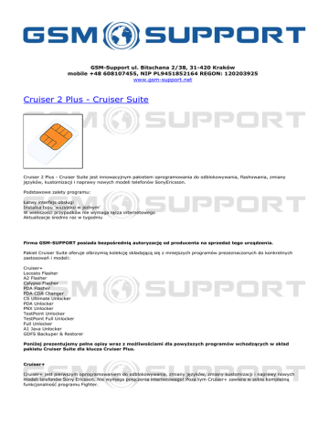 GSM-Support ul. Bitschana 2/38, 31-420 Kraków mobile +48 608107455, NIP PL9451852164 REGON: 120203925 www.gsm-support.net Cruiser 2 Plus - Cruiser Suite Cruiser 2 Plus - Cruiser Suite jest innowacyjnym pakietem oprogramowania do odblokowywania, flashowania, zmiany języków, kustomizacji i naprawy nowych modeli telefonów SonyEricsson. Podstawowe zalety programu: Łatwy interfejs obsługi Instalka typu 'wszystko w jednym' W wiekszości przypadków nie wymaga łącza internetowego Aktualizacje średnio raz w tygodniu Firma GSM-SUPPORT posiada bezpośrednią autoryzację od producenta na sprzedaż tego urządzenia. Pakiet Cruiser Suite oferuje olbrzymią kolekcję składającą się z mniejszych programów prezeznaczonych do konkretnych zastosowań i modeli: Cruiser+ Locosto Flasher A2 Flasher Calypso Flasher PDA Flasher PDA CDA Changer CS Ultimate Unlocker PDA Unlocker PNX Unlocker TestPoint Unlocker TestPoint Full Unlocker Full Unlocker A1 Java Unlocker GDFS Backuper & Restorer Poniżej prezentujemy pełne opisy wraz z możliwościami dla powyższych programów wchodzących w skład pakietu Cruiser Suite dla klucza Cruiser Plus. Cruiser+ Cruiser+ jest pierwszym oprogramowaniem do odblokowywania, zmiany języków, zmiany kustomizacji i naprawy nowych modeli telefonów Sony Ericsson. Nie wymaga połączenia internetowego! Poza tym Cruiser+ zawiera w sobie kompletną funkcjonalność programu Fighter. Możliwości programu: - Flashowanie: K320i, K320a, K320c, K530i, K530c , K510i, K510c, K510a, K610i, K610a, K610c, K618i, K618a, K790i, K790c, K790a, K800i, K800c, K810i, K818c, S500i, S500c, T650i, T650c, V630i, W580i, W580c, W600i, W600c, W610i, W610c, W660i, W660c, W710i, W710c, W810i, W810c, W830i, W830c, W850, W880i, W880c, W888c, W900i, W900c, Z310i, Z310c, Z310a, Z558i, Z558c, Z610i, Z610c, Z710i, Z710c, T250i, T250a, Z250i, Z250a, Z250c, Z320i, Z320a, Z320c, K630i, K660i, K850i, K858c, V640i, W760i, W760c, W890i, W910i, W910c, Z750i, Z750a, K200i, K220i, J120i, M600i, M600c, M608c, P1, P990, W950i, W950c, W958c, W960, J300i, J300c, J300a, K750i, K750c, D750i, K758c, K600i,c, K608i, V600i, K500i,c, K506c, K508i,c, F500i, Z800i, Z800c, Z550i, Z550c, Z550a, Z500i, Z500c, Z500a, Z520i, Z520c, Z520a, Z530i, Z530c, Z525a, K300i, K300c, K300a, K310i, K310c, K310a, K550i, K550c, K700i, K700c, K770i, K770c, Z300i, Z300c, Z300a, W700i, W700c, W700a, W800i, W800c, W550i, W550c, W200i, W200c, W200a, W300i, W300c, W300a, P900, P907, P908, Z200, Z208, S700i, S700c, S710a, V800, V802SE, P910, P910i, Z600, Z608, J200i, J200c, J210i, J210c, J220i, J220c, J220a,, J230i, J230c, J230a, G700, G900, - Unlock: K320i, K320a, K320c, K530i, K530c , K510i, K510c, K510a, K610i, K610a, K610c, K618i, K618a, K790i, K790c, K790a, K800i, K800c, K810i, K818c, S500i, S500c, T650i, T650c, V630i, W580i, W580c, W610i, W610c, W660i, W660c, W710i, W710c, W810i, W810c, W830i, W830c, W850, W880i, W880c, W888c, W900i, W900c, Z310i, Z310c, Z310a, Z610i, Z610c, Z710i, Z710c, T250i, T250a, Z250i, Z250a, Z250c, Z320i, Z320a, Z320c, K630i, K660i, K850i, K858c, V640i, W760i, W760c, W890i, W910i, W910c, Z750i, Z750a, K200i, K220i, J120i, M600i, M600c, M608c, P1, P990, W950i, W950c, W958c, W960, K600i,c, K608i, V600i, Z800i, Z800c, Z500i, Z500c, Z500a, Z530i, Z530c, K310i, K310c, K310a, K550i, K550c, K770i, K770c, Z300i, Z300c, Z300a, W200i, W200c, W200a, W300i, W300c, W300a, P900, P907, P908, Z200, Z208, V800, V802SE, P910, P910i, Z600, Z608, J200i, J200c, J210i, J210c, J220i, J220c, J220a,, J230i, J230c, J230a, W350, W380, Z555, G700, G900, K310i, K310c, K310a (DB2012 only), K510i, K510c, K510a (DB2012 only), W300i, W300c, W300a (DB2012 only), W810i, W810c (DB2012 only), Z530i, Z530c (DB2012 only), Z780, W980, C702, C902, G502, Z770, Unlock niektórych modeli może wymagać dokupienia kredytów! - Zmiana języków: T250i, T250a, Z250i, Z250a, Z250c, Z320i, Z320a, Z320c, K200i, K220i, J120i, M600i, M600c, M608c, P1, P990, W950i, W950c, W958c, W960, - Naprawa: K320i, K320a, K320c, K530i, K530c , K510i, K510c, K510a, K610i, K610a, K610c, K618i, K618a, K790i, K790c, K790a, K800i, K800c, K810i, K818c, S500i, S500c, T650i, T650c, V630i, W580i, W580c, W610i, W610c, W660i, W660c, W710i, W710c, W810i, W810c, W830i, W830c, W850, W880i, W880c, W888c, W900i, W900c, Z310i, Z310c, Z310a, Z610i, Z610c, Z710i, Z710c, T250i, T250a, Z250i, Z250a, Z250c, Z320i, Z320a, Z320c, K630i, K660i, K850i, K858c, V640i, W760i, W760c, W890i, W910i, W910c, Z750i, Z750a, K200i, K220i, J120i, M600i, M600c, M608c, P1, P990, W950i, W950c, W958c, W960, K750i, K750c, D750i, K758c, K600i,c, K608i, V600i, Z800i, Z800c, Z500i, Z500c, Z500a, Z530i, Z530c, K310i, K310c, K310a, K550i, K550c, K700i, K700c, K770i, K770c, Z300i, Z300c, Z300a, W200i, W200c, W200a, W300i, W300c, W300a, P900, P907, P908, Z200, Z208, V800, V802SE, P910, P910i, Z600, Z608, J200i, J200c, J210i, J210c, J220i, J220c, J220a,, J230i, J230c, J230a, W350, W380, Z555, G700, G900, K310i, K310c, K310a (DB2012 only), K510i, K510c, K510a (DB2012 only), W300i, W300c, W300a (DB2012 only), W810i, W810c (DB2012 only), Z530i, Z530c (DB2012 only), Z780, W980, C702, C902, G502, Z770, Locosto Flasher Cruiser Suite SE Locosto Flasher jest programem do flashowania telefonów Sony Ericsson opartych na platformie Locosto. Każdy posiadacz klucza Cruise Suite lub Box'a może używać tej aplikacji bez dodatkowych opłat i bez łącza internetowego. Obsługiwane modele telefonów: T250i, T250a, Z250i, Z250a, Z250c, Z320i, Z320a, Z320c, T280, R300, R306 Możliwości programu - Flashowanie (zmiana oprogramowania w telefonie) - Zmiana języków Program nie wymaga łącza internetowego ani Logów Cruiser. Wszystko co należy zrobić to ściągnąć konkretny plik flash z serwera supportu, podłączyć kabel do telefonu i rozpocząć pracę. Locosto Flasher obsługuję połączenie wyłącznie przez kabel szeregowy, ponieważ platforma Locosto nie ma obsługi USB. W celu uzyskania szczegółowych informacji prosimy zapoznać się