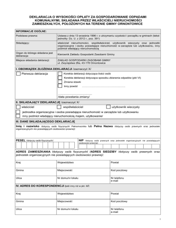 DEKLARACJA O WYSOKOŚCI OPŁATY ZA GOSPODAROWANIE ODPADAMI KOMUNALNYMI, SKŁADANA PRZEZ WŁAŚCICIELI NIERUCHOMOŚCI ZAMIESZKAŁYCH, POŁOŻONYCH NA TERENIE GMINY ORNONTOWICE INFORMACJE OGÓLNE: Podstawa prawna: Ustawa z dnia 13 września 1996 r. o utrzymaniu czystości i porządku w gminach (tekst jednolity: Dz. U. z 2012 r., poz. 391) Składający: właściciel nieruchomości, współwłaściciel, użytkownik wieczysty oraz jednostki organizacyjne i osoby posiadające nieruchomość w zarządzie lub użytkowaniu, inny podmiot władający nieruchomością Organ do którego składana jest deklaracja: Miejsce składania deklaracji: Kierownik Zakładu Gospodarki Zasobami Gminy ZAKŁAD GOSPODARKI ZASOBAMI GMINY ul. Zwycięstwa 26a, 43-178 Ornontowice I. OBOWIĄZEK ZŁOŻENIA DEKLARACJI /zaznaczyć X/ Pierwsza deklaracja Korekta deklaracji dotycząca ilości osób Korekta deklaracji dotycząca sposobu zbierania odpadów (pkt VI) Zmiana stawki Inny powód …………………………………………. …...................................... /data powstania zmiany/ II. SKŁADAJĄCY DEKLARACJĘ /zaznaczyć X/ właściciel współwłaściciel użytkownik wieczysty jednostka organizacyjna i osoba posiadająca nieruchomość w zarządzie lub użytkowaniu inny podmiot władający nieruchomością /najem, użytkowanie/ III. DANE SKŁADAJĄCEGO DEKLARACJĘ Imię i nazwisko /dotyczy osób fizycznych/ Pełnomocnika lub Pełna Nazwa /dotyczy osób prawnych oraz jednostek organizacyjnych nie posiadających osobowości prawnej/: PESEL /dotyczy osób fizycznych/: NIP /dotyczy osób prawnych oraz jednostek organizacyjnych nie posiadających osobowości prawnej/: ADRES ZAMIESZKANIA /dotyczy osób fizycznych/ /ADRES SIEDZIBY /dotyczy osób prawnych oraz jednostek organizacyjnych nie posiadających osobowości prawnej/: Kraj Województwo Powiat Gmina Miejscowość Kod pocztowy Ulica Nr domu/nr lokalu Nr telefonu e-mail IV. ADRES DO KORESPONDENCJI /jeśli inny niż w pkt. III/: Kraj Województwo Powiat Gmina Miejscowość Kod pocztowy Ulica Nr domu/nr lokalu Nr telefonu e-mail 1 V. ADRES NIERUCHOMOŚCI DLA KTÓREJ SKŁADANA JEST DEKLARACJA /wypełnić w przypadku gdy jest inny niż w pkt. III/ Ulica Nr domu/nr lokalu VI. OŚWIADCZENIE Oświadczam, że na terenie nieruchomości wskazanej w pkt. III niniejszej deklaracji odpady zbierane będą w sposób selektywny /zaznaczyć X/ TAK □ NIE □ VII. OBLICZENIE WYSOKOŚCI OPŁATY ZA GOSPODAROWANIE ODPADAMI KOMUNALNYMI W DANYM MIESIĄCU: Oświadczam, że na terenie nieruchomości wskazanej w niniejszej deklaracji zamieszkuje osób: …............ DLA OSÓB PROWADZĄCYCH SELEKTYWNE ZBIERANIE ODPADÓW: A. Liczba do 4 osób …........................... x 12 zł = ………………….…………[zł] B. Liczba powyżej 4 osoby …........................... x 6 zł = ………………….…………...[zł] Wysokość opłaty za gospodarowanie odpadami w miesiącu wynosi: ……………………[zł] Słownie: …………………………………………………………………….………………..….[zł] DLA OSÓB NIE PROWADZĄCYCH SELEKTYWNEGO ZBIERANIA ODPADÓW: A. Liczba osób …........................... x 18 zł = ………………….………………[zł] Słownie:…………………………………………………………………………..…………[zł] VIII. INFORMACJE O ZAŁĄCZNIKACH/: TAK □ (ilość) …………. NIE □ POUCZENIE : Pola jasne wypełnia właściciel nieruchomości, drukowanymi literami. 1. Właściciel jest zobowiązany złożyć deklarację: do 14 dni od dnia zamieszkania na danej nieruchomości pierwszego mieszkańca, korektę, do 14 dni od dnia zmiany liczby osób zamieszkujących daną nieruchomość lub sposobu zbierania odpadów (pkt. VI), korektę, do 14 dni od dnia zmiany przez Gminę wysokości stawki opłaty za gospodarowanie odpadami komunalnymi. 2. W przypadku nie złożenia deklaracji w terminie albo w uzasadnionych wątpliwościach, co do danych zawartych w deklaracji Kierownik Zakładu Gospodarki Zasobami Gminy określi w drodze decyzji wysokość opłaty za gospodarowanie odpadami komunalnymi, biorąc pod uwagę uzasadnione szacunki, w tym średnia ilość odpadów komunalnych powstających na nieruchomościach o podobnym charakterze. 3. Opłatę za gospodarowanie odpadami komunalnymi w zmienionej wysokości uiszcza się za miesiąc, w którym nastąpiła zmiana. Podstawą do wystawienia tytułu wykonawczego stanowić będzie niniejsza deklaracja uwzględniająca aktualną stawkę opłaty. 4. Opłatę miesięczną należy wpłacać do 20-go dnia danego miesiąca na indywidualny rachunek bankowy podatnika. 2 5. Na podst. art. 54 i art. 56 ustawy z dnia 10 września 1999r. Kodeks karny skarbowego (Dz.U. z 2007r. poz. 756 z późn. zm.) – Podatnik, który uchylając się od opodatkowania nie ujawnia właściwemu organowi przedmiotu lub podstawy opodatkowania lub nie składa deklaracji, przez co naraża podatek na uszczuplenie podlega karze grzywny za wykroczenia skarbowe. Niniejsza deklaracja stanowi podstawę prawną do wystawienia tytułu wykonawczego, zgodnie z art. 3a Ustawy z dnia 17 czerwca 1996 r. o postępowaniu egzekucyjnym w administracji (Dz. U. z 2012r. poz. 1015 z późn. zm.). IX. OśWIADCZENIE I PODPIS SKŁADAJĄCEGO DEKLARACJĘ: Oświadczam, że znane mi są przepisy Kodeksu karnego skarbowego (tekst jednolity Dz. U. z 2007 r. Nr 111 poz. 765 z późn. zm.) o odpowiedzialności za podanie danych niezgodnych z rzeczywistością oraz zobowiązuję się wnosić opłatę wskazaną w pkt. VII w terminach określonych w Uchwale nr XXIV/241/12 Rady Gminy Ornontowice z dnia 28.11.2012r. ………………………………………………. /miejscowość i data/ ………………………………………… /czytelny podpis/ OBJAśNIENIA: 1. Właściciel nieruchomości może złożyć korektę deklaracji wraz z dołączonym pisemnym uzasadnieniem przyczyny korekty. 2.