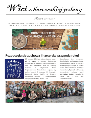 Wici z harcerskiej polany Numer 1 28-06-2016 NIEREGULARNIK OBOZOWY STOWARZYSZENIA INICJATYW HARCERSKICH „D Ę B I N A” Z Ż O R W Y D A W A N Y N A O B O Z I E I K O L O N I I P I L I C A ‘2 0 1 6 Rozpoczęła się zuchowa i harcerska przygoda roku! 27. czerwca 2016 po roku wytężonej pracy aż 92 osoby z naszego środowiska przyjechały do Kurnędza na harcerski obóz letni pod namiotami oraz na kolonię zuchową w Sulejowskim Parku Krajobrazowym. Uczestnikami wyjazdu są zuchy, harcerki i harcerze XVI Gromady Zuchowej „Leśne ludki”, 16 Drużyny Harcerskiej „Wataha” i 1 Środowiskowej Drużyny Harcerskiej „Wigry” z Żor. Szczęśliwcom tym towarzyszy 8 osób kadry wychowawczej oraz nasza redakcja. Ciężar organizacji przedsięwzięcia wzięła na siebie kadra Stowarzyszenia Inicjatyw Harcerskich „Dębina”, zaś funkcję komendanta wyjazdu pełni hm. Robert GUZIK. Scouting is calling and I must go! Trzymajcie kciuki! Felieton Starszego Niedźwiedzia Druh Damian CAPUTA z 16 DH „Wataha” zapytany jak mu się podoba po pierwszym dniu obozu, mówi: „Jest fajnie”. Cóż za słowo-wytrych. „Fajnie” określa dużo i nic. Miejmy nadzieję, że Damian miał na myśli coś przyjemnego i harcerskiego. Swoją drogą, określenie „fajnie” weszło już do naszej mowy potocznej i zakorzeniło się na tyle, że wielu z nas używa go jako jedynego do określenia np. filmu, lekcji, zbiórki a nawet całych obozów, wesel, wczasów i innych życiowych zdarzeń. Mama pyta „Jak było w szkole?”, a my na to: „Fajnie”. Zapytajmy kogoś „Jak było na urodzinach?”, a na 90% odpowie, że było fajnie. I niestety to nadal niewiele mówi osobie pytającej… Może zatem warto się zastanowić czy można jakoś kreatywnie to słowo rozwinąć: FAJNIE = Jest bardzo przyjemnie, pogoda nam dopisuje, a komary dają żyć FAJNIE = Mam tu dużo nowych koleżanek i kolegów, a druh Iwan jest miły (z rana) FAJNIE = Podoba mi się ta przygoda, czuję, że jeszcze wiele się tutaj zadzieje! FAJNIE = Obóz jest bardzo ciekawy, mam y kilkanaście dużych namiotów i wczoraj miałem wartę nocną. Czy można zatem używać kilku innych określeń zamiast jednego „enigmatycznego” „fajnie”? Można. Wystarczy chcieć i mieć coś na myśli Polecamy więc rozwijanie tego określenia. Udanych wakacji! …i fajnych ;-) życzy Starszy Wiekiem Niedźwiedź Jednym zdaniem - Jak przyjechałem, wydawało mi się ciekawie. Dobrze się wyspałem i rano było dobre śniadanie – mówi 11-letni druh Krystian BRUDECKI z 16 DH „Wataha” - W nocy musiałam iść do toalety, a to jest bardzo daleko od nas i było mi bardzo ciemno i źle – dzieli się tym ekstremalnym przeżyciem druhna pion. Dominika DARUL z 1 ŚDH „Wigry” Zuchowe wieści Zuchy od rana zapoznają się z bazą i poznają zasady bezpieczeństwa. Poznali panią ratownik – druhnę Martynę, która opowiedziała co oznacza jeden gwizdek i dwa gwizdki podczas kąpieli w rzece. Zuch Witek od razu miał jasne skojarzenie: jeden gwizdek to żółta kartka, drugi gwizdek to czerwona kartka. Skojarzenie jest jak najbardziej na czasie w związku z meczami EURO 2016 Tak też zostało to przez zuchy zapamiętane. W czwartek grają nasi! O godzinie 21:00 historyczny mecz Polska-Portugalia. Oj, mamy wrażenie, że będzie potrzebny solidny doping narodu polskiego! Lecz co zrobić, jeśli na całym terenie bazy obozowej PILICA nie ma ani jednego telewizora… Nawet w domku druha komendanta zgrupowania. Redakcja już to sprawdziła i …niestety! Druh komendant phm. Tomasz WAŚKO żałuje, ale nie ma takich zdobyczy techniki. A my, cóż, będziemy musieli chyba kibicować na odległość. POLSKA GOLA!!! S T O P K A R E D A K C Y J N A NAKŁAD: ile komendant pozwoli ADRES REDAKCJI: Chatka Nr 1, za ogromnym świerkiem TELEFON: dwa razy w okno, raz w parapet HASŁO: Wici! ODZEW: (…) [cenzura przemilczy, ale to będzie coś do rymu] SEKRETARZ REDAKCJI: hm. Anna Nowacka & małe przeszkadzajki & kto chce niech się zgłosi