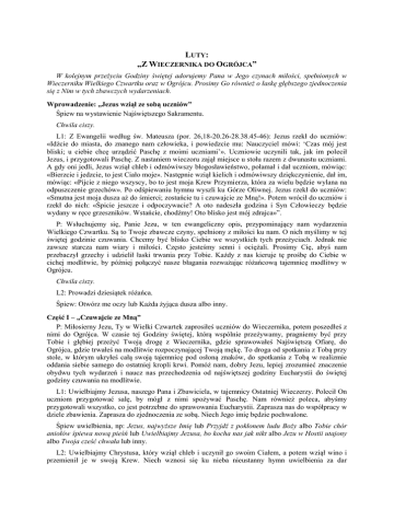 LUTY: „Z WIECZERNIKA DO OGRÓJCA” W kolejnym przeżyciu Godziny świętej adorujemy Pana w Jego czynach miłości, spełnionych w Wieczerniku Wielkiego Czwartku oraz w Ogrójcu. Prosimy Go również o łaskę głębszego zjednoczenia się z Nim w tych zbawczych wydarzeniach. Wprowadzenie: „Jezus wziął ze sobą uczniów” Śpiew na wystawienie Najświętszego Sakramentu. Chwila ciszy. L1: Z Ewangelii według św. Mateusza (por. 26,18-20.26-28.38.45-46): Jezus rzekł do uczniów: «Idźcie do miasta, do znanego nam człowieka, i powiedzcie mu: Nauczyciel mówi: ‘Czas mój jest bliski; u ciebie chcę urządzić Paschę z moimi uczniami’». Uczniowie uczynili tak, jak im polecił Jezus, i przygotowali Paschę. Z nastaniem wieczoru zajął miejsce u stołu razem z dwunastu uczniami. A gdy oni jedli, Jezus wziął chleb i odmówiwszy błogosławieństwo, połamał i dał uczniom, mówiąc: «Bierzcie i jedzcie, to jest Ciało moje». Następnie wziął kielich i odmówiwszy dziękczynienie, dał im, mówiąc: «Pijcie z niego wszyscy, bo to jest moja Krew Przymierza, która za wielu będzie wylana na odpuszczenie grzechów». Po odśpiewaniu hymnu wyszli ku Górze Oliwnej. Jezus rzekł do uczniów: «Smutna jest moja dusza aż do śmierci; zostańcie tu i czuwajcie ze Mną!». Potem wrócił do uczniów i rzekł do nich: «Śpicie jeszcze i odpoczywacie? A oto nadeszła godzina i Syn Człowieczy będzie wydany w ręce grzeszników. Wstańcie, chodźmy! Oto blisko jest mój zdrajca»”. P: Wsłuchujemy się, Panie Jezu, w ten ewangeliczny opis, przypominający nam wydarzenia Wielkiego Czwartku. Są to Twoje zbawcze czyny, spełniony z miłości ku nam. O nich myślimy w tej świętej godzinie czuwania. Chcemy być blisko Ciebie we wszystkich tych przeżyciach. Jednak nie zawsze starcza nam wiary i miłości. Często jesteśmy senni i ociężali. Prosimy Cię, abyś nam przebaczył grzechy i udzielił łaski trwania przy Tobie. Każdy z nas kieruje tę prośbę do Ciebie w cichej modlitwie, by później połączyć nasze błagania rozważając różańcową tajemnicę modlitwy w Ogrójcu. Chwila ciszy. L2: Prowadzi dziesiątek różańca. Śpiew: Otwórz me oczy lub Każda żyjąca dusza albo inny. Część I – „Czuwajcie ze Mną” P: Miłosierny Jezu, Ty w Wielki Czwartek zaprosiłeś uczniów do Wieczernika, potem poszedłeś z nimi do Ogrójca. W czasie tej Godziny świętej, którą wspólnie przeżywamy, pragniemy być przy Tobie i głębiej przeżyć Twoją drogę z Wieczernika, gdzie sprawowałeś Najświętszą Ofiarę, do Ogrójca, gdzie trwałeś na modlitwie rozpoczynającej Twoją mękę. To droga od spotkania z Tobą przy stole, w którym ukryłeś całą swoją tajemnicę pod osłoną znaków, do spotkania z Tobą w realizmie oddania siebie samego do ostatniej kropli krwi. Pomóż nam, dobry Jezu, lepiej zrozumieć znaczenie obydwu tych wydarzeń i naucz nas przechodzenia od najświętszej godziny Eucharystii do świętej godziny czuwania na modlitwie. L1: Uwielbiajmy Jezusa, naszego Pana i Zbawiciela, w tajemnicy Ostatniej Wieczerzy. Polecił On uczniom przygotować salę, by mógł z nimi spożywać Paschę. Nam również poleca, abyśmy przygotowali wszystko, co jest potrzebne do sprawowania Eucharystii. Zaprasza nas do współpracy w dziele zbawienia. Zaprasza do zjednoczenia ze sobą. Niech Jego imię będzie pochwalone. Śpiew uwielbienia, np: Jezus, najwyższe Imię lub Przyjdź z pokłonem ludu Boży albo Tobie chór aniołów śpiewa nową pieśń lub Uwielbiajmy Jezusa, bo kocha nas jak nikt albo Jezu w Hostii utajony albo Twoja cześć chwała lub inny. L2: Uwielbiajmy Chrystusa, który wziął chleb i uczynił go swoim Ciałem, a potem wziął wino i przemienił je w swoją Krew. Niech wznosi się ku nieba nieustanny hymn uwielbienia za dar Eucharystii, za łaskę sakramentalnego uczestnictwa w śmierci i zmartwychwstaniu Pana, które jest nam ofiarowane. Śpiew uwielbienia. L1: Uwielbiajmy Pana, który po odśpiewaniu hymnu, wraz z uczniami poszedł z uczniami do ogrodu Oliwnego, gdzie rozpoczęła się Jego męka. W Wieczerniku wypowiadał arcykapłańską modlitwę, w której zawierzał Ojcu wszystkich uczniów, w Ogrójcu przeżywa modlitwę walki o wierność woli Ojca. Jedna modlitwa łączy się z drugą, jedna przechodzi w drugą. Każda z nich niesie ludziom zbawienie. Z głębi serca śpiewajmy naszą pieśń wdzięczności i uwielbienia. Śpiew uwielbienia. L2: Uwielbiajmy Pana, który zaprosił Apostołów, aby czuwali z Nim w Ogrójcu. Mówił: „Zostańcie tu i czuwajcie ze Mną”. Uwielbiajmy Go, gdyż i nas zaprasza, abyśmy byli przy Nim i z Nim czuwali. Wpatrujemy się z uwagą w każdy Jego czyn i wsłuchujemy się w każde Jego słowo. Wszystkie są czynami Syna Bożego, który przyjął nasze człowieczeństwo i w nim dokonuje naszego zbawienia. Wraz z aniołami w niebie i całym Kościołem na ziemi śpiewajmy pieśń uwielbienia. Śpiew uwielbienia. P: Niech duch wdzięczności i uwielbienia przeniknie głęboko w nasze serce. Trwajmy teraz w indywidualnym uwielbieniu. Pozostańmy w dłuższej chwili ciszy, aby każdy z nas mógł osobiście zatrzymać się przy Jezusie w Wieczerniku, przejść z Nim do Ogrójca, uczestniczyć w Jego modlitwie do Ojca. Niech ta kontemplacja tajemnicy Pana zaowocuje pieśnią serca. Dłuższa chwila ciszy. Śpiew uwielbienia. Część druga – „Módlcie się, abyście nie ulegli pokusie” P: Dziękujemy Ci, miłosierny Jezu, za zaproszenie nas do udziału w Twoim czuwaniu, w Twojej modlitwie i w Twojej ofierze. My także zapraszamy Cię, abyś wszedł w świat naszej modlitwy i naszego życia. Nasza modlitwa, choć płynie z serca, jest ciągle słaba i niedoskonała. Często uważamy, że mamy tyle ważnych zajęć, iż na modlitwę brakuje nam czasu. Brakuje go niekiedy, gdy rozpoczynamy i kończymy dzień. Brakuje go, gdy trzeba się przygotować do udziału w Eucharystii i przeżyć aut