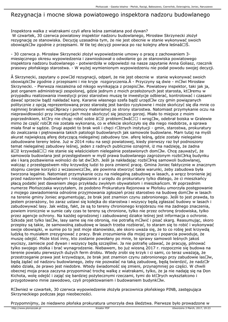 Płońszczak - Gazeta lokalna - Płońsk, Raciąż, Baboszewo, Czerwińsk, Dzierzążnia, Joniec, Naruszewo Rezygnacja i mocne słowa powiatowego inspektora nadzoru budowlanego Inspektora walka z wiatrakami czyli afera leśna zamiatana pod dywan? W czwartek, 30 czerwca powiatowy inspektor nadzoru budowlanego, Mirosław Skrzynecki złożył rezygnację ze stanowiska. Decyzję uzasadnia tym, że nie jest obecnie w stanie wykonywać swoich obowiązkÃłw zgodnie z przepisami. W tle tej decyzji powraca po raz kolejny afera leśna‌. - 30 czerwca p. Mirosław Skrzynecki złożył wypowiedzenie umowy o pracę z zachowaniem 3miesięcznego okresu wypowiedzenia i zawnioskował o odwołanie go ze stanowiska powiatowego inspektora nadzoru budowlanego - potwierdziła w odpowiedzi na nasze zapytanie Anna Goliasz, rzecznik prasowy płońskiego starostwa. - W wyżej wymienionym wypowiedzeniu nie podał powodu swojej decyzji.  Skrzynecki, zapytany o powÃłd rezygnacji, odparł, że nie jest obecnie w stanie wykonywać swoich obowiązkÃłw zgodnie z przepisami i nie kryje rozgoryczenia. - Przyczyny są dwie - mÃłwi Mirosław Skrzynecki. - Pierwsza niezależna od nikogo wynikająca z przepisÃłw. Powiatowy inspektor, taki jak ja, jest organem administracji zespolonej, gdzie jednym z moich przełożonych jest starosta, ktÃłremu w przypadku realizowania inwestycji przez starostwo muszę te inwestycje odbierać, kontrolować i czasami dawać sprzeciw bądź nakładać karę. Karanie własnego szefa bądź urzędÃłw czy gmin powiązanych politycznie z opcją reprezentowaną przez starostę jest bardzo ryzykowne i może skończyć się dla mnie co najmniej brakiem wspÃłłpracy i pomocy materialnej ze strony starostwa. Natomiast przymykanie oczu na nieprawidłowości przy inwestycjach może skończyć się jeszcze gorzej. Miało to miejsce z moim poprzednikiem, ktÃłry nie chcąc robić sobie „problemÃłw― i wrogÃłw, odebrał boiska w Gralewie mimo że część robÃłt nie została wykonana, co w efekcie skończyło się dla niego niedobrze, a sprawa miała finał w sądzie. Drugi aspekt to brak woli i chęci rÃłżnych instytucji - gmin, starostwa, prokuratury do zwalczania i piętnowania takich patologii budowlanych jak samowole budowlane. Mam tutaj na myśli akurat największą aferę dotyczącą nielegalnej zabudowy tzw. aferę leśną, gdzie zostały nielegalnie zabudowane tereny leśne. Już w 2014 roku na sesji powiatowej, kiedy pierwszy raz był podnoszony temat nielegalnej zabudowy leśnej, jeden z radnych publicznie oznajmił, iż ma nadzieję, że żadna „krzywda― nie stanie się właścicielom nielegalnie postawionych domÃłw. Chcę zauważyć, że samowola budowlana jest przestępstwem w myśl prawa budowlanego zagrożonym rozbiÃłrką budynku ale i karą pozbawienia wolności do lat dwÃłch. Jeśli ja nakładając rozbiÃłrkę samowoli budowlanej, walcząc z przestępstwem niby krzywdzę ludzi to pora zmienić pracę. Gmina Joniec faktycznie w znacznym stopniu czerpie korzyści z wczasowiczÃłw, ale powinna stworzyć takie warunki, żeby zabudowa była tworzona legalnie. Natomiast przymykanie oczu na nielegalną zabudowę w lasach, a wręcz bronienie jej przed nadzorem budowlanym i niezgłaszanie z urzędu do prokuratury tylko dlatego, że ci mieszkańcy płacą podatki jest dawaniem złego przykładu zwykłym obywatelom i mieszkańcom. W poprzednim numerze Płońszczaka wyczytałem, że podobno Prokuratura Rejonowa w Płońsku umorzyła postępowanie z mojego zawiadomienia odnośnie przyjmowania zgłoszeń przez starostwo na budowę domÃłw w lasach na terenie gminy Joniec argumentując, że brak jest znamion czynu zabronionego. Jeśli to jest prawda, to jestem przerażony, bo zaraz ustawi się kolejka do starostwa i wszyscy będą zgłaszać budowy w lasach i zabudowywać lasy. Jak widzę, fakt, że są to tereny chronionego krajobrazu nie ma żadnego znaczenia, powiem ironicznie w sumie cały czas te tereny są chronione, tylko nie przez ochronę środowiska, tylko przez agencje ochrony. Na każdej ogrodzonej i zabudowanej działce leśnej jest informacja o ochronie. Szkoda jest tylko lasÃłw, lasy same się nie obronią, nie potrafią mÃłwić i pisać skarg. Reasumując, skoro przepisy są takie, że samowolną zabudowę w lasach trzeba rozbierać, to staram się to robić i wykonywać swoje obowiązki, w sumie po to jest moje stanowisko, ale skoro uważa się, że to co robię jest krzywdą ludzką to musiałem zrezygnować z pracy. Brak zrozumienia dla mojej pracy i poparcia powoduje, że muszę odejść. Może ktoś inny, kto zostanie powołany po mnie, te sprawy samowoli leśnych jakoś wyciszy, zamiecie pod dywan i wszyscy będą szczęśliwi. Ja nie potrafię udawać, że pracuję, pilnować tylko swojego stołka i brać wynagrodzenie. Niebawem, bo już wiosną 2017 r. rozpocznie się budowa na terenie powiatu pierwszych dużych ferm drobiu. Wtedy zrobi się krzyk i ci sami, co teraz uważają, że przestrzeganie prawa jest krzywdzące, że brak jest znamion czynu zabronionego przy zabudowie lasÃłw, będą żądać od nadzoru budowlanego, żeby nie pozwalać na taką zabudowę, będą twierdzić, że nadzÃłr słabo działa, że prawo jest niedobre. Wtedy świadomość się zmieni, przynajmniej po części. W chwili obecnej moja praca zaczyna przypominać trochę walkę z wiatrakami, tylko, że ja nie nadaję się na Don Kichota, wolę odejść i zająć się bardziej pożytecznymi rzeczami, tymi do ktÃłrych wykształcono i przygotowano mnie zawodowo, czyli projektowaniem i budowaniem budynkÃłw. RÃłwnież w czwartek, 30 czerwca wypowiedzenie złożyła pracownica płońskiego PINB, zastępująca Skrzyneckiego podczas jego nieobecności. Przypomnijmy, że niedawno płońska prokuratura umorzyła dwa śledztwa. Pierwsze było prowadzone w http://www.plonszczak.pl Kreator PDF Utworzono 3 March, 2017, 19:23 Płońszczak - Gazeta lokalna - Płońs