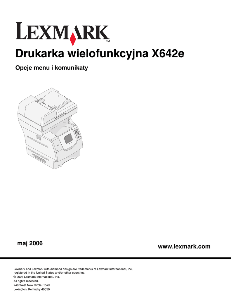 Drukarka wielofunkcyjna X642e Opcje menu i komunikaty maj 2006 Lexmark and Lexmark with diamond design are trademarks of Lexmark International, Inc., registered in the United States and/or other countries. © 2006 Lexmark International, Inc. All rights reserved. 740 West New Circle Road Lexington, Kentucky 40550 www.lexmark.com Edition: May 2006 The following paragraph does not apply to any country where such provisions are inconsistent with local law: LEXMARK INTERNATIONAL, INC., PROVIDES THIS PUBLICATION “AS IS” WITHOUT WARRANTY OF ANY KIND, EITHER EXPRESS OR IMPLIED, INCLUDING, BUT NOT LIMITED TO, THE IMPLIED WARRANTIES OF MERCHANTABILITY OR FITNESS FOR A PARTICULAR PURPOSE. Some states do not allow disclaimer of express or implied warranties in certain transactions; therefore, this statement may not apply to you. This publication could include technical inaccuracies or typographical errors. Changes are periodically made to the information herein; these changes will be incorporated in later editions. Improvements or changes in the products or the programs described may be made at any time. Comments about this publication may be addressed to Lexmark International, Inc., Department F95/032-2, 740 West New Circle Road, Lexington, Kentucky 40550, U.S.A. In the United Kingdom and Eire, send to Lexmark International Ltd., Marketing and Services Department, Westhorpe House, Westhorpe, Marlow Bucks SL7 3RQ. Lexmark may use or distribute any of the information you supply in any way it believes appropriate without incurring any obligation to you. To obtain additional copies of publications related to this product, visit the Lexmark Web site at www.lexmark.com. References in this publication to products, programs, or services do not imply that the manufacturer intends to make these available in all countries in which it operates. Any reference to a product, program, or service is not intended to state or imply that only that product, program, or service may be used. Any functionally equivalent product, program, or service that does not infringe any existing intellectual property right may be used instead. Evaluation and verification of operation in conjunction with other products, programs, or services, except those expressly designated by the manufacturer, are the user’s responsibility. Lexmark and Lexmark with diamond design, MarkNet, MarkTrack, and MarkVision are trademarks of Lexmark International, Inc., registered in the United States and/or other countries. PCL® is a registered trademark of the Hewlett-Packard Company. The following terms are trademarks or registered trademarks of these companies: Albertus The Monotype Corporation plc ITC Lubalin Graph International Typeface Corporation Antique Olive Monsieur Marcel OLIVE ITC Mona Lisa International Typeface Corporation Apple-Chancery Apple Computer, Inc. ITC Zapf Chancery International Typeface Corporation Arial The Monotype Corporation plc Joanna The Monotype Corporation plc CG Times Based on Times New Roman under license from The Monotype Corporation plc, is a product of Agfa Corporation Marigold Arthur Baker Chicago Apple Computer, Inc. Monaco Apple Computer, Inc. Clarendon Linotype-Hell AG and/or its subsidiaries New York Apple Computer, Inc. Eurostile Nebiolo Oxford Arthur Baker Geneva Apple Computer, Inc. Palatino Linotype-Hell AG and/or its subsidiaries GillSans The Monotype Corporation plc Stempel Garamond Linotype-Hell AG and/or its subsidiaries Helvetica Linotype-Hell AG and/or its subsidiaries Taffy Agfa Corporation Hoefler Jonathan Hoefler Type Foundry Times New Roman The Monotype Corporation plc ITC Avant Garde Gothic International Typeface Corporation Univers Linotype-Hell AG and/or its subsidiaries ITC Bookman International Typeface Corporation © 2006 Lexmark International, Inc. All rights reserved. UNITED STATES GOVERNMENT RIGHTS This software and any accompanying documentation provided under this agreement are commercial computer software and documentation developed exclusively at private expense. 2 Spis treści Rozdział 1: Korzystanie z menu drukarki wielofunkcyjnej ............................................. 5 Informacje o panelu operacyjnym drukarki wielofunkcyjnej ............................................................................. 5 Strona główna ........................................................................................................................................... 8 Korzystanie z przycisków dotykowych na wyświetlaczu LCD ........................................................................ 12 Przykładowy ekran nr 1 .......................................................................................................................... 12 Przykładowy ekran nr 2 .......................................................................................................................... 12 Przykładowy ekran nr 3 .......................................................................................................................... 13 Informacje dotyczące przycisków dotykowych wyświetlanych na ekranie LCD ..................................... 14 Inne przyciski dotykowe na wyświetlaczu LCD ....................................................................................... 16 Funkcje ................................................................................................................................................... 17 Menu .............................................................................................................................................................. 18 Mapa menu ............................................................................................................................................. 18 Menu papieru ................................................................................................................................................. 19 Domyślne źródło ........................................