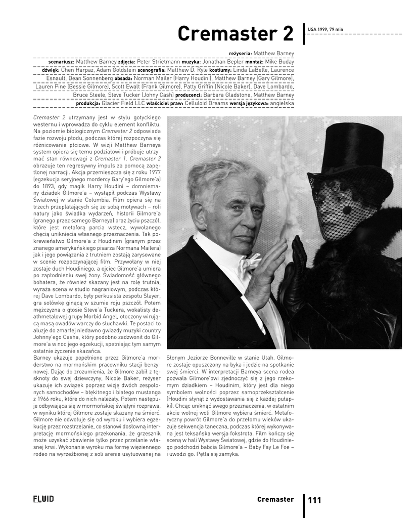 Cremaster 2 USA 1999, 79 min reżyseria: Matthew Barney scenariusz: Matthew Barney zdjęcia: Peter Strietmann muzyka: Jonathan Bepler montaż: Mike Buday dźwięk: Chen Harpaz, Adam Goldstein scenografia: Matthew D. Ryle kostiumy: Linda LaBelle, Laurence Esnault, Dean Sonnenberg obsada: Norman Mailer (Harry Houdini), Matthew Barney (Gary Gilmore), Lauren Pine (Bessie Gilmore), Scott Ewalt (Frank Gilmore), Patty Griffin (Nicole Baker), Dave Lombardo, Bruce Steele, Steve Tucker (Johny Cash) producenci: Barbara Gladstone, Matthew Barney produkcja: Glacier Field LLC właściciel praw: Celluloid Dreams wersja językowa: angielska Cremaster 2 utrzymany jest w stylu gotyckiego westernu i wprowadza do cyklu element konfliktu. Na poziomie biologicznym Cremaster 2 odpowiada fazie rozwoju płodu, podczas której rozpoczyna się różnicowanie płciowe. W wizji Matthew Barneya system opiera się temu podziałowi i próbuje utrzymać stan równowagi z Cremaster 1. Cremaster 2 obrazuje ten regresywny impuls za pomocą zapętlonej narracji. Akcja przemieszcza się z roku 1977 (egzekucja seryjnego mordercy Gary’ego Gilmore’a) do 1893, gdy magik Harry Houdini – domniemany dziadek Gilmore’a – wystąpił podczas Wystawy Światowej w stanie Columbia. Film opiera się na trzech przeplatających się ze sobą motywach – roli natury jako świadka wydarzeń, historii Gilmore’a (granego przez samego Barneya) oraz życiu pszczół, które jest metaforą parcia wstecz, wywołanego chęcią uniknięcia własnego przeznaczenia. Tak pokrewieństwo Gilmore’a z Houdinim (granym przez znanego amerykańskiego pisarza Normana Mailera) jak i jego powiązania z trutniem zostają zarysowane w scenie rozpoczynającej film. Przywołany w niej zostaje duch Houdiniego, a ojciec Gilmore’a umiera po zapłodnieniu swej żony. Świadomość głównego bohatera, że również skazany jest na rolę trutnia, wyraża scena w studio nagraniowym, podczas której Dave Lombardo, były perkusista zespołu Slayer, gra solówkę ginącą w szumie roju pszczół. Potem mężczyzna o głosie Steve’a Tuckera, wokalisty deathmetalowej grupy Morbid Angel, otoczony wirującą masą owadów warczy do słuchawki. Te postaci to aluzje do zmarłej niedawno gwiazdy muzyki country Johnny’ego Casha, który podobno zadzwonił do Gilmore’a w noc jego egzekucji, spełniając tym samym ostatnie życzenie skazańca. Barney ukazuje popełnione przez Gilmore’a morderstwo na mormońskim pracowniku stacji benzynowej. Dając do zrozumienia, że Gilmore zabił z tęsknoty do swej dziewczyny, Nicole Baker, reżyser ukazuje ich związek poprzez wizję dwóch zespolonych samochodów – błękitnego i białego mustanga z 1966 roku, które do nich należały. Potem następuje odbywająca się w mormońskiej świątyni rozprawa, w wyniku której Gilmore zostaje skazany na śmierć. Gilmore nie odwołuje się od wyroku i wybiera egzekucję przez rozstrzelanie, co stanowi dosłowną interpretację mormońskiego przekonania, że grzesznik może uzyskać zbawienie tylko przez przelanie własnej krwi. Wykonanie wyroku ma formę więziennego rodeo na wyrzeźbionej z soli arenie usytuowanej na Słonym Jeziorze Bonneville w stanie Utah. Gilmore zostaje opuszczony na byka i jedzie na spotkanie swej śmierci. W interpretacji Barneya scena rodea pozwala Gilmore’owi zjednoczyć się z jego rzekomym dziadkiem – Houdinim, który jest dla niego symbolem wolności poprzez samoprzekształcenie (Houdini słynął z wydostawania się z każdej pułapki). Chcąc uniknąć swego przeznaczenia, w ostatnim akcie wolnej woli Gilmore wybiera śmierć. Metaforyczny powrót Gilmore’a do przełomu wieków ukazuje sekwencja taneczna, podczas której wykonywana jest teksańska wersja fokstrota. Film kończy się sceną w hali Wystawy Światowej, gdzie do Houdiniego podchodzi babcia Gilmore’a – Baby Fay Le Foe – i uwodzi go. Pętla się zamyka. Cremaster 111