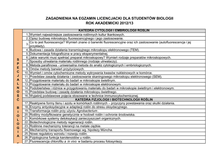 ZAGADNIENIA NA EGZAMIN LICENCJACKI DLA STUDENTÓW BIOLOGII ROK AKADEMICKI 2012/13 1. 2. 3. S P E C J A L N O Ś Ć B I O L O G I A E 4. 5. 6. 7. 8. 9. 10. 11. 12. 13. 14. 15. 16. 17. 18. 19. 20. 21. 22. 23. 24. 25. 26. 27. KATEDRA CYTOLOGII I EMBRIOLOGII ROŚLIN Wymień najważniejsze zastosowania roślinnych kultur tkankowych. Opisz budowę mikroskopu fluorescencyjnego i jego zastosowanie. Co to jest fluorescencja? Wymień znane ci barwniki fluorescencyjne oraz ich zastosowanie (autofluorescencja i jej przykłady). Budowa i zasada działania transmisyjnego mikroskopu elektronowego (TEM). Dokumentacja fotograficzna w pracy eksperymentalnej. Jakie warunki musi spełniać preparat mikroskopowy? Wymień rodzaje preparatów mikroskopowych. Sposoby utrwalania materiału roślinnego (rodzaje utrwalaczy). Metoda parafinowa - uniwersalna metoda do analiz cytologicznych i embriologicznych. Omów metody barwień przyżyciowych. Wymień i omów cytochemiczne metody wykrywania kwasów nukleinowych w komórce. Przedstaw zasadę działania i zastosowanie skaningowego mikroskopu elektronowego (SEM). Przygotowanie materiału do badań w mikroskopie świetlnym. Przygotowanie materiału do badań w mikroskopie elektronowym. Podobieństwa i różnice w przygotowaniu materiału do badań w mikroskopie świetlnym i elektronowym. Przedstaw budowę i zasadę działania mikroskopu świetlnego. Wyjaśnij podstawowe pojęcia stosowane w technice immunocytochemicznej. KATEDRA FIZJOLOGII I BIOTECHNOLOGII ROŚLIN Reaktywne formy tlenu i azotu w komórkach roślinnych – przyczyny powstawania oraz skutki działania. Enzymy antyoksydacyjne w adaptacji roślin do stresu oksydacyjnego. Transformacja roślin przy użyciu Agrobacterium . Rośliny modyfikowane genetycznie w hodowli roślin i ochronie środowiska. Komórkowe systemy detoksykacji zanieczyszczeń organicznych. Biotechnologiczne metody regeneracji roślin. Roślinne mechanizmy tolerancji na metale ciężkie. Mechanizmy transportu floemowego wg. hipotezy Müncha. Nowe regulatory wzrostu i rozwoju roślin. Fizjologiczna funkcja karotenoidów u roślin. Fluorescencja chlorofilu a in vivo w badaniu procesu fotosyntezy. E K S P E R Y M E N T A L N A 28. 29. 30. 31. 32. 33. 34. 35. 36. 37. 38. 39. 40. 41. 42. 43. 44. 45. 46. 47. 48. 1. 2. 3. Mechanizmy dostosowawcze roślin do warunków suszy. ABA i etylen – hormony stresu. Mechanizmy dostosowawcze roślin do stresu termicznego. Organizmy wskaźnikowe w badaniach toksykologicznych. Anhydraza węglanowa w komórkach roślin – miejsce występowania, budowa i funkcja KATEDRA FIZJOLOGII ZWIERZĄT I CZŁOWIEKA Wymień i krótko scharakteryzuj znane Ci testy behawioralne stosowane w neurobiologii. Omów metodę stereotaksji mózgowej. Metody manipulacyjne oraz metody pomiarowe stosowane do oceny czynności mózgu. Omów metodę izotopową stosowaną do oceny aktywności komórek natural killer (NK). Na czym polega i do czego służy metoda cytometrii przepływowej. Współczesna definicja stresu. Osobnicza wrażliwość na stres. Scharakteryzuj zasadę działania stymulatora prądowego i stymulatora napięciowego. Układ mezolimbiczny - nagradzające działanie dopaminy, ryzyko uzależnień. Wskaźniki i cechy reakcji stresowej. Eksperymentalne metody wywoływania reakcji stresowej. Charakterystyka wolnofalowej i paradoksalnej fazy snu. Charakterystyka i możliwości metody elektroencefalografii. Omów apetytywne i awersyjne odruchy instrumentalne. Wpływ środków farmakologicznych na zachowanie. Mapowanie czynnościowe mózgu przy użyciu genów wczesnej odpowiedzi komórkowej. Dokonaj analizy porównawczej zwierząt podzielonych na osobniki o wysokiej i niskiej aktywności lokomotorycznej (HR i LR) oraz dominujące i podporządkowane. KATEDRA BIOCHEMII Co to są wektory w inżynierii genetycznej? Jakie cechy powinien posiadać dobry wektor? O czym należy pamiętać klonując geny pochodzenia eukariotycznego w bakteryjnych systemach ekspresyjnych? Na czym polega selekcja rekombinantów oparta na teście alfa komplementacji? 4. Nadprodukcja białek w bakteryjnym systemie ekspresyjnym wykorzystującym polimerazę RNA faga T7 (wektory pET). 5. Zasada rozdziału białek w żelu poliakryloamidowym w warunkach denaturujących. 6. Immunodetekcja bialek z zastosowaniem techniki Western blotting, w tym różne sposoby detekcji kompleksu antygenprzeciwciało. 7. S P E C J A L N O Ś Ć B I O L O G I A M O L E K U L A 8. 9. 10. 11. 12. 13. 14. 15. 16. 17. 18. 19. 20. 21. 22. 23. 24. 25. 26. 27. 28. 29. 30. 31. 32. 33. 34. 35. Oczyszczanie bialek fuzyjnych z peptydem histydynowym metodą chromatografii powinowactwowej IMAC (immobilizedmetal affinity chromatography). Oczyszczanie białek metoda chromatografii jonowymiennej oraz sączenia molekularnego (zasady rozdziału, rodzaje i klasyfikacja złóż). Synteza i zwijanie białek w komórce. Enzymy – sposoby regulacji ich aktywności. W jakich dziedzinach naszego życia znalazła zastosowanie inżynieria genetyczna? Uzyskiwanie energii w komórce w warunkach beztlenowych i tlenowych. KATEDRA BIOLOGII MOLEKULARNEJ Proces rekombinacji genetycznej i jego znaczenie Replikacja DNA w komórkach eukariotycznych Przykłady regulacji ekspresji genów u Eukaryota Bakteriofagi- charakterystyka i cykle rozwojowe Porównanie genów prokariotycznych i eukariotycznych Technika PCR i jej wykorzystanie Mutageny i procesy powstawania mutacji Procesy naprawy DNA Potranskrypcyjna modyfikacja RNA Zjawisko apoptozy i jego znaczenie Charakterystyka mitochondrialnego DNA Budowa chromosomów eukariotycznych KATEDRA GENETYKI Mitochondrialny DNA; zastosowanie w badaniach genetyczno-populacyjnych Mikrosatelitarny DNA; zastosowanie w badaniach genetyczno-populacyjnych Markery genetyczne w badaniach bioróżnorodności Polimorfizm SNP – zastosowanie w badaniach genetycznych Barcoding – podstawy idei, zalety, ograniczenia Filogeografia – założenia, znaczenie wnioskowania Analizy DNA; znaczenie w o