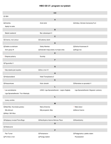 HBO OD 27. program na tydzień 0-9 1864 A Amerika Anioł stróż Antboy: Zemsta Czerwonej Furii Apetyt na seks B Babski weekend Bez zobowiązań II C Cinema, mon amour Cudowny dzień D Daleko za słońcem Dobry Niemiec Dolina Krzemowa III Dom grozy III Dzieciaki mojej siostry na tropie złota Długa noc E Ekspres polarny Eurotrip F Figurantka V G Gdy stawka jest wysoka Gra o tron VI H Hollywoodland Hotel Transylwania 2 K Kieszonkowe Kolor zbrodni Kłamstwa na sprzedaż V L Las samobójców LEGO: Liga Sprawiedliwości - Legion Zagłady Liga Sprawiedliwości: Bogowie i potwory Liga Sprawiedliwości: Tron Atlantydy Ł Łowcy zombie M Mad Max: Na drodze gniewu Maria Antonina Małe dzieci Mój olbrzym Mój przyjaciel, Skip Morze Czarne Motyl. Still Alice N Najlepszy kumpel Pana Boga Nieoficjalna historia Melrose Place Niewidzialny O Okaleczone P Pan Turner Pentameron Pielęgniarka z piekła rodem Po Grze o tron Pociąg nadziei Pozostawieni Przegląd tygodnia: Wieczór z Johnem Oliverem III R Rozmowy Billa Simmonsa S San Andreas Schmidt Superman: Powrót Szefowie wrogowie 2 Ś Śnieżne anioły Święta w Conway T Tajemnice Turkey Hollow W Whiplash Więzy życia Wszyscy ludzie króla