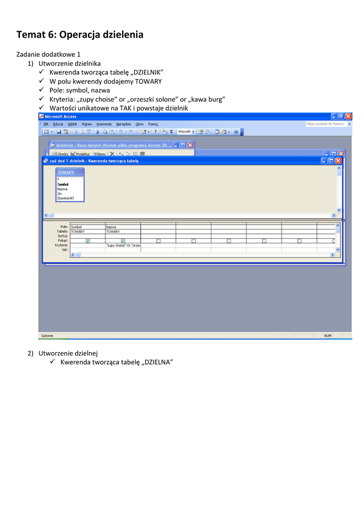 Temat 6: Operacja dzielenia Zadanie dodatkowe 1 1) Utworzenie dzielnika Kwerenda tworząca tabelę „DZIELNIK” W polu kwerendy dodajemy TOWARY Pole: symbol, nazwa Kryteria: „zupy choise” or „orzeszki solone” or „kawa burg” Wartości unikatowe na TAK i powstaje dzielnik 2) Utworzenie dzielnej Kwerenda tworząca tabelę „DZIELNA” Wartości unikatowe na TAK i powstaje dzielna 3) Iloczyn kartezjaoski 4) Kwerenda usuwająca Rekordy unikatowe na TAK 5) kwerenda usuwająca łączymy tylko po kodzie 6) kwerenda wybierająca łączymy po kodzie rekordy unikatowe na TAK Zadanie dodatkowe 2 1) dzielnik 2) dzielna 3) iloczyn kartezjaoski 4) kwerenda usuwająca 5) kwerenda usuwająca 6) kwerenda wybierająca MAKRO Akcja: Otwórz kwerendę Nazwa kwerendy-> wybieramy po kolei wszystkie kwerendy, które używaliśmy do dzielenia i POWINIEN wyjśd nam wynik naszego dzielenia Żeby nie było ostrzeżeo trzeba na początku ( w pierwszym wierszu) wstawid Ustaw Ostrzeżenia na NIE i nie będzie nam wyświetlały ostrzeżenia