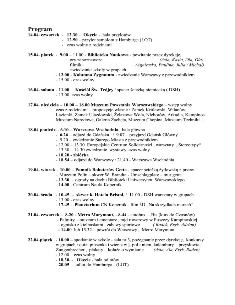 Program 14.04. czwartek - 12.30 – Okęcie - hala przylotów - 12.50 – przylot samolotu z Hamburga (LOT) - czas wolny z rodzinami 15.04. piatek - 9.00 – 11.00 - Biblioteka Naukowa - powitanie przez dyrekcję, gry zapoznawcze (Asia, Kasia, Ola, Ola) filmiki (Agnieszka, Paulina, Julia / Michał) zwiedzanie szkoły w grupach - 12.00 - Kolumna Zygmunta - zwiedzanie Warszawy z przewodnikiem - 15.00 - czas wolny 16.04. sobota - 11.00 – Kościół Św. Trójcy / spacer ścieżką niemiecką ( DSH) - 13.00 czas wolny 17.04. niedziela – 10.00 – 18.00 Muzeum Powstania Warszawskiego – wstęp wolny czas z rodzinami – propozycje własne : Zamek Królewski, Wilanów, Łazienki, Zamek Ujazdowski, Żelazowa Wola, Nieborów, Arkadia, Kampinos Muzeum Narodowe, Galeria Zacheta, Muzeum Chopina, Muzeum Techniki … 18.04 poniedz – 6.10 – Warszawa Wschodnia, hala główna - 6.26 – odjazd do Gdańska / 9.07 – przyjazd Gdańsk Główny - 9.20 – zwiedzanie Starego Miasta z przewodnikiem - 12.00 – 13.30 Europejskie Centrum Solidarności , warsztaty „Stereotypy“ - 13.30 – 14.30 zwiedzanie wystawy, czas wolny - 18.20 - zbiórka - 18.54 – odjazd do Warszawy / 21.40 - Warszawa Wschodnia 19.04. wtorek – 10.00 – Pomnik Bohaterów Getta - spacer ścieżką żydowską z przew. – Muzeum Polin – skwer W. Brandta - Umschlagplatz – mur getta - 13.30 – ogrody na dachu Biblioteki Uniwersytetu Warszawskiego - 14.00 - Centrum Nauki Kopernik 20.04. środa - 10.45 – skwer k. Hotelu Bristol, / 11.00 - DSH warsztaty w grupach - 13.00 - czas wolny - 17.45 - Planetarium CN Kopernik - film 3D „Na skrzydłach marzeń“ 21.04. czwartek – 8.20 - Metro Marymont, - 8.44 - autobus – Bis (kurs do Czosnów) - Palmiry – muzeum i cmentarz , rajd rowerowy w Puszczy Kampinoskiej - ognisko z kiełbaskami , zabawy sportowe ( Radek, Eryk, Adrian) - 14.00 lub 15.32 – powrót do Warszawy , Metro Marymont 22.04.piątek - 10.00 – spotkanie w szkole - sala nr 3, pożegnanie przez dyrekcję, konkursy w grupach : quiz, piosenka i wiersz w j. pol i niem, kalambury – przysłowia, Zungenbrecher , plakaty – kolaże o wymianie (Asia, Ala, Eryk, Radek) - 12.00 – czas wolny - 18.30. - Okęcie - hala odlotów - 20.05 - odlot do Hamburga - (LOT)