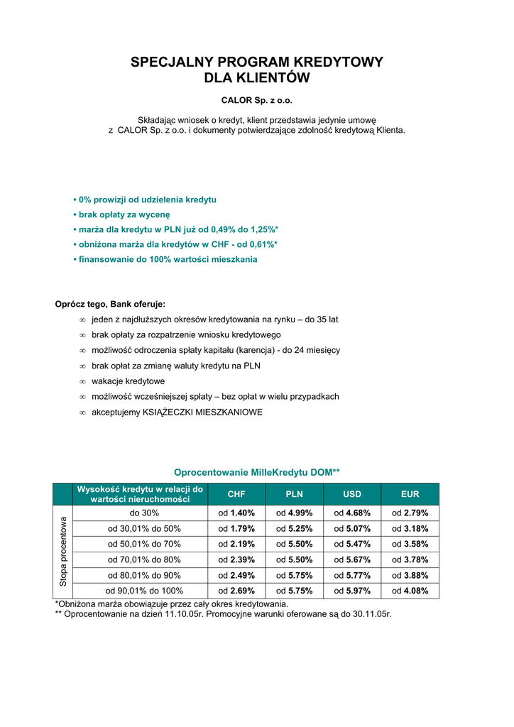 SPECJALNY PROGRAM KREDYTOWY DLA KLIENTÓW CALOR Sp. z o.o. Składając wniosek o kredyt, klient przedstawia jedynie umowę z CALOR Sp. z o.o. i dokumenty potwierdzające zdolność kredytową Klienta. • 0% prowizji od udzielenia kredytu • brak opłaty za wycenę • marża dla kredytu w PLN już od 0,49% do 1,25%* • obniżona marża dla kredytów w CHF - od 0,61%* • finansowanie do 100% wartości mieszkania Oprócz tego, Bank oferuje: • jeden z najdłuższych okresów kredytowania na rynku – do 35 lat • brak opłaty za rozpatrzenie wniosku kredytowego • możliwość odroczenia spłaty kapitału (karencja) - do 24 miesięcy • brak opłat za zmianę waluty kredytu na PLN • wakacje kredytowe • możliwość wcześniejszej spłaty – bez opłat w wielu przypadkach • akceptujemy KSIĄŻECZKI MIESZKANIOWE Oprocentowanie MilleKredytu DOM** Stopa procentowa Wysokość kredytu w relacji do wartości nieruchomości CHF PLN USD EUR do 30% od 1.40% od 4.99% od 4.68% od 2.79% od 30,01% do 50% od 1.79% od 5.25% od 5.07% od 3.18% od 50,01% do 70% od 2.19% od 5.50% od 5.47% od 3.58% od 70,01% do 80% od 2.39% od 5.50% od 5.67% od 3.78% od 80,01% do 90% od 2.49% od 5.75% od 5.77% od 3.88% od 90,01% do 100% od 2.69% od 5.75% od 5.97% od 4.08% *Obniżona marża obowiązuje przez cały okres kredytowania. ** Oprocentowanie na dzień 11.10.05r. Promocyjne warunki oferowane są do 30.11.05r. W Millennium: • akceptujemy różne źródła dochodów • sfinansujemy Twoje potrzeby mieszkaniowe i pozostałe wydatki (dodatkowe środki na dowolny cel konsumpcyjny) • oferujemy różne plany spłat i atrakcyjne oprocentowanie, dzięki temu raty są naprawdę niskie • spłacimy także Twoje zadłużenie w innych bankach z tytułu kredytów mieszkaniowych lub konsumpcyjnych Dodatkowe korzyści dla posiadaczy kredytów hipotecznych Millennium • • • • • • • • Bezpłatne prowadzenie Millekonta Premium Bezpłatna karta Visa Electron (brak opłat za wydanie i 1. rok użytkowania) Bezpłatna karta kredytową (brak opłat za wydanie i 1. rok użytkowania) Bezpłatne przelewy przez internet (Millenet) i telefon (TeleMillennium) Bezpłatne wypłaty gotówki z bankomatów Millennium i Euronet Bezpłatne zlecenia stałe, polecenia przelewu i płatności za rachunki Rachunek oszczędnościowy MillePremia z oprocentowaniem wyższym od standardowego Dostępność informacji o kredycie w Millenet (szczegóły kredytu, harmonogram i historia spłat) http://www.millenet.pl/
