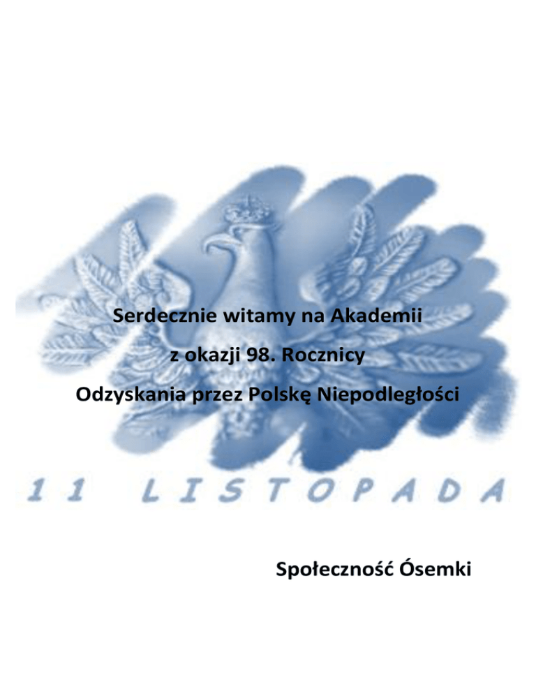 Serdecznie witamy na Akademii z okazji 98. Rocznicy Odzyskania przez Polskę Niepodległości Społeczność Ósemki O mój rozmarynie O mój rozmarynie, rozwijaj się O mój rozmarynie rozwijaj się Pójdę do dziewczyny, pójdę do jedynej Zapytam się. A jak mi odpowie: nie kocham cię, A jak mi odpowie nie kocham cię, Ułani werbują, strzelcy maszerują Zaciągnę się. Dadzą mi konika cisawego Dadzą mi konika cisawego I ostrą szabelkę, i ostrą szabelkę Do boku mego. Dadzą mi kabacik z wyłogami Dadzą mi kabacik z wyłogami I czarne buciki i czarne buciki Z ostrogami Dadzą mi manierkę z gorzałczyną Dadzą mi manierkę z gorzałczyną Ażebym nie tęsknił, ażebym nie tęsknił Za dziewczyną. Pójdziemy z okopów na bagnety, Pójdziemy z okopów na bagnety, Bagnet mnie ukłuje, śmierć mnie ucałuje, Ale nie ty. Rota Nie rzucim ziemi skąd nasz ród! Nie damy pogrześć mowy. Polski my naród, polski lud, Królewski szczep Piastowy. Nie damy, by nas gnębił wróg! Tak nam dopomóż Bóg! Tak nam dopomóż Bóg! Do krwi ostatniej kropli z żył Bronić będziemy ducha, Aż się rozpadnie w proch i w pył Krzyżacka zawierucha. Twierdzą nam będzie każdy próg! Tak nam dopomóż Bóg! Tak nam dopomóż Bóg! Nie będzie Niemiec pluł nam w twarz Ni dzieci nam germanił, Orężny wstanie hufiec nasz, Duch będzie nam hetmanił. Pójdziem, gdy zabrzmi złoty róg! Tak nam dopomóż Bóg! Tak nam dopomóż Bóg! Wojenko, wojenko Wojenko, wojenko, cóżeś ty za pani, Że za tobą idą, że za tobą idą Chłopcy malowani? Chłopcy malowani, sami wybierani, Wojenko, wojenko, wojenko, wojenko, Cóżeś ty za pani? Na wojence ładnie, kto Boga uprosi, Żołnierze strzelają, żołnierze strzelają, Pan Bóg kule nosi. Maszeruje wiara, pot się krwawy leje, Raz dwa stąpaj bracie, raz dwa stąpaj bracie, Bo tak Polska grzeje. Wojenko, wojenko, co za moc jest w tobie? Kogo ty pokochasz, kogo ty pokochasz W zimnym leży grobie. Ten już w grobie leży z dala od rodziny, A za nim pozostał, a za nim pozostał Cichy płacz dziewczyny. Rozkwitały pąki białych róż Rozkwitają pąki białych róż, Wróć, Jasieńku, z tej wojenki już, Wróć, ucałuj, jak za dawnych lat, Dam ci za to róży najpiękniejszy kwiat. Kładłam ci ja idącemu w bój, Białą różę na karabin twój, Nimeś odszedł, mój Jasieńku, stąd, Nimeś próg przestąpił, kwiat na ziemi zwiądł. Ponad stepem nieprzejrzana mgła, Wiatr w burzanach cichuteńko łka. Przyszła zima, opadł róży kwiat, Poszedł w świat Jasieńko, zginął za nim ślad. Już przekwitły pąki białych róż, Przeszło lato, jesień, zima już. Cóż ci teraz dam, Jasieńku, hej, Gdy z wojenki wrócisz do dziewczyny swej. Hej dziewczyno, ułan w boju padł, Choć mu dałaś białej róży kwiat. Czy nieszczery był twej dłoni dar, Czy też może wygasł twego serca żar? W pustym polu zimny wicher dmie, Już nie wróci twój Jasieńko, nie. Śmierć okrutna zbiera krwawy lup, zakopali Jasia twego w ciemny grób. Jasieńkowi nic nie trzeba już, Bo mu kwitną pąki białych róż, Tam pod jarem, gdzie w wojence padł, wyrósł na mogile białej róży kwiat. Pierwsza brygada Legiony to żołnierska nuta Legiony to straceńców los Legiony to żołnierska buta Legiony to ofiarny los! My pierwsza brygada Strzelecka gromada Na stos! Rzuciliśmy swój życia los, Na stos, na stos! O ileż mąk, ileż cierpienia O ileż krwi, przelanych łez, Pomimo to nie ma zwątpienia, Dodawał sił wędrówki kres… My pierwsza brygada Strzelecka gromada Na stos! Rzuciliśmy swój życia los, Na stos, na stos! Mówili żeśmy stumanieni Nie wierząc w to że chcieć to móc! Leliśmy krew osamotnieni A z nami był nasz drogi wódz! My pierwsza brygada Strzelecka gromada Na stos! Rzuciliśmy swój życia los, Na stos, na stos! Przybyli ułani pod okienko Przybyli ułani pod okienko, (bis) Pukają, wołają: „puść panienko!”(bis) Zaświecił miesiączek do okienka, W koszulce stanęła w nim panienka. „O Jezu, a cóż to za wojacy?” „Otwieraj! Nie bój się to czwartacy!” „O Jezu! A dokąd Bóg prowadzi?” „Warszawę odwiedzić byśmy radzi. Gdy zwiedzim Warszawę, już nam pilno Zobaczyć to stare nasze Wilno. A z Wilna już droga jest gotowa, Prowadzi prościutko aż do Lwowa.” „O Jezu, a cóż to za mizeria?” „Otwórz no, panienko! Kawaleria. Przyszliśmy napoić nasze konie, Za nami piechoty pełne błonie.” „O Jezu! A cóż to za hołota?” „Otwórz panienko! To piechota!” Panienka otwierać podskoczyła, Żołnierzy do środka zaprosiła. Pierwsza kadrowa Raduje się serce, raduje się dusza, Gdy pierwsza kadrowa na wojenkę rusza. Oj da, oj da dana, kampanio kochana, Nie ma to jak pierwsza, nie. Chociaż do Warszawy długa mamy drogę, Ale przejdziem migiem, byle tylko w nogę. Oj da ... Chociaż w butach dziury, na mundurach łaty, To pierwsza kadrowa, pójdzie na armaty. Oj da ... Narratorzy: Zuzanna Jarocka, Alicja Miękus Recytatorzy: Anna Gewert, Michał Lindner, Miłosz Żyto, Zofia Rybicka, Martyna Szczurek, Mateusz Bogacz, Zuzanna Lew, Julia Lis, Mikołaj Kubiak, Oliwia Szcegóra Chór szkolny oraz soliści: Mateusz Górny, Natan Krupa, Zofia Rybicka, Martyna Szczurek Montaż słowno – muzyczny: Agnieszka Ryba, Edyta Gąsiorkiewicz Oprawa wokalna: Aleksandra Snela – Brodziak Dekoracje: Maria Augustyniak