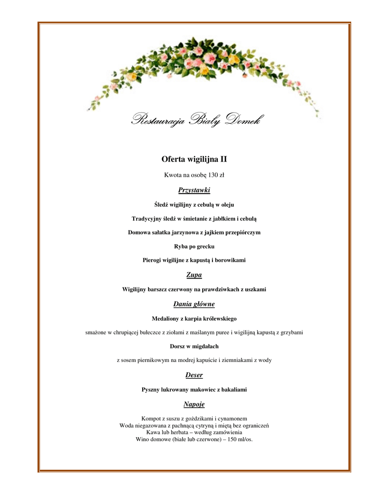 Restauracja Biały Domek Oferta wigilijna II Kwota na osobę 130 zł Przystawki Śledź wigilijny z cebulą w oleju Tradycyjny śledź w śmietanie z jabłkiem i cebulą Domowa sałatka jarzynowa z jajkiem przepiórczym Ryba po grecku Pierogi wigilijne z kapustą i borowikami Zupa Wigilijny barszcz czerwony na prawdziwkach z uszkami Dania główne Medaliony z karpia królewskiego smażone w chrupiącej bułeczce z ziołami z maślanym puree i wigilijną kapustą z grzybami Dorsz w migdałach z sosem piernikowym na modrej kapuście i ziemniakami z wody Deser Pyszny lukrowany makowiec z bakaliami Napoje Kompot z suszu z gożdzikami i cynamonem Woda niegazowana z pachnącą cytryną i miętą bez ograniczeń Kawa lub herbata – według zamówienia Wino domowe (białe lub czerwone) – 150 ml/os. Pozostałe napoje ,alkohol,kawa, herbata będą doliczone wg spożycia Powyższe menu jest jedynie propozycją, którą jesteśmy w stanie modyfikować wedle Państwa potrzeb i sugesti. Dzieci do 3 roku życia mają zapewnione miejsce przy stole nieodpłatnie. Starszym dzieciom proponujemy specjalne menu dla dzieci. Z przyjemnością zorganizujemy Państwu wymarzone przyjęcie i zadbamy, aby chwile spędzone w Restauracji Biały Domek były wyjątkowe.