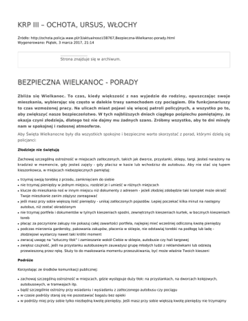 KRP III – OCHOTA, URSUS, WŁOCHY Źródło: http://ochota.policja.waw.pl/r3/aktualnosci/38767,Bezpieczna-Wielkanoc-porady.html Wygenerowano: Piątek, 3 marca 2017, 21:14 Strona znajduje się w archiwum. BEZPIECZNA WIELKANOC - PORADY Zbliża się Wielkanoc. To czas, kiedy większość z nas wyjedzie do rodziny, opuszczając swoje mieszkania, wybierając się często w dalekie trasy samochodem czy pociągiem. Dla funkcjonariuszy to czas wzmożonej pracy. Na ulicach miast pojawi się więcej patroli policyjnych, a wszystko po to, aby zwiększyć nasze bezpieczeństwo. W tych najbliższych dniach ciągłego pośpiechu pamiętajmy, że okazja czyni złodzieja, dlatego też nie dajmy mu żadnych szans. Zróbmy wszystko, aby te dni minęły nam w spokojnej i radosnej atmosferze. Aby Święta Wielkanocne były dla wszystkich spokojne i bezpieczne warto skorzystać z porad, którymi dzielą się policjanci: Złodzieje nie świętują Zachowaj szczególną ostrożność w miejscach zatłoczonych, takich jak dworce, przystanki, sklepy, targi. Jesteś narażony na kradzież w momencie, gdy jesteś zajęty - gdy płacisz w kasie lub wchodzisz do autobusu. Aby nie stać się łupem kieszonkowca, w miejscach niebezpiecznych pamiętaj: ● trzymaj swoją torebkę z przodu, zamknięciem do siebie ● nie trzymaj pieniędzy w jednym miejscu, rozdziel je i umieść w różnych miejscach ● klucze do mieszkania noś w innym miejscu niż dokumenty z adresem - jeżeli złodziej zdobędzie taki komplet może okraść Twoje mieszkanie zanim zdążysz zareagować ● jeśli masz przy sobie większą ilość pieniędzy - unikaj zatłoczonych pojazdów. Lepiej poczekać kilka minut na następny autobus, niż zostać okradzionym ● nie trzymaj portfela i dokumentów w tylnych kieszeniach spodni, zewnętrznych kieszeniach kurtek, w bocznych kieszeniach toreb ● płacąc za poczynione zakupy nie pokazuj całej zawartości portfela, najlepiej mieć wcześniej odliczoną kwotę pieniędzy ● podczas mierzenia garderoby, pakowania zakupów, płacenia w sklepie, nie odstawiaj torebki na podłogę lub ladę złodziejowi wystarczy nawet taki krótki moment ● zwracaj uwagę na "sztuczny tłok" i zamieszanie wokół Ciebie w sklepie, autobusie czy hali targowej ● zwiększ czujność, jeśli na przystanku autobusowym zauważysz grupę młodych ludzi z reklamówkami lub odzieżą przewieszoną przez rękę. Służy to do maskowania momentu przeszukiwania, być może właśnie Twoich kieszeni Podróże Korzystając ze środków komunikacji publicznej: ● zachowaj szczególną ostrożność w miejscach, gdzie występuje duży tłok: na przystankach, na dworcach kolejowych, autobusowych, w tramwajach itp. ● bądź szczególnie ostrożny przy wsiadaniu i wysiadaniu z zatłoczonego autobusu czy pociągu ● w czasie podróży staraj się nie pozostawiać bagażu bez opieki ● w podróży miej przy sobie tylko niezbędną kwotę pieniędzy. Jeśli masz przy sobie większą kwotę pieniędzy nie trzymajmy jej w jednym miejscu. Zmniejsza to ryzyko ewentualnej utraty całej gotówki ● w środkach komunikacji publicznej siadaj blisko kierowcy lub grupy ludzi ● w pociągach unikaj pustych przedziałów oraz towarzystwa osób, których wygląd lub zachowanie wzbudza obawy ● bądź czujny, podróżując staraj się nie spać ● jeśli zostaną Ci skradzione dokumenty, karty płatnicze, bagaż lub inne przedmioty pamiętaj, aby jak najszybciej zgłosić ten fakt do najbliższej jednostki Policji Kierując pojazdami: ● przed wyjazdem sprawdź: stan techniczny pojazdu (działanie świateł, sprawność układu hamulcowego i jezdnego), wyposażenie samochodu (trójkąt, gaśnicę), potrzebne dokumenty (prawo jazdy, ubezpieczenie OC oraz ważny dowód rejestracyjny) ● przed podróżą nie spożywaj alkoholu, bądź wypoczęty i wyspany ● zaplanuj sobie trasę podróży oraz bezpieczne miejsca do odpoczynku ● w czasie jazdy korzystaj z pasów bezpieczeństwa oraz fotelików ochronnych, gdy podróżujesz z dziećmi ● dostosuj prędkość jazdy do aktualnie panujących warunków atmosferycznych i drogowych ● zachowaj bezpieczny odstęp od poprzedzającego pojazdu ● pamiętaj o zastosowaniu zasady "ograniczonego zaufania", szczególnie wobec pieszych i kierujących jednośladami - oni nie zawsze są widoczni na drogach ● wyraźnie i odpowiednio wcześniej, w sposób widoczny i zrozumiały dla innych uczestników ruchu, sygnalizuj swoje zamiary na drodze (takie jak manewry wyprzedzania i omijania, zmiany kierunku lub pasa ruchu oraz zatrzymanie i postój) Mieszkanie: ● najlepszym zabezpieczeniem mieszkania jest życzliwy sąsiad. Ty również nim bądź na zasadzie wzajemności! ● przed wyjazdem poproś osoby, do których masz zaufanie - zaprzyjaźnionego sąsiada lub członków rodziny, aby zaopiekowali się Twoim mieszkaniem i stwarzali pozory pobytu właściciela, np. wietrząc mieszkanie, włączając światło wieczorem. Poproś, aby zabierali z wycieraczki gazetki reklamowe oraz listy ze skrzynki pocztowej, gdyż może to być znak, że w mieszkaniu nikogo nie ma ● zabezpiecz mieszkanie, przede wszystkim zamknij drzwi i okna, a w budynkach wolno stojących pamiętaj o zamknięciu okien dachowych i piwnicznych, drzwi garażowych oraz innych pomieszczeń gospodarczych, przez które złodziej może łatwo dostać się do domu ● staraj się podczas swojej nieobecności nie pozostawiać w mieszkaniu wartościowych przedmiotów lub większej gotówki ● pamiętaj o tym, by zakręcić zawory z wodą i gazem ● gdyby po powrocie okazało się, że dokonano włamania do Twojego mieszkania - niczego nie ruszaj i natychmiast powiadom Policję Śmigus Dyngus Zachowania osób niewłaściwie obchodzących zwyczaje wielkanocne, a przede wszystkim „Śmigus Dyngus” (np. wylewanie na przechodniów z wielopiętrowych budynków nadmiernych ilości wody lub zanieczyszczeń oraz rzucanie z wiaduktów na przejeżdż