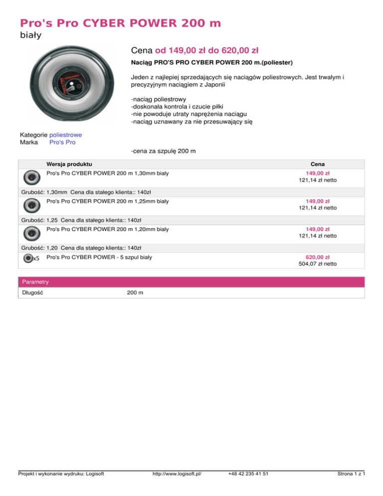 Pro's Pro CYBER POWER 200 m biały Cena od 149,00 zł do 620,00 zł Naciąg PRO'S PRO CYBER POWER 200 m.(poliester) Jeden z najlepiej sprzedających się naciągów poliestrowych. Jest trwałym i precyzyjnym naciągiem z Japonii -naciąg poliestrowy -doskonała kontrola i czucie piłki -nie powoduje utraty naprężenia naciągu -naciąg uznawany za nie przesuwający się Kategorie poliestrowe Marka Pro's Pro -cena za szpulę 200 m Wersja produktu Cena Pro's Pro CYBER POWER 200 m 1,30mm biały 149,00 zł 121,14 zł netto Grubość: 1,30mm Cena dla stałego klienta:: 140zł Pro's Pro CYBER POWER 200 m 1,25mm biały 149,00 zł 121,14 zł netto Grubość: 1,25 Cena dla stałego klienta:: 140zł Pro's Pro CYBER POWER 200 m 1,20mm biały 149,00 zł 121,14 zł netto Grubość: 1,20 Cena dla stałego klienta:: 140zł Pro's Pro CYBER POWER - 5 szpul biały 620,00 zł 504,07 zł netto Parametry Długość Projekt i wykonanie wydruku: Logisoft Powered by TCPDF (www.tcpdf.org) 200 m http://www.logisoft.pl/ +48 42 235 41 51 Strona 1 z 1